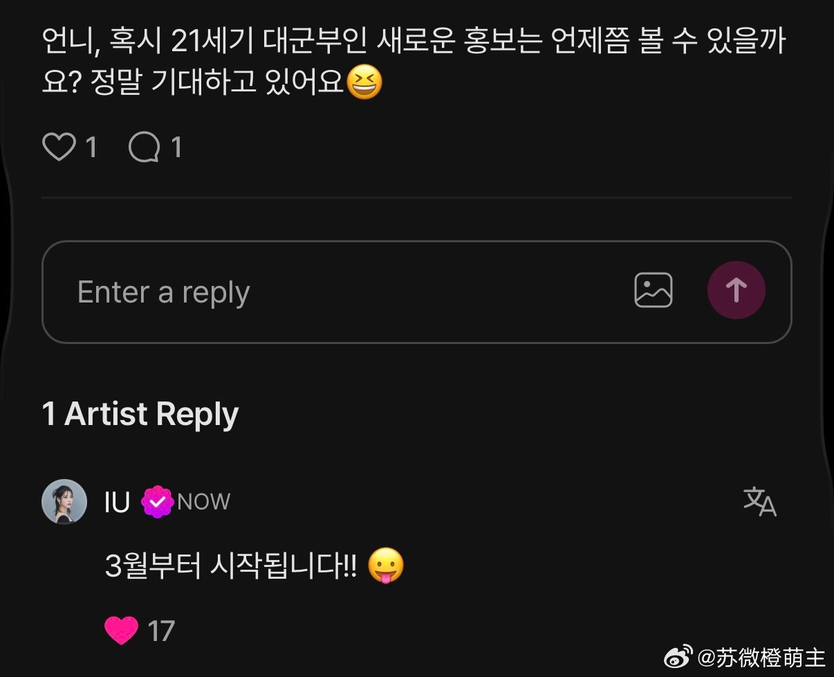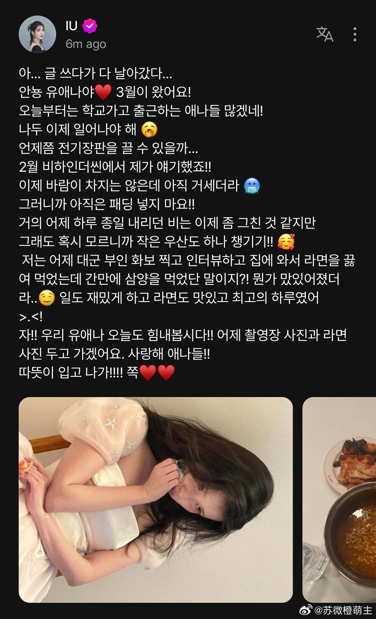 21世纪大君夫人 IU说她昨天给『21世纪大君夫人』拍摄了照片并接受采访~21世纪大君夫人的宣传活动从三月开始!!!iu:啊...写着写着全没了...安宁 亲爱的Uaena们❤3月来啦!从今天开始应该有很多要上学上班的Uaena吧!我也该起床了到底什么时候才能关掉电热毯呢...2月的Behind the Scene里我聊到过!!现在风虽然不刺骨了但还挺猛,所以先别把羽绒服收起来!!昨天几乎下了一整天的雨现在好像停了点,不过以防万一还是带把小雨伞!!我昨天给《大君夫人》拍了画报接受了采访,回家煮了拉面吃,好久没吃三养拉面了呢?!感觉变好吃了..💥工作也很有意思拉面也好吃真是最棒的一天好!!我们Uaena今天也加油吧!!我会留下昨天拍摄现场的照片和拉面照片。我爱你们Uaena!!穿暖和再出门!!!! 姐姐,请问21世纪《大君夫人》的新宣传什么时候能看到呢?真的非常期待😆iu:从3月开始😛