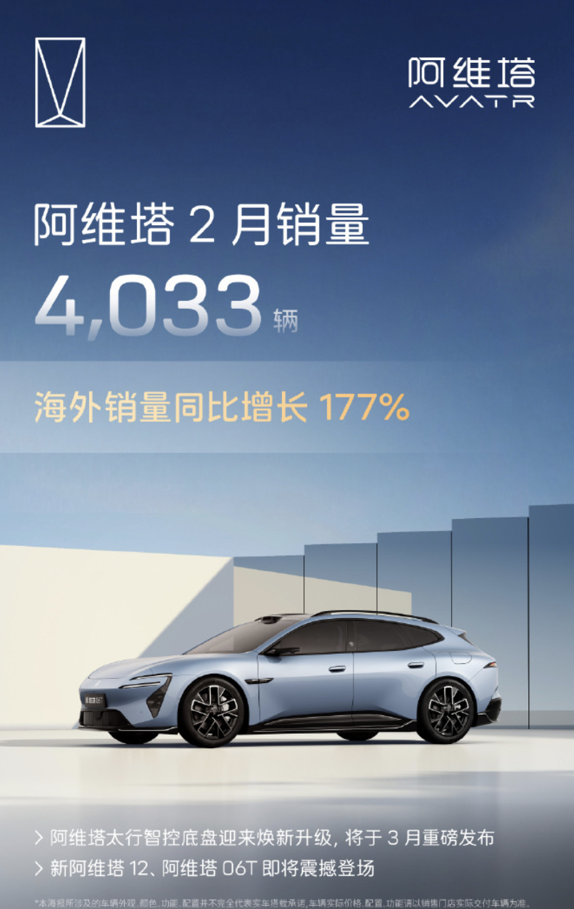 阿维塔2月销量4033辆 海外同比增长177%,全球化步伐加速。太行智控底盘3月焕新升级,新阿维塔12、06T也将上市。