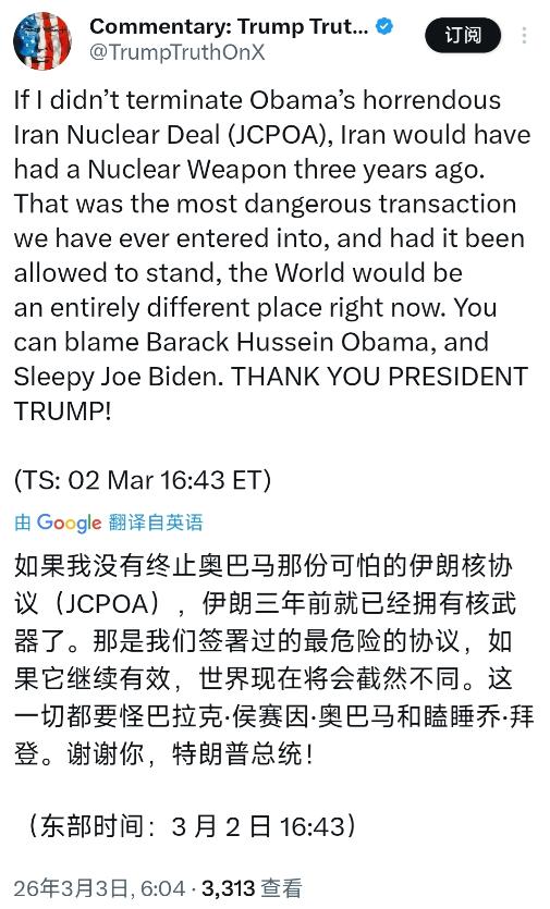特朗普今天(北京时间3月3日)发文写道:“如果我没有终止奥巴马那份可怕的伊朗核协议(JCPOA),伊朗三年前就已经拥有核武器了。那是我们签署过的最危险的协议,如果它继续有效,世界现在将会截然不同。这一切都要怪巴拉克·侯赛因·奥巴马和瞌睡乔·拜登。谢谢你,特朗普总统!” 特朗普3月3日的这番发文把所有争议都聚焦到了2015年签署的伊核协议上,但实际情况和他的表述存在明显出入。 伊核协议(JCPOA)是2015年奥巴马政府联合中、俄、英、法、德等国与伊朗达成的多边共识,核心目标是通过限制伊朗核活动换取国际社会解除对伊制裁。 联合国当时明确认可这份协议的有效性,国际原子能机构也多次证实,协议生效后的数年里,伊朗严格履行了承诺,削减了98%的低浓铀库存,减少了三分之二的离心机数量,铀浓缩丰度被限制在民用所需的3.67%以内,完全符合非核武器国家的标准。 特朗普政府2018年单方面宣布退出伊核协议,这一决定直接打破了原本稳定的核不扩散格局。 退出协议后,美国重启并加码对伊制裁,伊朗为回应制裁逐步暂停履行部分协议义务,开始提升铀浓缩丰度和相关设施运行规模。 即便如此,国际原子能机构的监测报告始终显示,伊朗的核发展进程始终未呈现明确的武器化倾向,更不存在特朗普所说“三年前就已拥有核武器”的事实依据。 2025年美伊重启核谈判后,伊朗在阿曼的斡旋下明确表态,愿意接受“永远不拥有可制造核武器的核材料”的条款,承诺实现核材料“零积累、零库存”,并接受国际原子能机构的全面核查。 这一表态充分说明,伊朗的核计划核心诉求是和平利用核能,而非发展核武器,特朗普所谓“协议继续有效世界将截然不同”的说法缺乏实际支撑。 奥巴马政府推动伊核协议的初衷,是通过外交手段解决核扩散问题,这一多边成果曾被联合国誉为“外交努力的巅峰”。 特朗普将协议称为“最危险的协议”,却忽视了协议存在的争端解决机制和严格的国际核查体系,这些设计恰恰是防范伊朗拥核的关键保障。 拜登政府上台后曾尝试重启协议谈判,但由于各方分歧和美国内部政治博弈,谈判未能取得实质性突破,这一结果并非单一国家的责任,更不能简单归咎于奥巴马和拜登个人。 当前伊朗核问题的复杂局面,根源在于单边主义对多边协议的破坏。2025年10月,联合国安理会第2231号决议到期后,伊朗终止了协议相关限制,但仍坚持遵守《不扩散核武器条约》,多次重申不会寻求发展核武器。 国际原子能机构2026年3月2日的最新声明也显示,伊朗所有核设施均未出现遭到破坏或异常的迹象,核查工作仍在正常推进。 特朗普的发文显然带有强烈的政治表态色彩,却不符合伊核问题的客观全貌。伊核协议的实践已经证明,多边协商、严格核查才是解决核扩散问题的有效途径。 单方面退出协议、动辄实施制裁或军事威慑,只会加剧地区紧张局势,不利于问题的根本解决。国际社会普遍认为,各方应重回多边谈判轨道,通过平等对话重建互信,这才是确保地区和平稳定的正确选择。