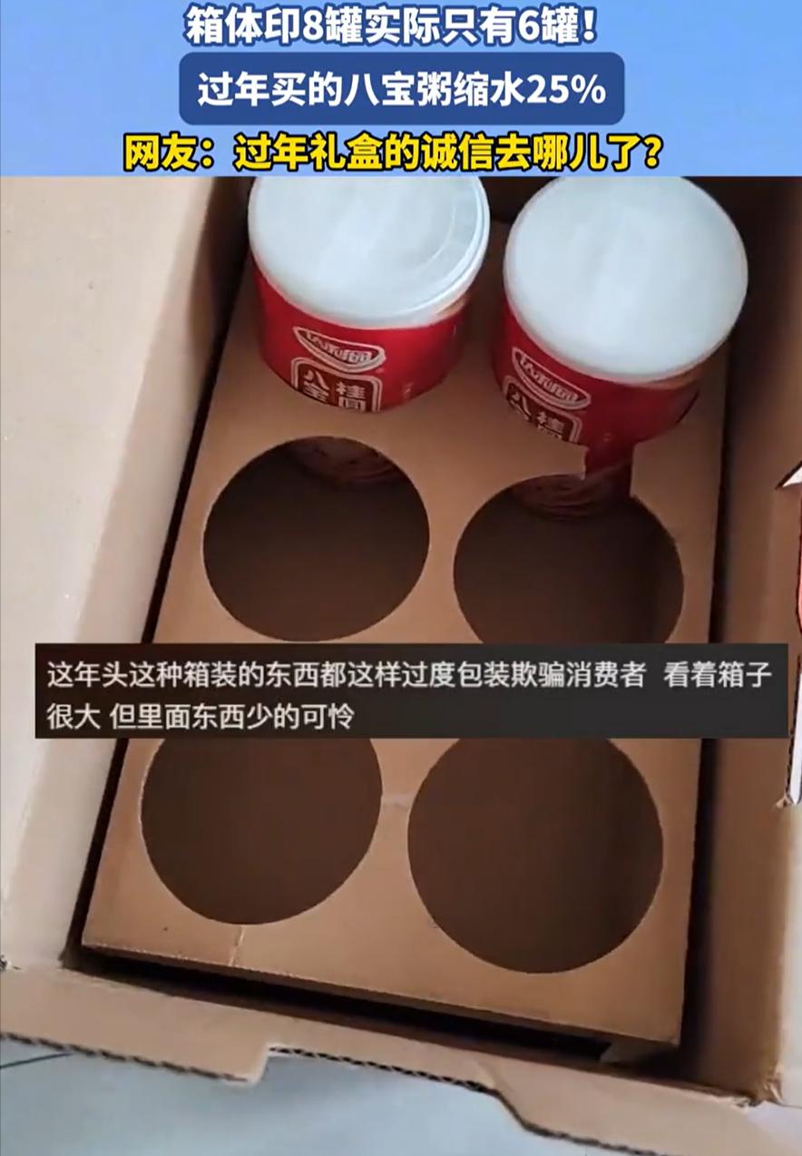 这下事情闹大了!河南,男子在家独自饿了,看到亲戚串门时送来的八宝粥,就想着打开喝一罐,但他却发现,包装上面写着8罐,实际却只有6罐,男子吐槽:过年买的八宝粥缩水25%。网友:退一赔三。 事情发生在河南,时间是2026年春节刚过不久,很多人家里还堆着走亲访友留下的礼品箱,饮料、牛奶、八宝粥一摞一摞放在墙边,暂时吃不完,也懒得拆,这名当事人是个独居的年轻人。 春节期间有几天他没来得及买菜,家里能吃的东西不多,饿了的时候他突然想起亲戚之前送来的一箱八宝粥一直没动过,纸箱外面印着“360克×8罐”,封条还在,看上去很完整。 他当时的想法很简单,八罐粥够顶几顿,他把箱子搬到桌上撕开胶带,打开后第一感觉就不对劲,正常情况下八罐铁罐应该塞得很紧,拿出来时会有重量感和挤压感。 但他伸手一摸,里面明显空了一块,罐子在箱子里晃动,没有装满,他把罐子全部拿出来,摆在桌上数了一遍,不放心又数了一遍,结果都是六个。 包装上清楚写着八罐,实际只有六罐,少了两罐,等于直接少了四分之一,当时他觉得既无语又生气,东西是别人送的礼,包装是完整的,自己也没动过,结果在最需要的时候发现数量对不上。 他拍了视频,把箱子、包装字样和六个罐子都拍清楚,发到网上,视频很快引起关注,很多网友第一反应是商家欺诈。 有人直接引用《消费者权益保护法》第五十五条,认为这属于数量不符,构成欺诈行为,可以“退一赔三”,在网络舆论场里,大家普遍认为标八罐卖六罐,性质很明确。 但也有一些人提出不同看法,他们认为现代食品生产基本是自动化流水线,装罐、封口、装箱都有机械计数和称重环节,正常情况下如果少装两罐,重量差距很明显,设备应该会报警。 要在工厂环节精准少装两罐而不被发现,概率不高,如果真是大批量问题,应该会有更多消费者反馈,而不是个案,这种分析把焦点转向流通环节。 一箱八宝粥从生产出来,到消费者手里,中间要经过批发商、物流、分销商、零售店等多个节点,只要有人在某个环节打开箱子,从每箱里拿走一两罐,再重新封好,就可能造成这种情况。 两罐看起来不多,但如果在大量货物中反复操作,数量累积起来就是整箱甚至整车的货,礼品类商品还有一个特点,很多人收到后不会第一时间拆开检查,而是继续转送给别人。 这样一来,真正发现问题的人往往不是最初购买者,而是最后使用者,链条一旦拉长,追溯来源就变得很困难,这名男子也面临类似尴尬,粥是亲戚送的。 他如果追问“在哪里买的”“是不是买到问题货”,容易让对方误解为在指责,对方可能也是正常购买,并不知道中间发生过什么,为了两罐粥闹得亲戚关系紧张,很多人会选择算了。 从金额上看,两罐八宝粥价值不高。但问题不只是钱,商品外包装标注数量,是最基本的信息承诺,消费者默认包装内的实际数量与标注一致,如果连数量都不能保证,信任就会被削弱。 网络上也有人提到“当面拆封”的做法,过去大家送礼讲究体面,很少当场拆开检查,现在因为担心类似问题,有人建议收到礼品时直接打开确认,这种做法虽然能避免损失,但会让送礼场面变得尴尬。 如果问题出在流通环节,监管难度确实较大,物流节点多,监控不一定覆盖到每个仓储角落,零售终端规模不一,有些小店管理松散,只要有人动了歪心思,拆箱再封并非难事。 尤其是普通纸箱和透明胶带,复原成本很低,这起事件之所以引发讨论,是因为场景很常见,春节礼品几乎家家都有,八宝粥也是常见商品,很多人代入后会产生担忧:自己家里的那几箱会不会也有问题? 一旦这种怀疑扩大,对品牌和渠道都会带来影响,当事人目前能做的,是保留视频和实物,联系销售渠道核实来源,如果能找到购买凭证,可以要求商家解释。 如果商家无法说明原因,按法律途径维权也是权利,但现实中礼品转手多次后,很难找到最初销售方,这件事反映出的核心问题是商品在流通过程中的监管漏洞,以及礼品流转链条过长带来的追责困难。 无论责任最终落在哪个环节,消费者看到的结果就是标注八罐,实际六罐,对普通人来说,最直观的感受只有一个:包装上的数字不再完全可信。