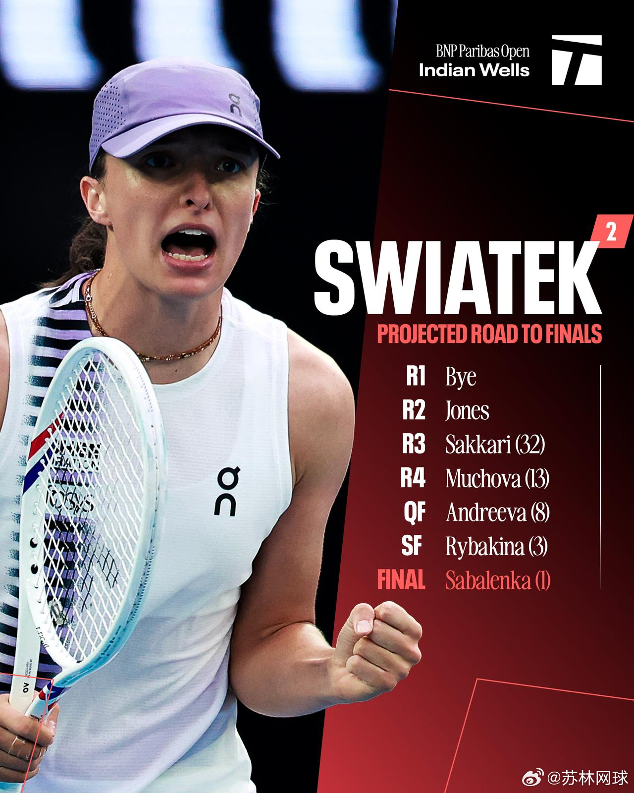 女单世界第一和第二的印第安维尔斯晋级之路◆萨巴伦卡R1,轮空R2,帕克斯R3,约特R4,大坂直美1/4,阿尼西莫娃1/2,高芙决赛,斯瓦泰克◆斯瓦泰克R1,伦空R2,琼斯R3,萨卡里R4,穆霍娃1/4,安德烈娃1/2,莱巴金娜决赛,萨巴伦卡从来没有容易的路。网坛风云