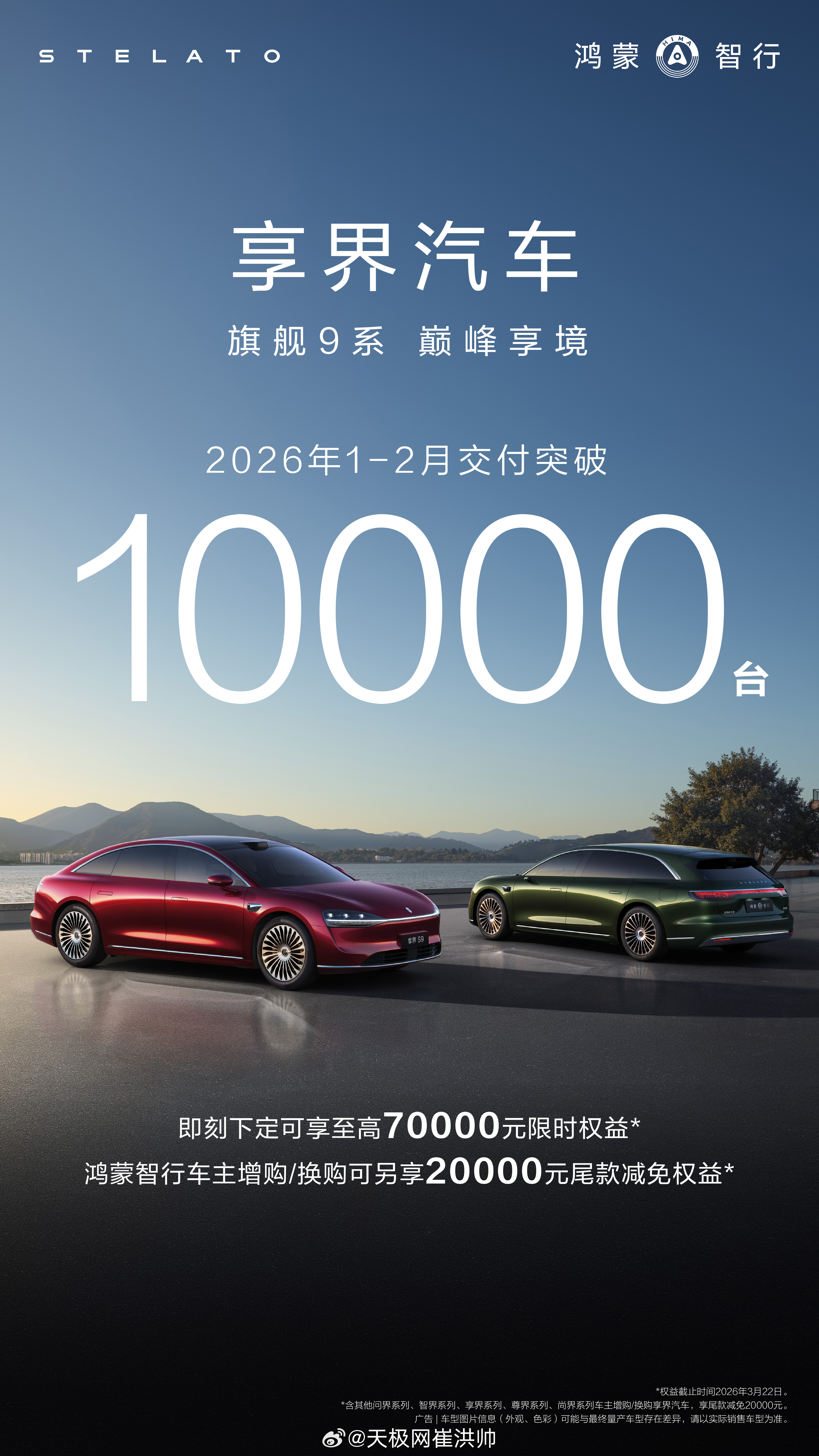 享界汽车2月交付4627台,2026年1-2月累计交付突破10000台,30万
