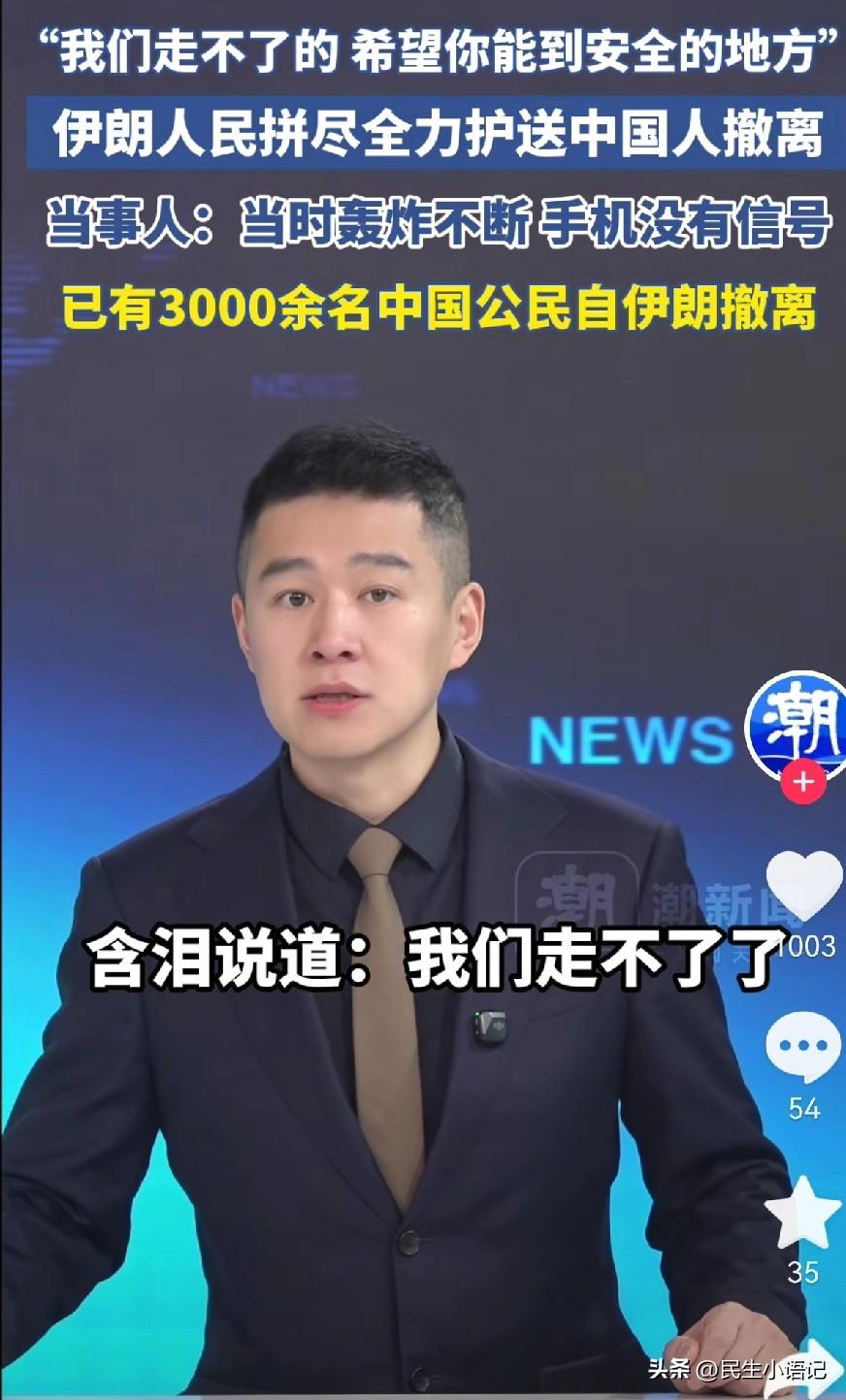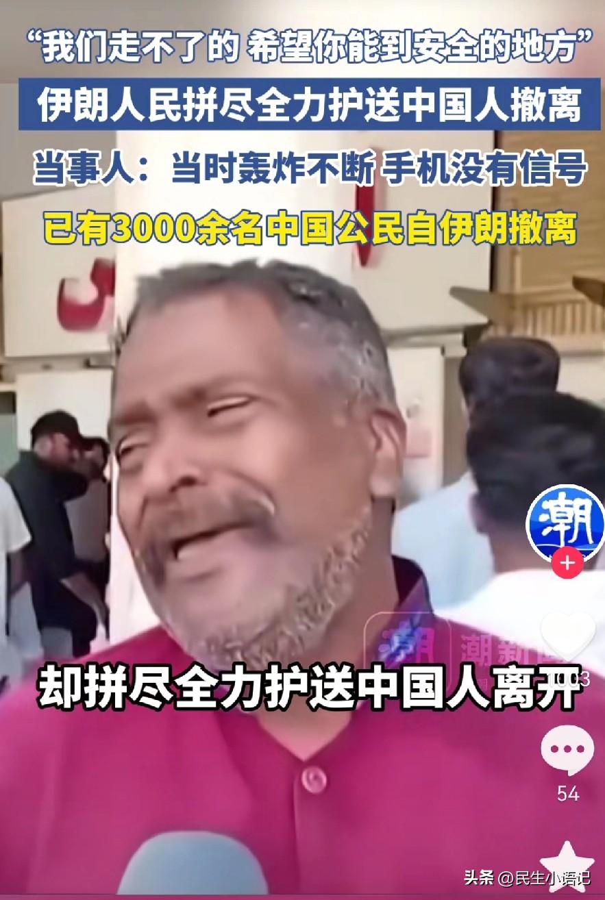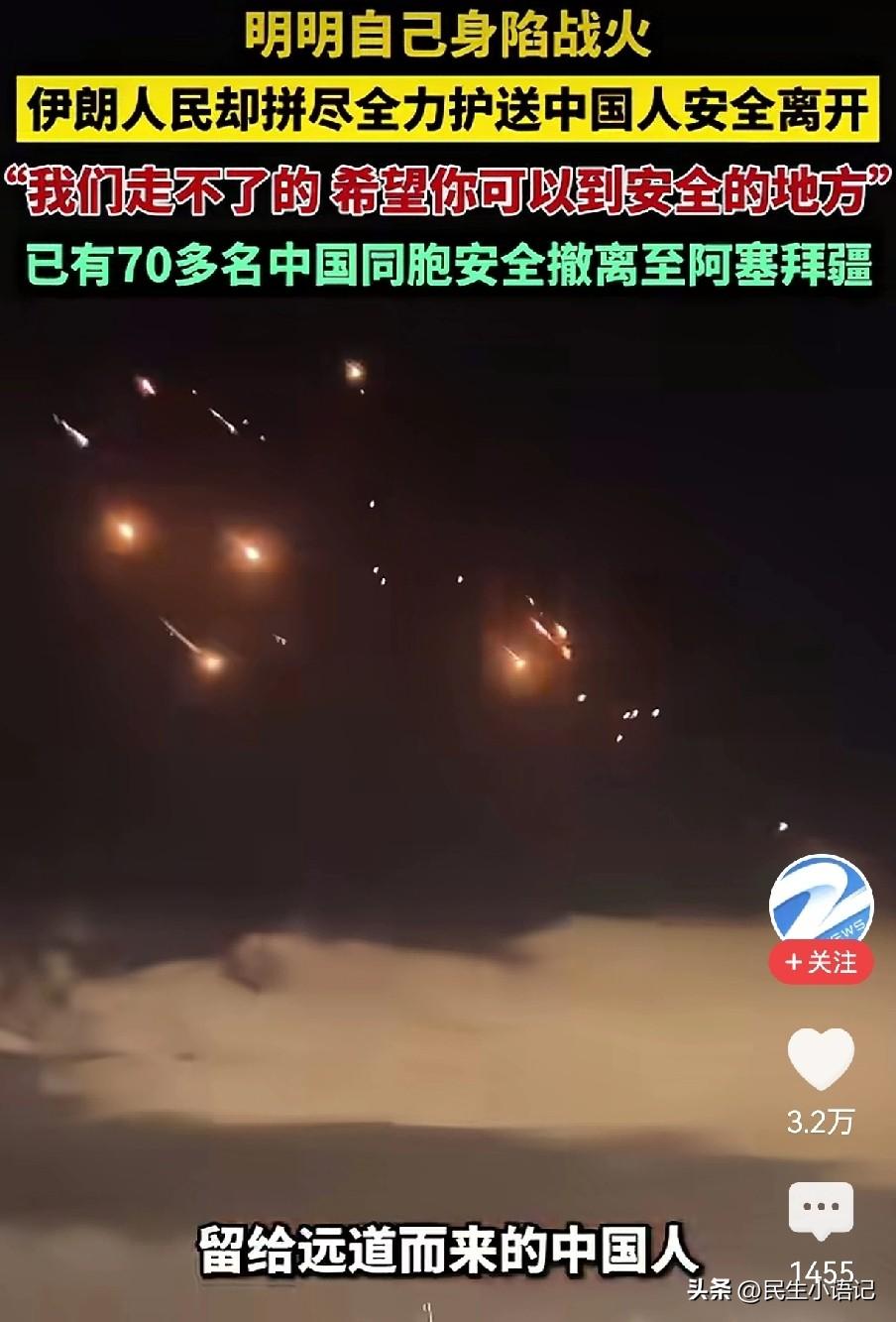 “我们走不了的,希望你可以到安全的地方”,听到这句话的那一刻,很多国人都破防了。 谁能想到,在硝烟四起的伊朗,当地民众明明自己身陷战火、朝不保夕,却拼尽全力,护送中国人安全离开。 炮火不断、信号中断,在最无助、最慌乱的时候,是伊朗的普通百姓、酒店工作人员主动伸出手,帮忙找车、指路、护送过关卡,把生的希望先给了异乡人。 截至目前,已有3000多名中国同胞自行撤离,70多名中国同胞在伊朗人民的帮助下也经边境口岸安全撤离。 他们自己无处可去,却祝我们一路平安; 他们自己活在恐惧里,却拼尽全力护我们周全。 当地百姓说:我们没什么可失去的了,可还是想让你安全。这不是义务,不是任务,是刻一种善良。 和平年代,我们总觉得善意很平常; 直到硝烟升起才明白,自己身处深渊,还愿意拉别人一把,才是最顶级的人性光辉。 哪有什么岁月静好,不过是有人在战火里,把温柔留给了我们。愿战火早日熄灭,愿善良的伊朗人民,也能早日迎来属于他们的平安。 你有被这份跨越国界的善意感动了吗?