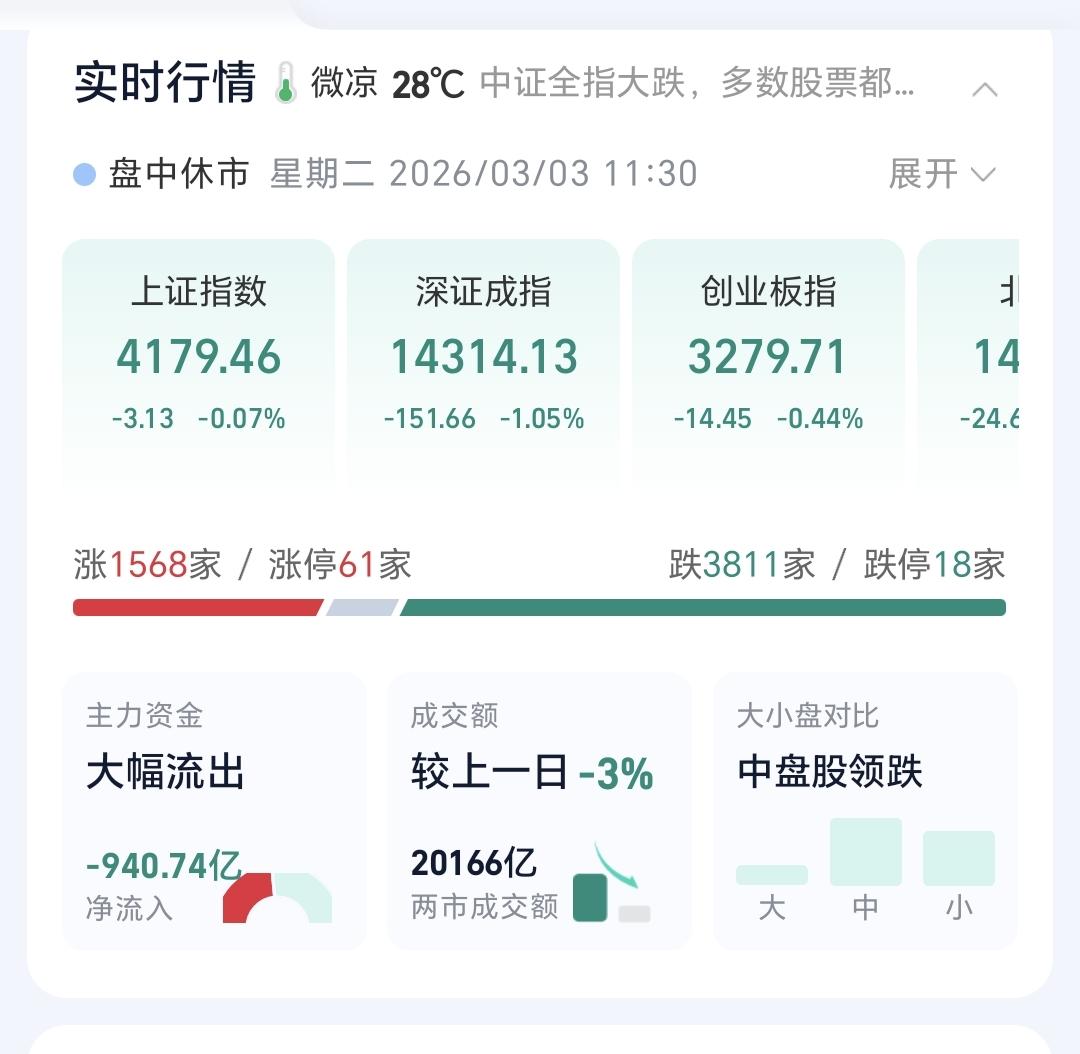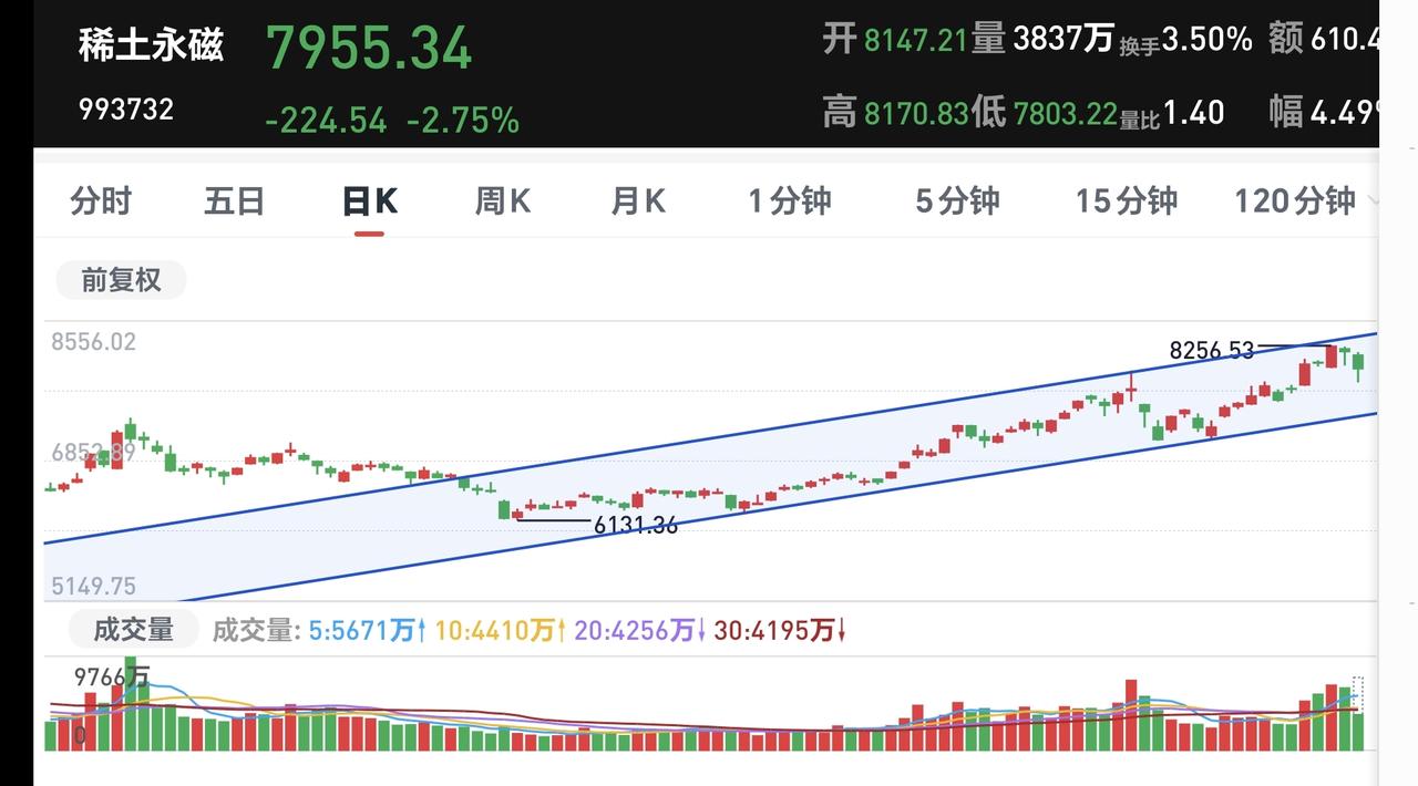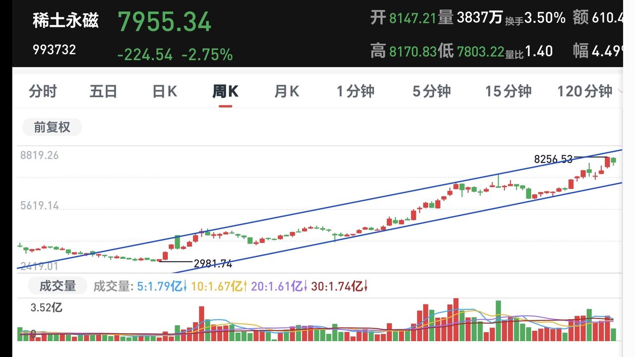基金:稀土永磁板块大跌,可不可以继续持有 今天市场高开以后探底回升,中午收盘的时候三大指数都是下跌,创业板指下跌了0.44%,收于3279点,上证指数下跌了0.07%,收于4179点。 整个股票市场,上涨1568家,下跌3811家,涨停61家,跌停18家,上涨家数少于下跌家数。 持有的基金中,中午收盘的时候,估值盈利金额最大的三个板块是:证券板块,新能源汽车板块,大消费板块,估值亏损金额最大的三个板块是:芯片半导体板块,先进制造板块,创新药板块,估值整体亏损了13779元。 整个基金市场,上涨5086家,下跌11462家,上涨幅度超过5%的17家,下跌幅度超过5%的68家。 图10是今天板块的上涨排行榜,上涨幅度最大的三个板块是:油气资源板块,煤炭板块,银行板块,图11是今天板块的下跌排行榜,下跌幅度最大的三个板块是:商业航天板块,军工板块,存储芯片板块,图12是今天基金的加仓和减仓人数,加仓15947165人,减仓3642717人,加仓人数超过了减仓人数。 整个市场主力资金净流入最多的三个板块是:大金融板块,银行板块,光伏设备板块,主力资金净流出最多的三个板块是:国企板块,高端制造板块,蓝筹策略板块。 稀土永磁板块今天大跌,盘中估值下跌了3.75%,持有人数在所有板块当中排名第六位。 稀土永磁板块日线级别处于上涨通道中,今天的下跌并没有跌破日线级别上涨通道的下轨线,今天的下跌并没有改变日线级别的上涨趋势,短线持有的人可以继续持有。 稀土永磁板块周线级别也是处于上涨通道中,今天的下跌也没有改变这个板块周线级别的上涨趋势,长线持有的人可以继续持有。 稀土永磁板块今天虽然是大跌,但并没有改变日线级别和周线级别的上涨趋势,不管是短线持有还是长线持有的人,都可以继续持有,日线级别上涨通道的下轨线是短线持有者的持有条件,周线级别上涨通道的下轨线是长线持有者的持有条件。 今天市场再创新高,中午收盘的时候并没有能够站在前高4190点上方,但即使是站在4190点上方,以现有的成交量,以现有的外围局势,这个突破也是一个假突破,这个突破也是会形成一个相对大级别的高点。 最近一段时间是只出不进,等待外围局势的平静,等待市场有可能调整的到来,在踏空和被套之间,我肯定是选择踏空,现在才是3月份刚刚开始,今年还有很长的路要走,近期砸一个黄金坑,是今年最好的走势,在这个位置越是往上走,形成高点的级别越大,我们不可以在有可能形成大高点级别的地方进场,永远错过也不要做错,即使错过也不会影响全年的整体收益。 花1秒钟点赞,花30秒钟评论,就是对我最大的支持,谢谢大家的支持。