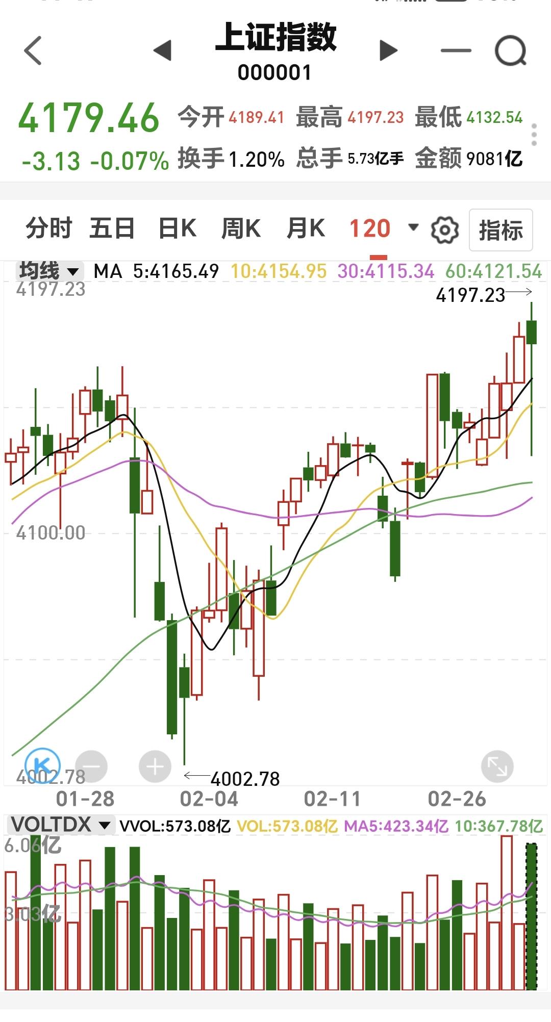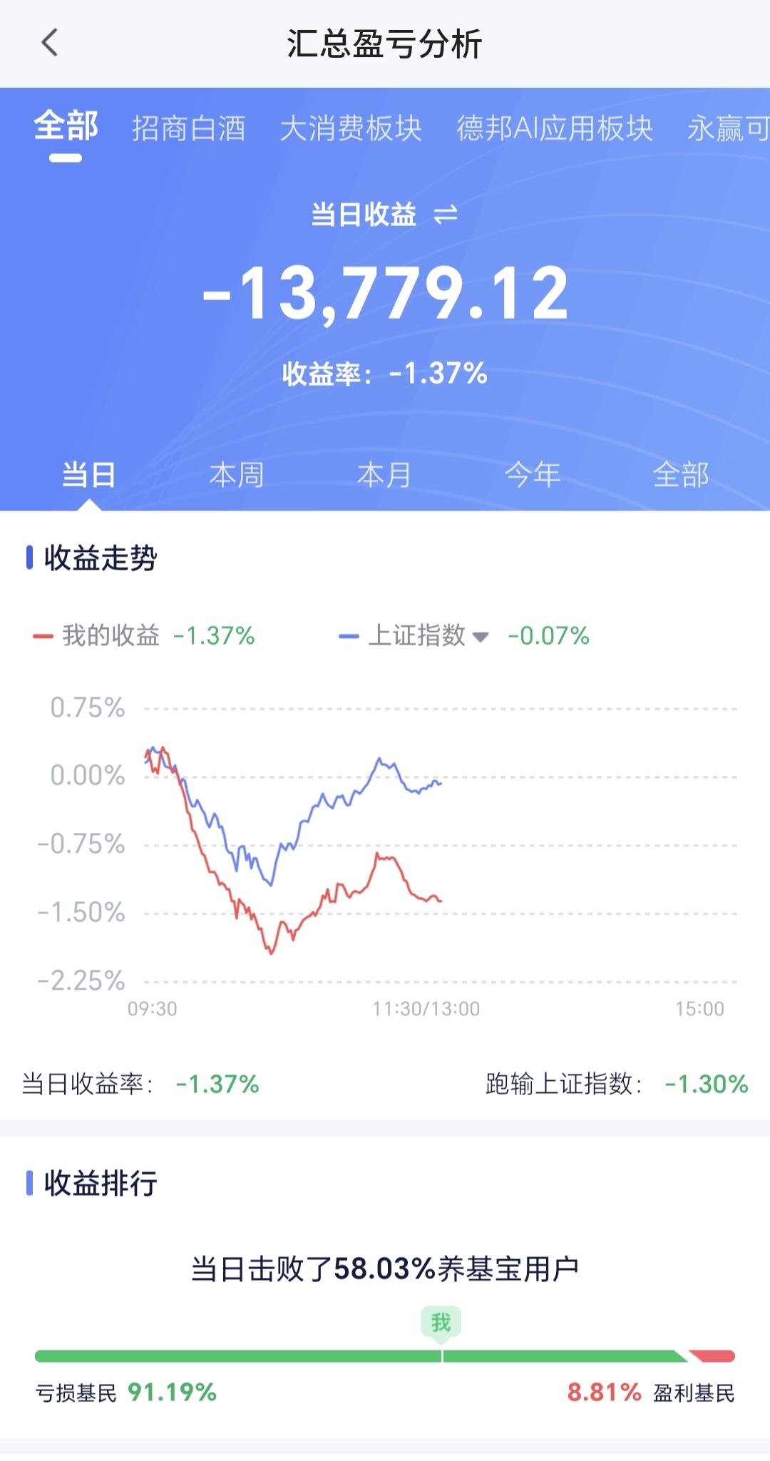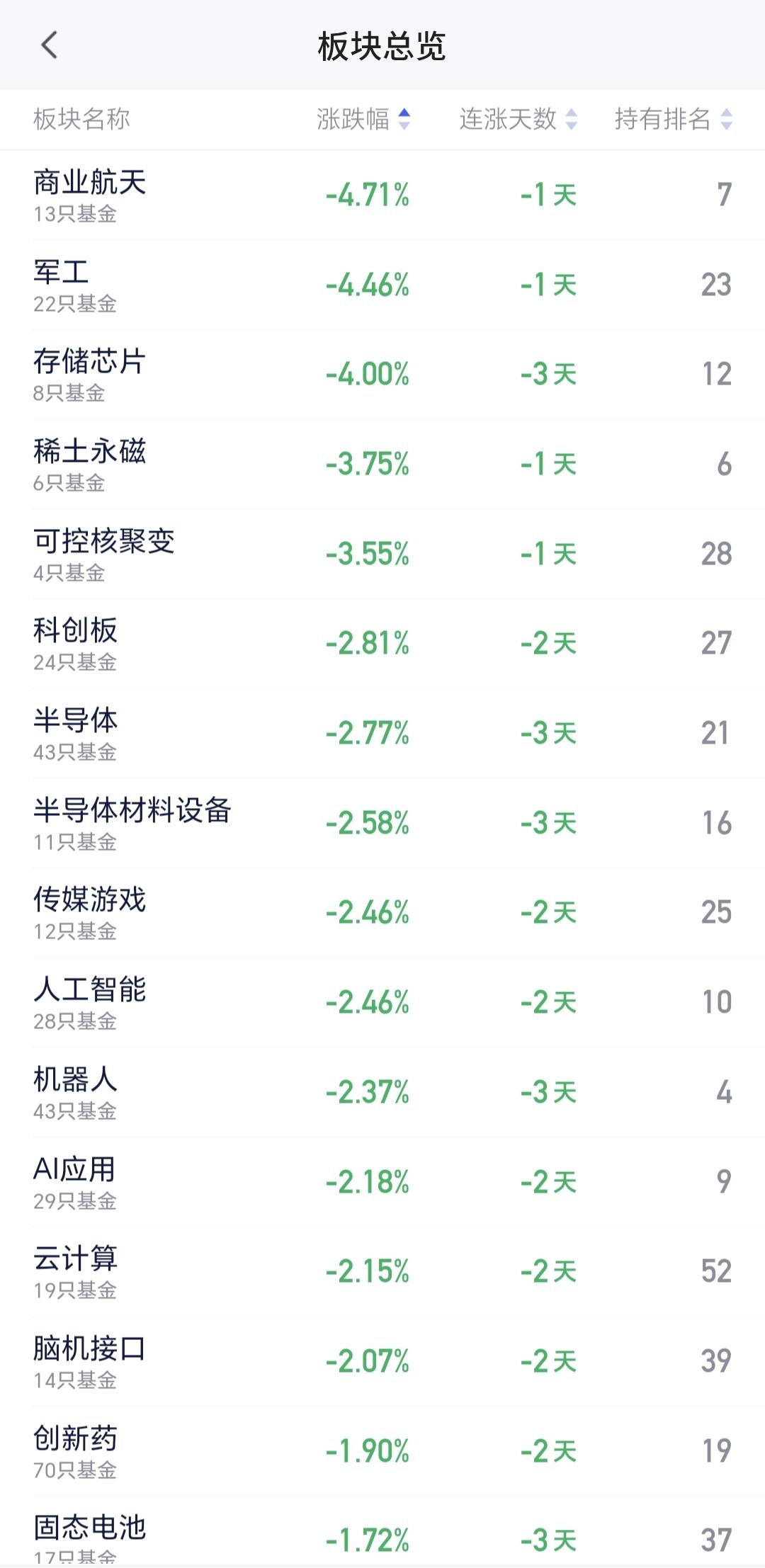 基金:稀土永磁板块大跌,可不可以继续持有 今天市场高开以后探底回升,中午收盘的时候三大指数都是下跌,创业板指下跌了0.44%,收于3279点,上证指数下跌了0.07%,收于4179点。 整个股票市场,上涨1568家,下跌3811家,涨停61家,跌停18家,上涨家数少于下跌家数。 持有的基金中,中午收盘的时候,估值盈利金额最大的三个板块是:证券板块,新能源汽车板块,大消费板块,估值亏损金额最大的三个板块是:芯片半导体板块,先进制造板块,创新药板块,估值整体亏损了13779元。 整个基金市场,上涨5086家,下跌11462家,上涨幅度超过5%的17家,下跌幅度超过5%的68家。 图10是今天板块的上涨排行榜,上涨幅度最大的三个板块是:油气资源板块,煤炭板块,银行板块,图11是今天板块的下跌排行榜,下跌幅度最大的三个板块是:商业航天板块,军工板块,存储芯片板块,图12是今天基金的加仓和减仓人数,加仓15947165人,减仓3642717人,加仓人数超过了减仓人数。 整个市场主力资金净流入最多的三个板块是:大金融板块,银行板块,光伏设备板块,主力资金净流出最多的三个板块是:国企板块,高端制造板块,蓝筹策略板块。 稀土永磁板块今天大跌,盘中估值下跌了3.75%,持有人数在所有板块当中排名第六位。 稀土永磁板块日线级别处于上涨通道中,今天的下跌并没有跌破日线级别上涨通道的下轨线,今天的下跌并没有改变日线级别的上涨趋势,短线持有的人可以继续持有。 稀土永磁板块周线级别也是处于上涨通道中,今天的下跌也没有改变这个板块周线级别的上涨趋势,长线持有的人可以继续持有。 稀土永磁板块今天虽然是大跌,但并没有改变日线级别和周线级别的上涨趋势,不管是短线持有还是长线持有的人,都可以继续持有,日线级别上涨通道的下轨线是短线持有者的持有条件,周线级别上涨通道的下轨线是长线持有者的持有条件。 今天市场再创新高,中午收盘的时候并没有能够站在前高4190点上方,但即使是站在4190点上方,以现有的成交量,以现有的外围局势,这个突破也是一个假突破,这个突破也是会形成一个相对大级别的高点。 最近一段时间是只出不进,等待外围局势的平静,等待市场有可能调整的到来,在踏空和被套之间,我肯定是选择踏空,现在才是3月份刚刚开始,今年还有很长的路要走,近期砸一个黄金坑,是今年最好的走势,在这个位置越是往上走,形成高点的级别越大,我们不可以在有可能形成大高点级别的地方进场,永远错过也不要做错,即使错过也不会影响全年的整体收益。 花1秒钟点赞,花30秒钟评论,就是对我最大的支持,谢谢大家的支持。
