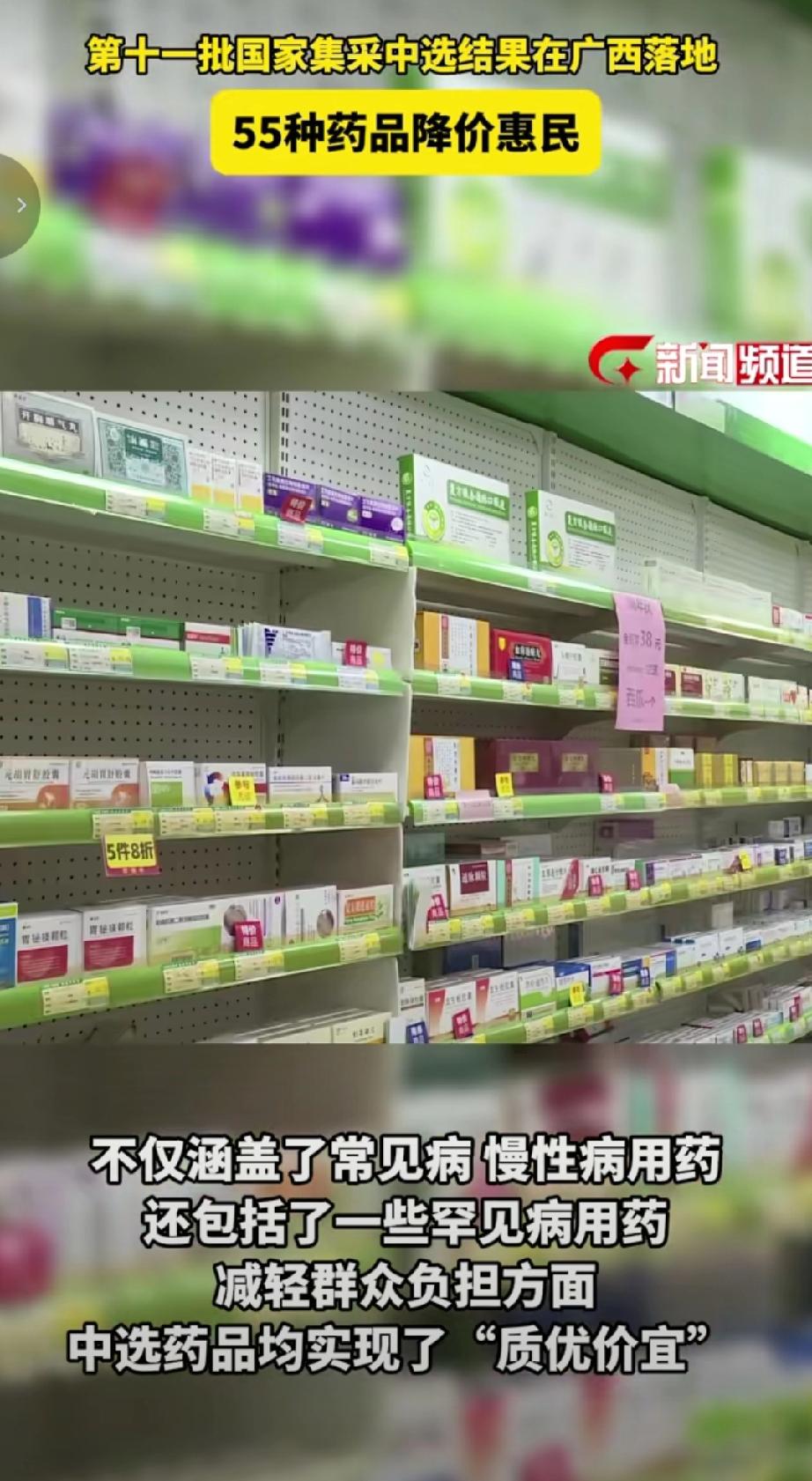 第十一批国家组织药品集中采购的中选结果近日在广西正式落地执行,共有55种药品降价惠民。这些药品覆盖了抗感染、抗肿瘤、降血糖、降血压、降血脂以及罕见病等多个治疗领域,不仅包含常见病、慢性病用药,还涉及一些罕见病用药。中选药品实现了“质优价宜”,有助于减轻群众的用药负担。(来源于@广西新闻频道 )