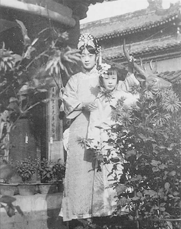 这张照片拍摄于紫禁城储秀宫前,末代皇后郭布罗·婉容与溥仪的三妹爱新觉罗·韫颖(人称“三格格”)。 婉容1922年被选入宫,成为清朝最后一位皇后,她出身名门,受过良好教育。韫颖是溥仪的三妹,也是他最疼爱的妹妹,因容貌出众,被称为“溥仪最漂亮的妹妹”。她后来嫁给了婉容的弟弟润麒,与婉容既是姑嫂,又是姻亲。