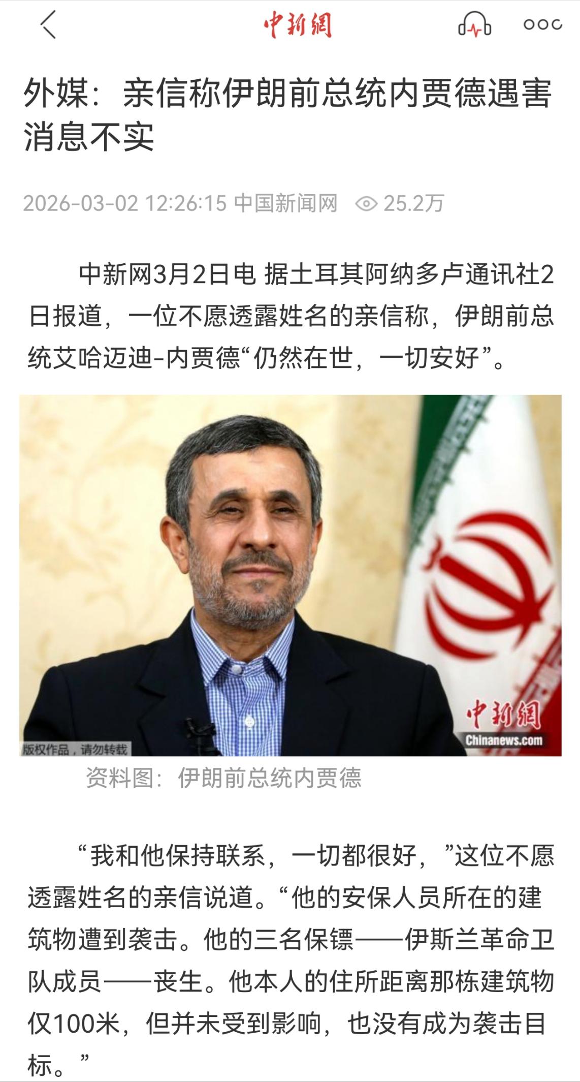 美以突袭伊朗,时间来到第3天,又有3个没想到,出现一个大反转,内贾德并没有死。没想到昨天各大媒体报道伊朗前总统内贾德身亡,但是今天出现了大反转,媒体又报道说,内贾德的亲信说跟内贾德一切安好,并没有死。 昨天那些跟风报道的媒体,说白了就是没核实信息就急于抢热度,毕竟内贾德在伊朗的影响力非同一般,他的生死本身就是重磅新闻。 美以突袭当天,确实打击了一处与内贾德安保人员相关的建筑,这处建筑距离内贾德的住所只有100米,里面的三名保镖都是伊朗伊斯兰革命卫队成员,在袭击中不幸身亡,也正是因为这一点,才有了内贾德身亡的误传。 这种战时信息混乱导致的误报,在中东冲突里并不是第一次发生。去年就有媒体报道,哈梅内伊的政治顾问沙姆哈尼在以色列的袭击中受重伤身亡,消息传得有板有眼,甚至连“后事安排”都被编了出来,结果没过几天,伊朗媒体就澄清,沙姆哈尼经过医生救治,伤情已经趋于稳定,压根没有生命危险。 这种误报背后,要么是信息传递不及时、核实不到位,要么就是有人故意放出假消息,试图扰乱对方的军心。 内贾德之所以会被如此关注,核心还是他在伊朗的地位和影响力。作为伊朗前总统,他一直是强硬的反美反以派,在伊朗保守派中拥有大量支持者,数据显示,保守派选民中近六成认可他的政治立场,就算卸任后,他依然能影响不少伊朗民众的态度,甚至在革命卫队中也有不少亲信。 美以一直将他视为眼中钉,试图通过打击他来动摇伊朗保守派的凝聚力,所以这次误报,也难免让人怀疑是美以方面故意放出的假消息,想试探伊朗的反应。 除了亲信发声,内贾德的家属也对外否认了那些非官方媒体的死亡报道,明确表示内贾德的住所并没有受到袭击,全程都处于安全状态。 要知道,内贾德本身就有着严密的安保措施,作为前总统,他的出行和居住都有革命卫队专人保护,美以想要精准打击到他,本身就不是一件容易的事,这次突袭的目标本就不是他,只是碰巧波及到他的安保建筑,才引发了这场乌龙。 美以突袭伊朗的第三天,局势本就处于高度紧张状态,伊朗已经展开反击,打击了美以在邻国的军事基地,这种时候内贾德未死的反转,相当于给伊朗民众吃了一颗定心丸,也让美以试图通过假消息扰乱伊朗局势的算盘落了空。 那些昨天急于报道“内贾德身亡”的媒体,如今也陷入了尴尬,毕竟没有核实信息就盲目发声,不仅误导了公众,也丢了自身的公信力,说到底,还是太急于抢热度,忽略了最基本的信息核实。