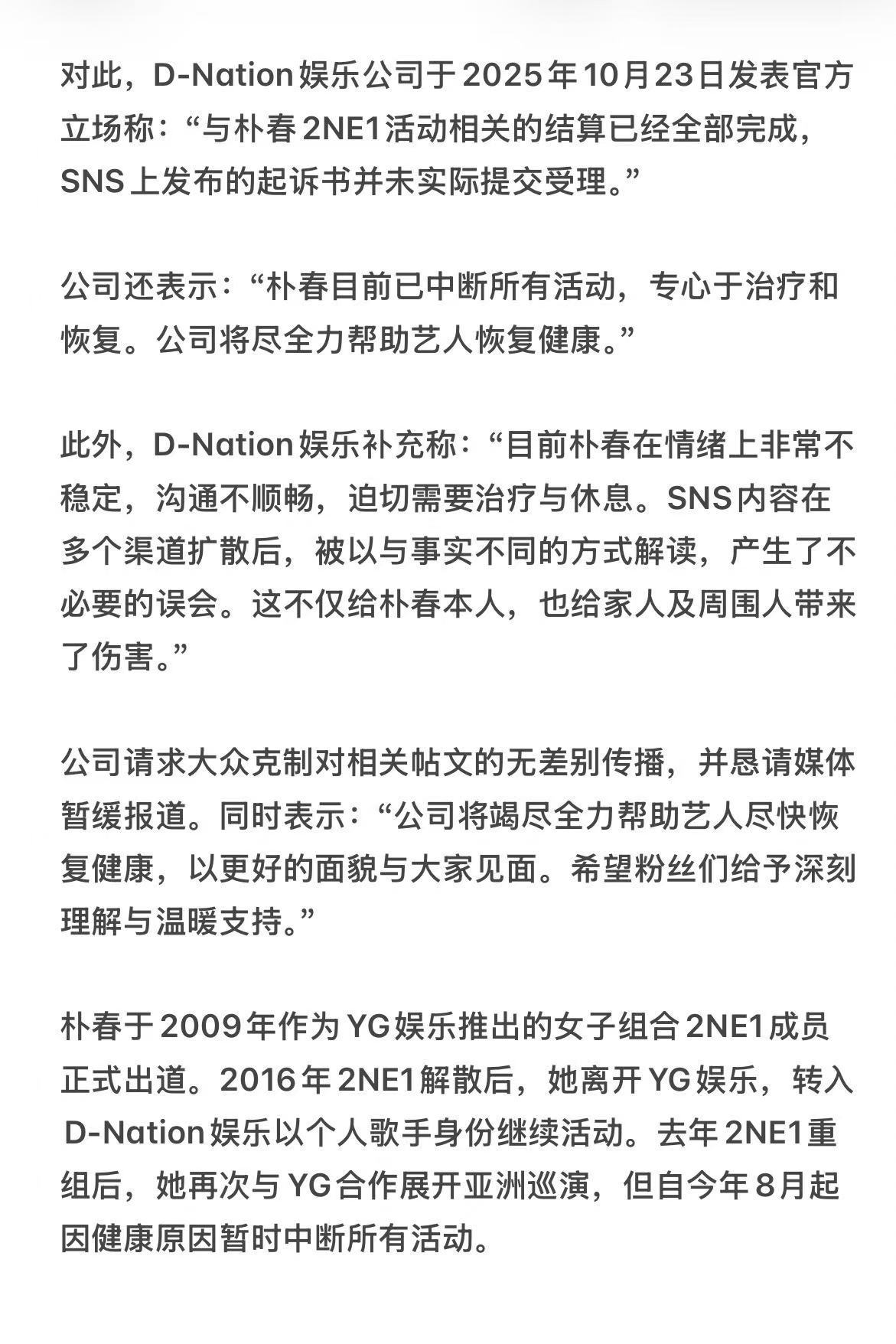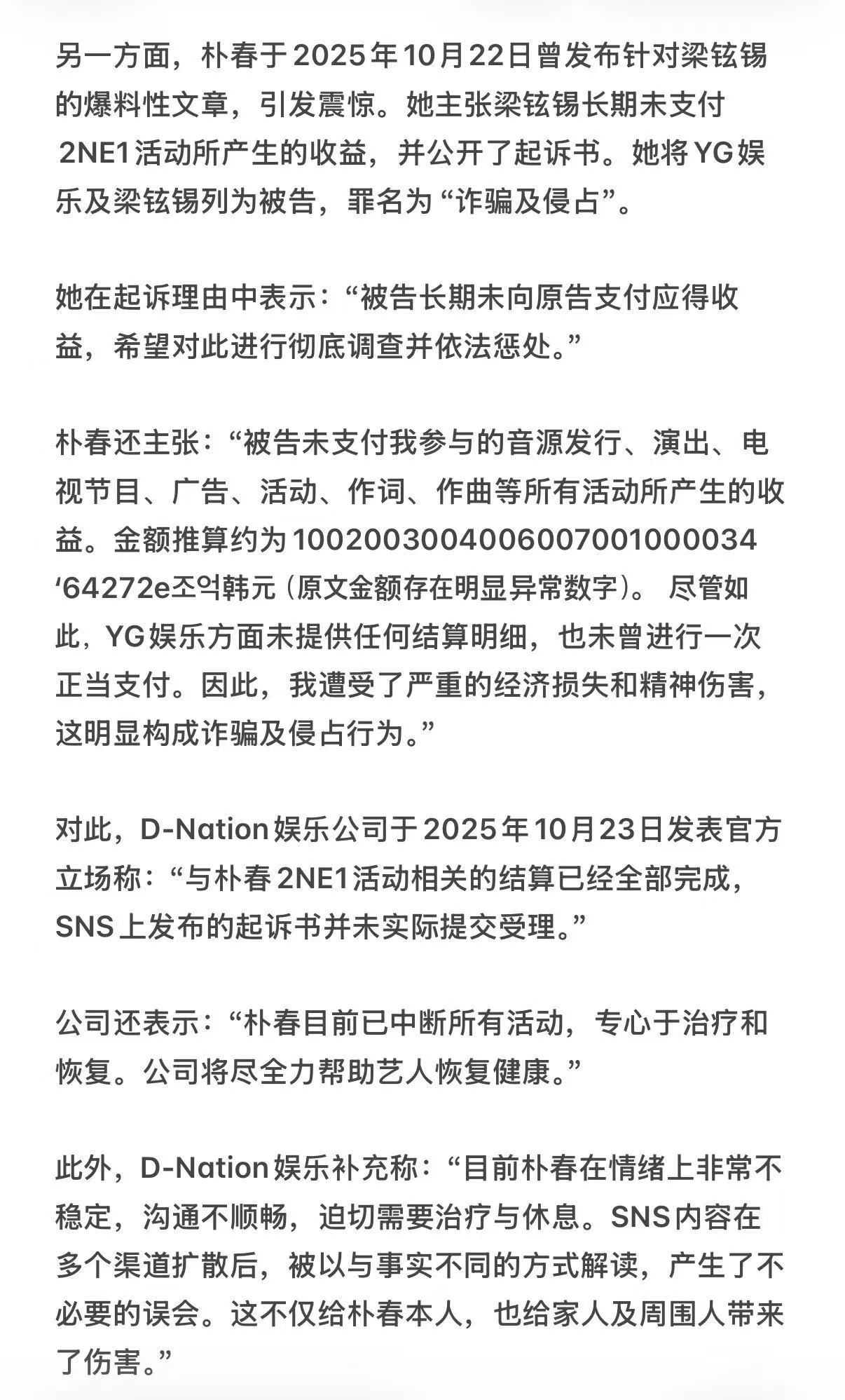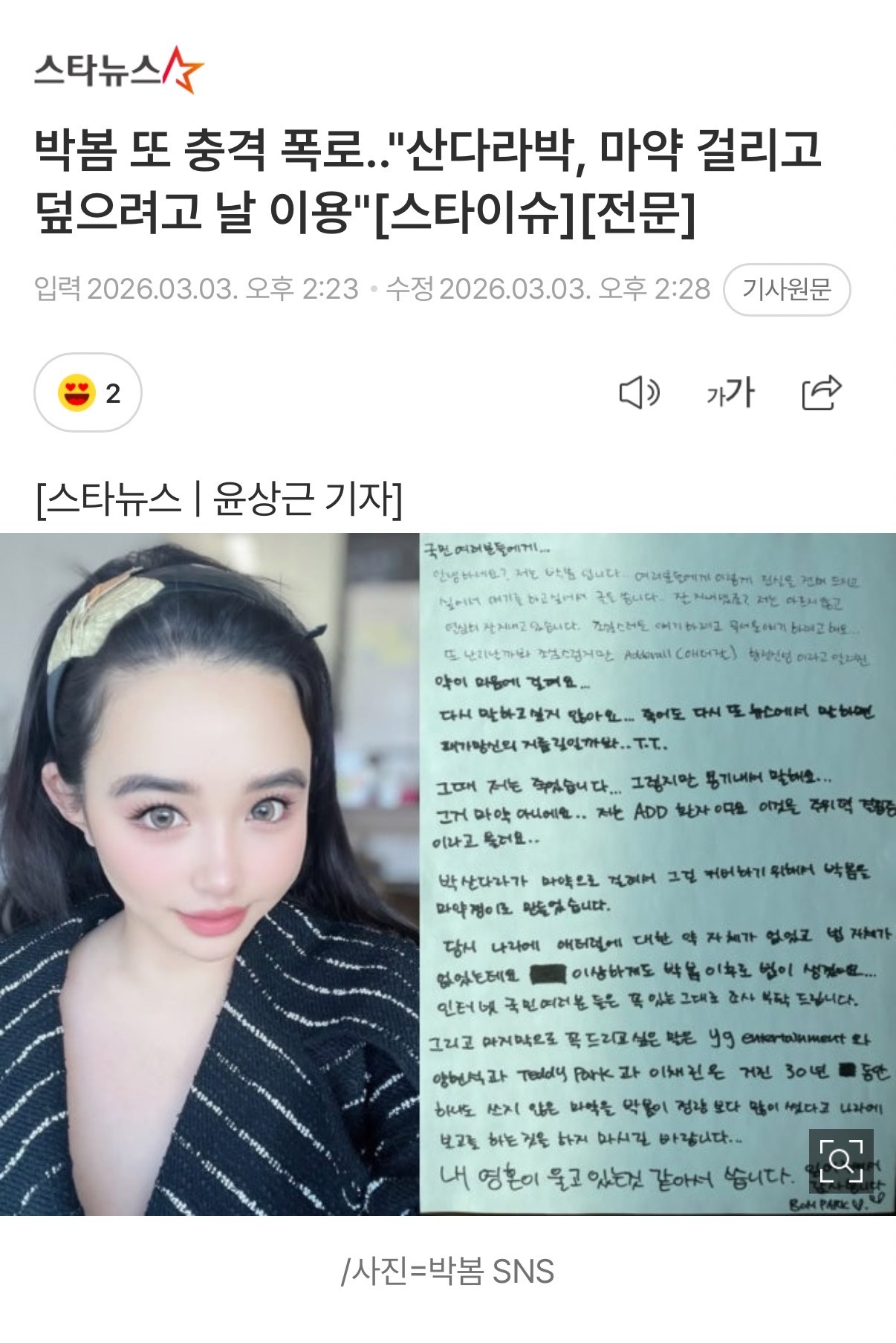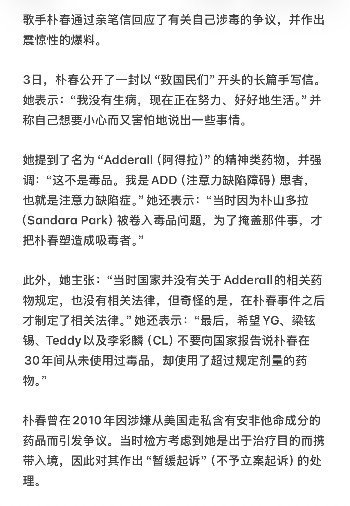 朴春通过亲笔信回应了自己当年的涉du争议,指控数据被利用来掩盖朴山多拉的du品问题而被诬陷,并否认自己吸du,同时点名相关人士不要再将其指控为滥用du品。