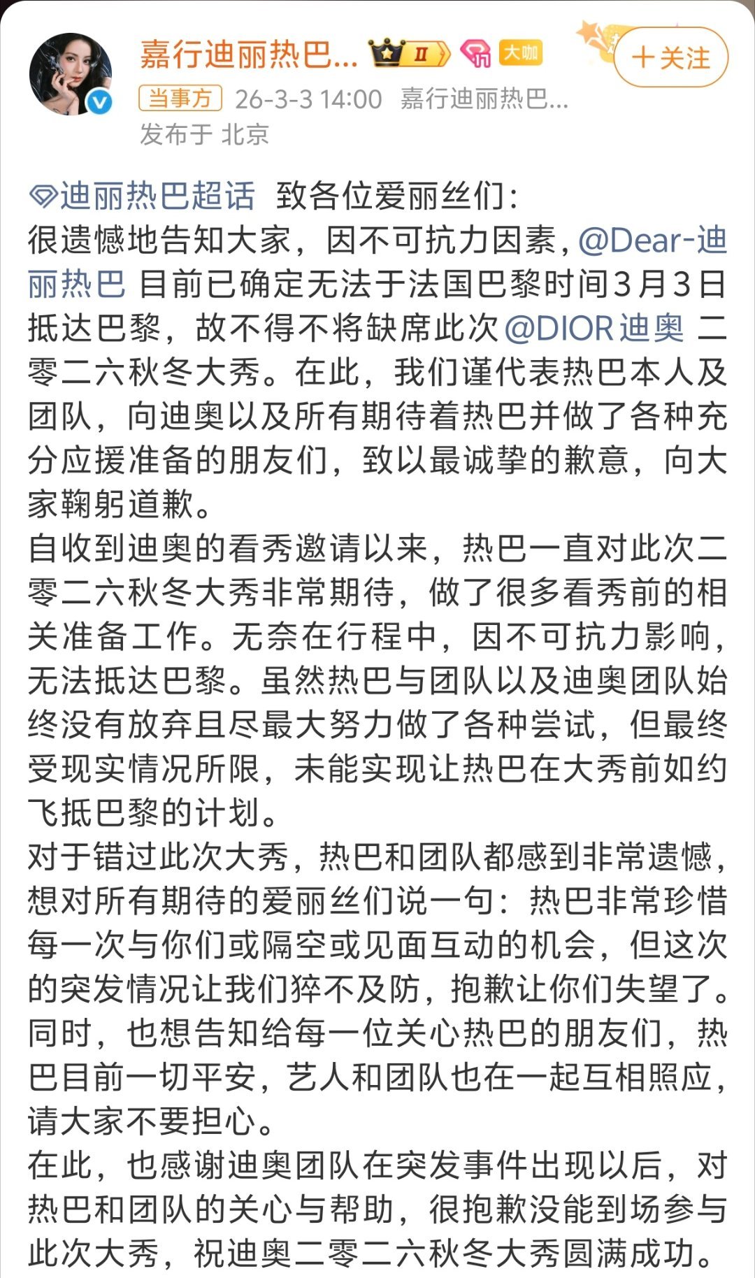 迪丽热巴 对接回应热巴已在安全区域,大家放心!