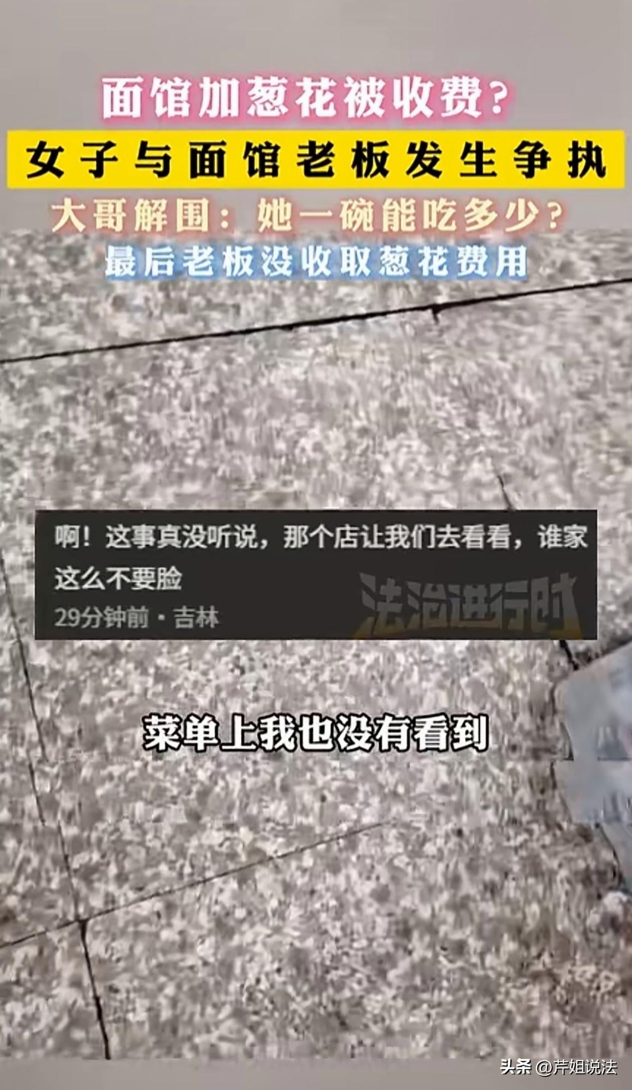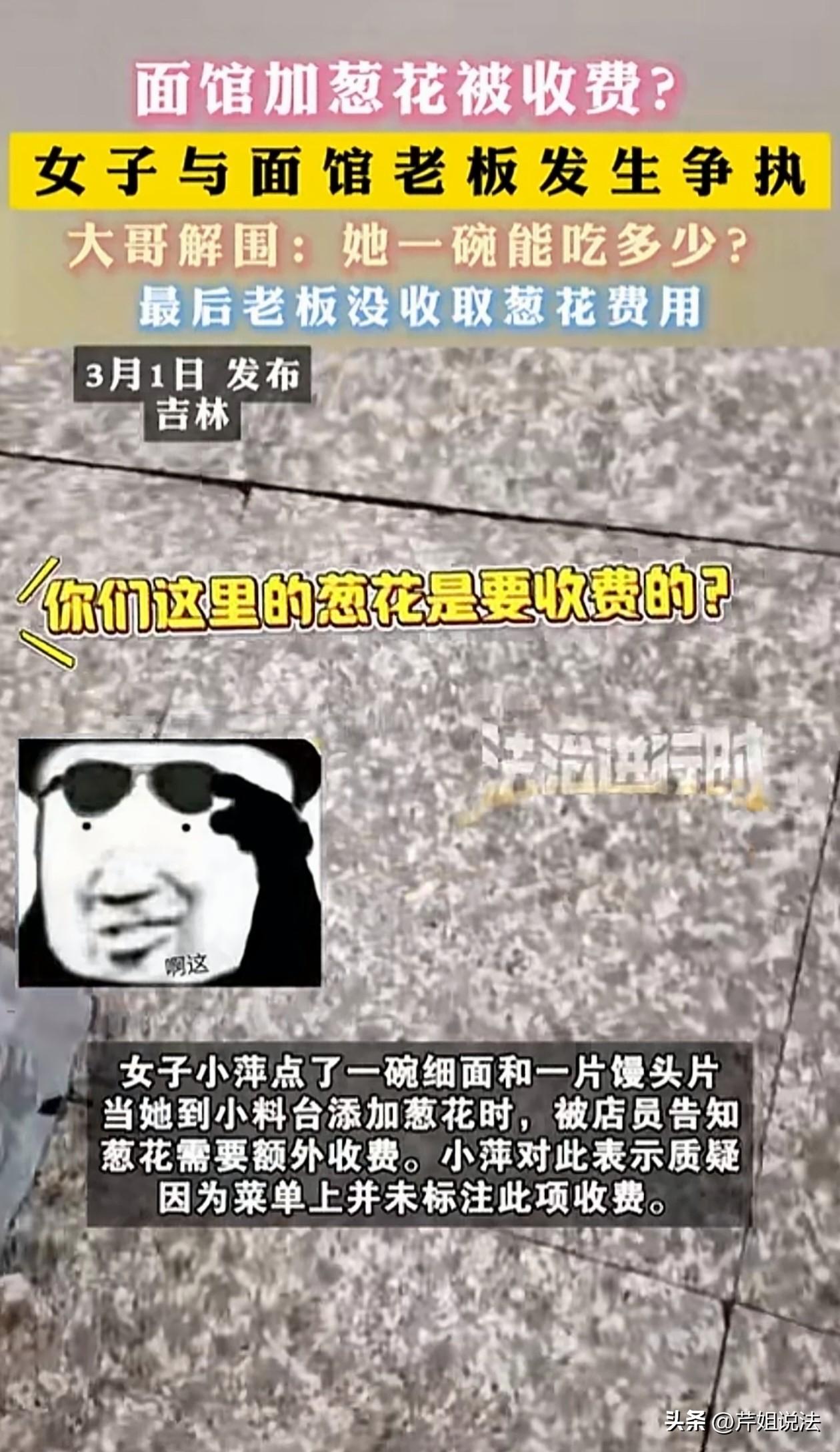 “吃碗面,加点葱花都要钱?别太离谱!”吉林,一女子在一家面馆吃面时,想在料台加点葱花,老板在一旁看到后表示,这葱花是要收费的。女子不解,这年头吃碗面加点葱花还要额外收费了?还要不要让人活了! 据悉,2月28日中午,正是饭点的的时候,吉林一女子小萍,走进了一家面馆,点了一小碗细面和一片馒头片。 吃面不加点调料这也太干巴了,于是,小萍走向一旁的小料台准备加点葱花调味。 小萍加到半勺时,老板就在一旁说道,这葱花是要额外收费的。 小萍当场就愣住了,从小到大吃面无数,什么面馆没去过呀,就没见过加点葱花还要额外收费的。 随后,小萍又看向菜单,发现菜单上并未标注葱花的收费情况! 小萍是越想越不得劲了,小料要收费却没有任何标注,顾客加了才告知。 要是老板连说都不说了,偷偷加钱,这不就是“隐形消费”了?临时收费这也是违规! 于是,小萍掏出手机,当即进行录像,表示要坚决抵制这种违规行为。而此时,在小萍一旁吃面的大哥也坐不住了。 “你就让她加呗,她又吃不了多少!” 大哥帮小萍霸气回怼老板,真是暖心又解气。明明就是一点不值钱的葱花,老板揪着不放,是个正常人都看不过去。 老板看到小萍在录像,大哥又出来帮忙解围,这才停止了和小萍的争执。 说白了,老板就是怕影响不好,要是没人吭声,没人曝光,那不知有多少人在这不知情的情况下被无辜扣钱了。 这期葱花收费事件看似是小,但实则反映了很多现实问题,值得我们每个人警惕! 老板在小萍已加了半勺葱花时,才说收费,这其实已经算是一种“试探性欺负”的行为了,那什么是“试探性欺负”呢? 简单举这件事来说,如果小萍好说话、脸皮薄,那老板就可以大胆收费了,而如果有人出头、有人录像,老板就怂了。 这就是看人下菜,典型的欺软怕硬! 也许这里老板并没有此意,但我们要警惕的是这种可能会发生在我们身边的行为,不要轻易被人当软柿子捏。 其实很多人吃亏,不是因为自己笨,而是因为脸皮太薄,怕尴尬!很多小商家就是吃准这一点,开始乱占小便宜。 不明码标价、背地收费就是在变相宰割,这性质就严重了。这是侵害了消费者的知情权和公平交易权。 依据《消费者权益保护法》第八条知情权:消费者享有知悉其购买、使用的商品或者接受的服务的真实情况的权利。消费者有权要求经营者提供商品的价格、产地、生产者、用途、性能、规格、等级、主要成份、生产日期、有效期限、检验合格证明、使用方法说明书、售后服务,或者服务的内容、规格、费用等有关情况。 葱花额外收费属于服务的费用范畴内,而老板却没有在店内的菜单或小料台提前标注,其口头告知也是在小萍加了半勺以后才说的,这就算事后告知了。 这性质就更恶劣了,事后才说,就不算是告知了,这是强行补收费,剥夺了消费者小萍的知情权利。 第10条公平交易权:消费者享有公平交易的权利。消费者在购买商品或者接受服务时,有权获得质量保障、价格合理、计量正确等公平交易条件,有权拒绝经营者的强制交易行为。 老板临时加收未标注价格的葱花钱,这不符合条文里的“价格合理”,这属于“强制交易”行为。说白了,这就是拿捏了消费者怕尴尬的心理,强迫其接受额外收费。 而且,在《价格法》第十三条里有明确规定:经营者销售、收购商品和提供服务,应当按照政府价格主管部门的规定明码标价,注明商品的品名、产地、规格、等级、计价单位、价格或者服务的项目、收费标准等有关情况。 这更加核实了这一点,商家不明码标价是属于价格违法行为的。 沉默会纵容小恶,需要拿出勇气说句公道话。恶很小,勇气也不用很大,只要一点点就够了。 真正的善良,不是要一直退让,而是要带点锋芒,不然就会变成别人拿捏我们的弱点! 对于上述事件,您有什么看法?欢迎留言交流。 来源:法治进行时