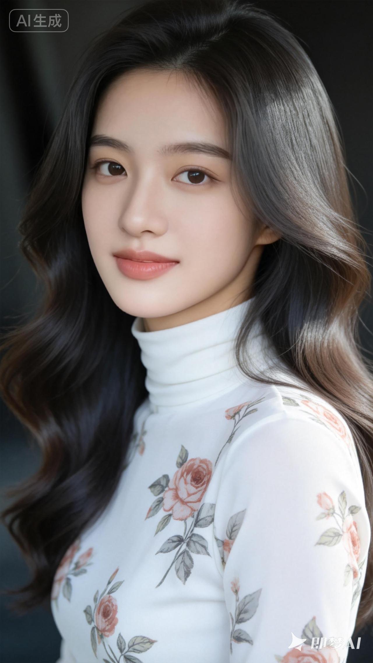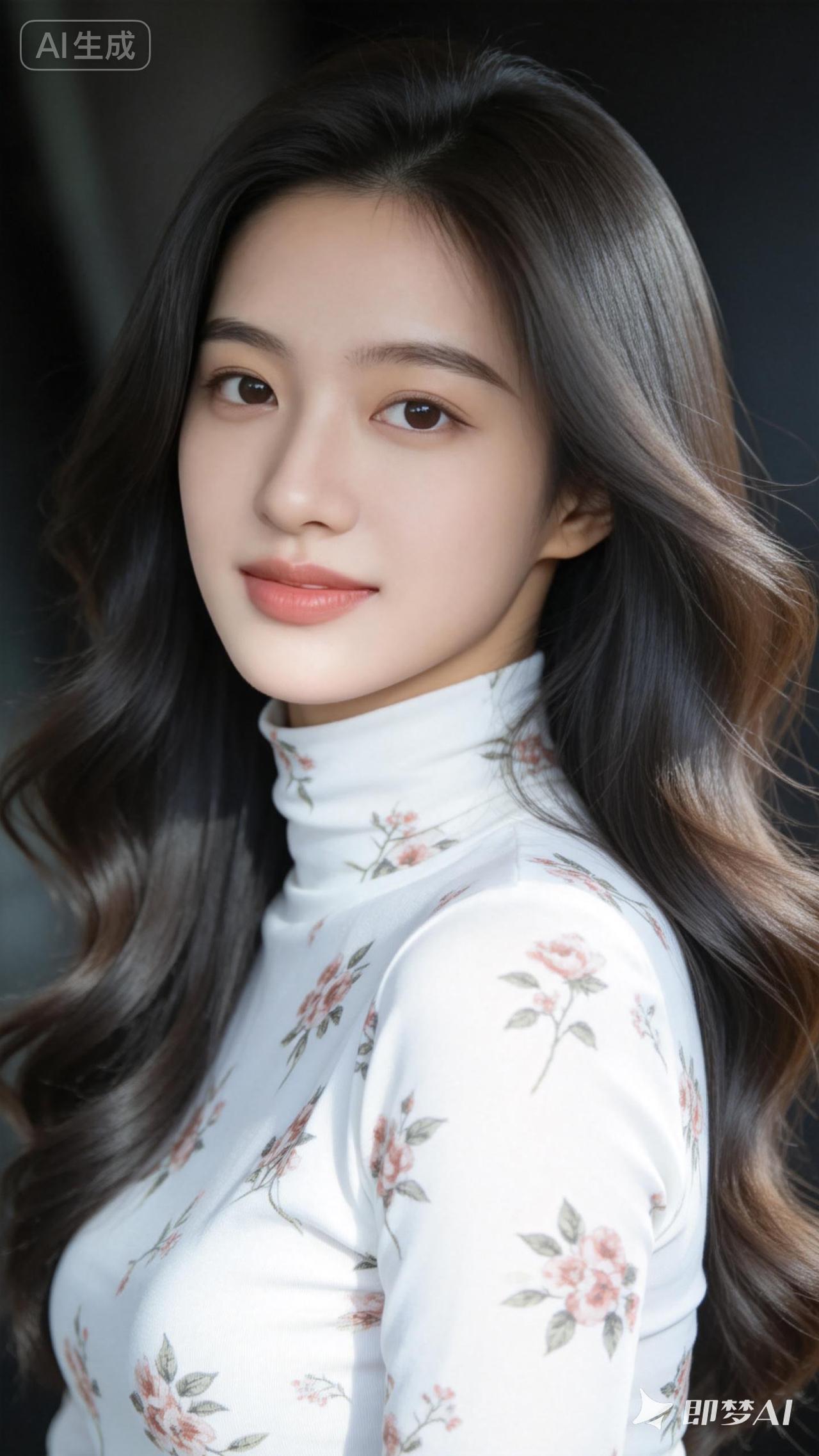 温柔甜美的少女,穿着印花高领衫,散发着优雅的气质。