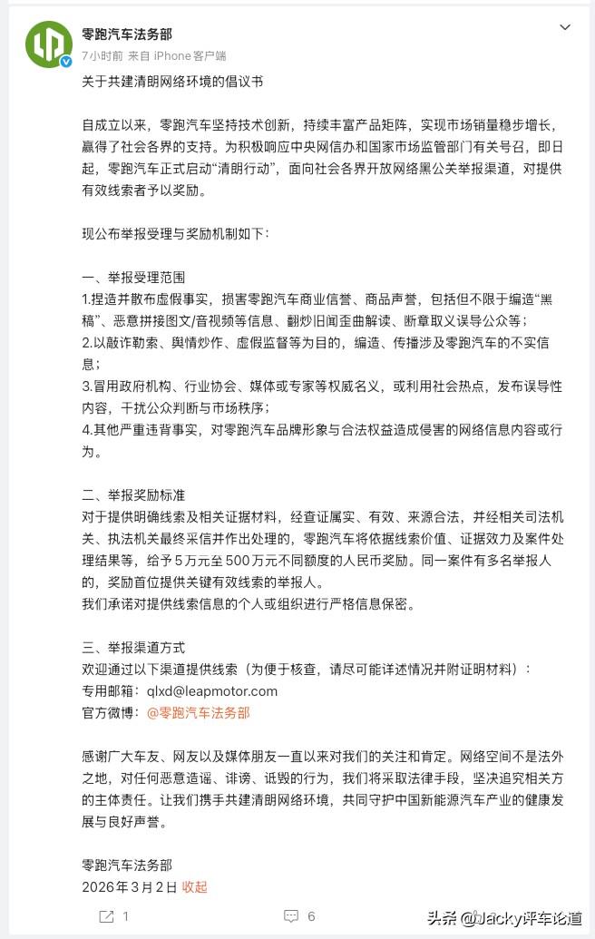 零跑发布清朗行动倡议:全力守护自身新品舆论环境。 春节后刚开工不久,零跑就正式发布了共建清朗网络环境的倡议书,此举核心是为自身即将到来的新品上市铺路,守护好接下来的舆论环境。 要知道零跑多年来深耕技术研发、打磨产品与服务,也始终坚守理性竞争底线,鲜有听闻零跑攻击其他友商或在网络上与其他品牌相互攻讦。但是随着零跑的持续热销,网络上也逐渐出现一些针对零跑的不太和谐的声音。而今年3月起,零跑将迎来A10、D19等新品密集发布,此时发起倡议,也是为了提前防范可能出现的黑公关困扰,为新品上市扫清网络障碍。 此次倡议明确了举报受理范围、奖励标准、举报渠道等信息,光是奖励上限就高达500万元人民币,以此震慑针对自身的黑公关行为。 能有如此大的动作,也说明零跑既想用扎实的产品实力赢得市场,也希望通过此次倡议,杜绝针对自身的恶意黑稿、不实解读,让消费者看到最真实的零跑,为后续新品顺利发布保驾护航。