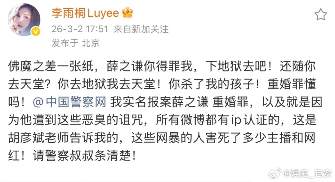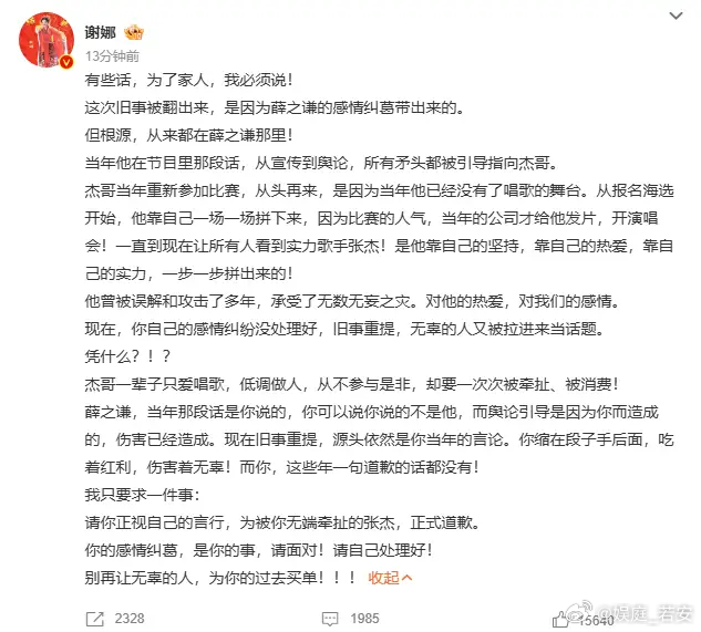 谢娜喊话薛之谦3月2日晚,歌手薛之谦前女友李雨桐发布微博 实名举报薛之谦涉嫌重婚罪,并指控薛之谦导致自己堕胎及长期遭受网暴。相关话题迅速引发热议,引爆热搜。3月3日,谢娜为张杰发声,喊话薛之谦道歉,直言 这次旧事被翻出来,是因为薛之谦的感情纠葛带出来的。但根源,从来都在薛之谦那里,当年他在节目里那段话,从宣传到舆论,所有矛头都被引导指向张杰。谢娜表示, 只要求一件事:请你正视自己的言行,为被你无端牵扯的张杰,正式道歉。截至发稿,薛之谦方对此事均未作任何公开回应。