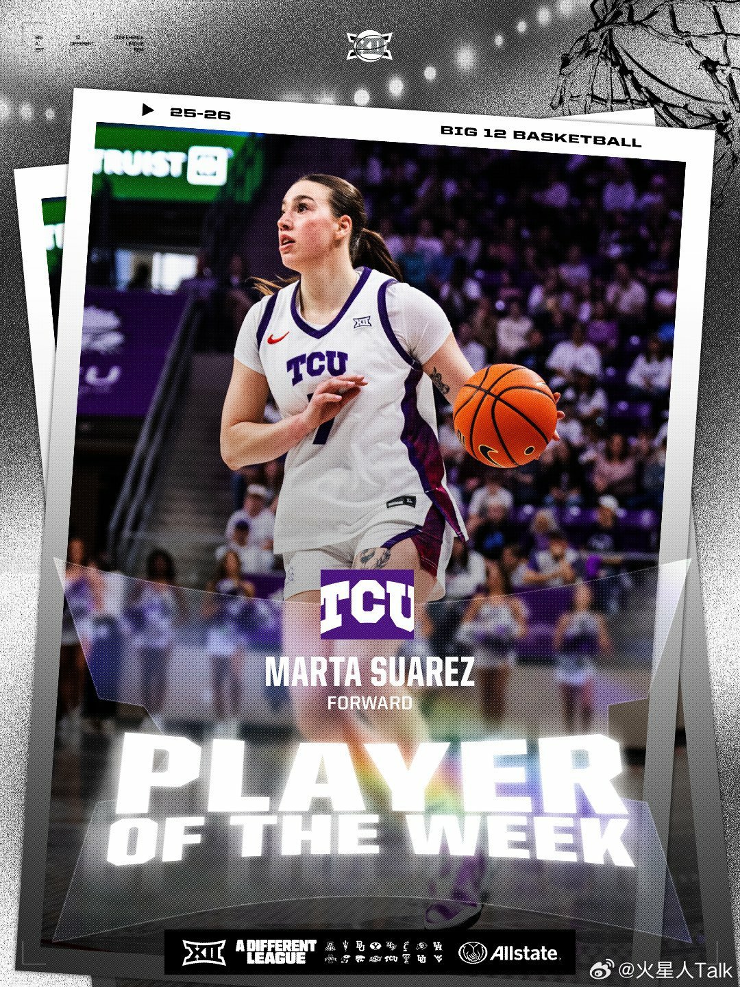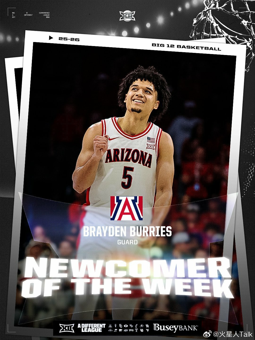 Big 12联盟第17周表现奖(2025-2026赛季)。NCAA男篮最佳球员:Christian Anderson,最佳新生:Brayden Burries。NCAA女篮最佳球员:Marta Suarez,最佳新生:Jaliya Davis。