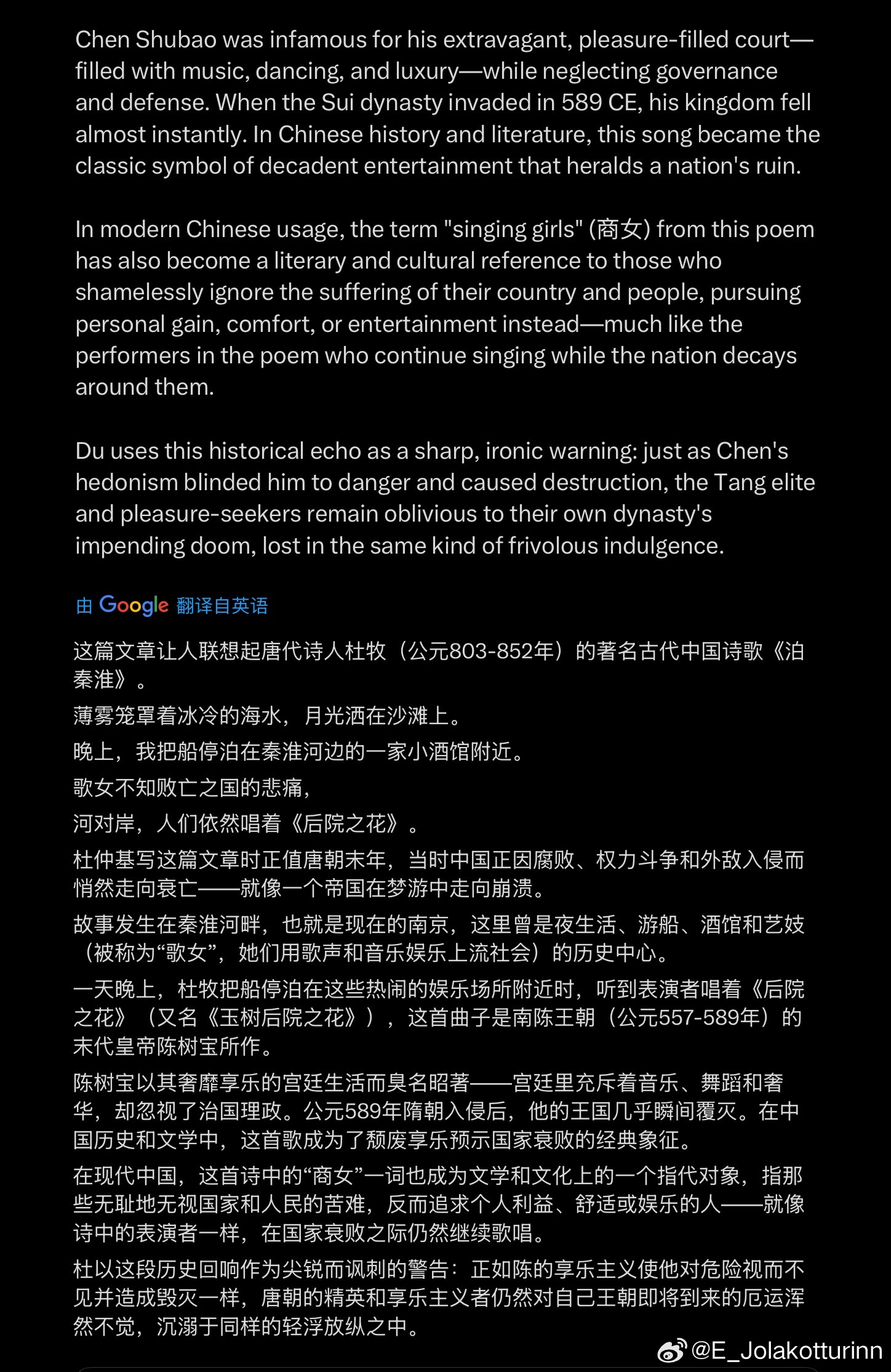 即便她们的祖国已是残垣断壁,儿童惨遭屠戮,但这也不影响她们感谢入侵者,也不影响她们用同胞的血泪在社交媒体上吸粉。这行为突然让我想起杜牧的《泊秦淮》,那句“商女不知亡国恨,隔江犹唱后庭花”是中国人耳熟能详的。