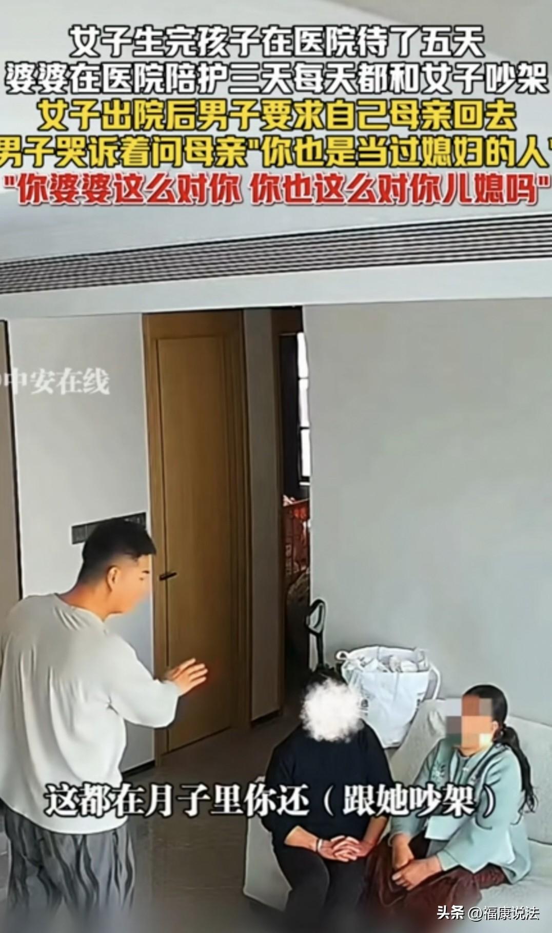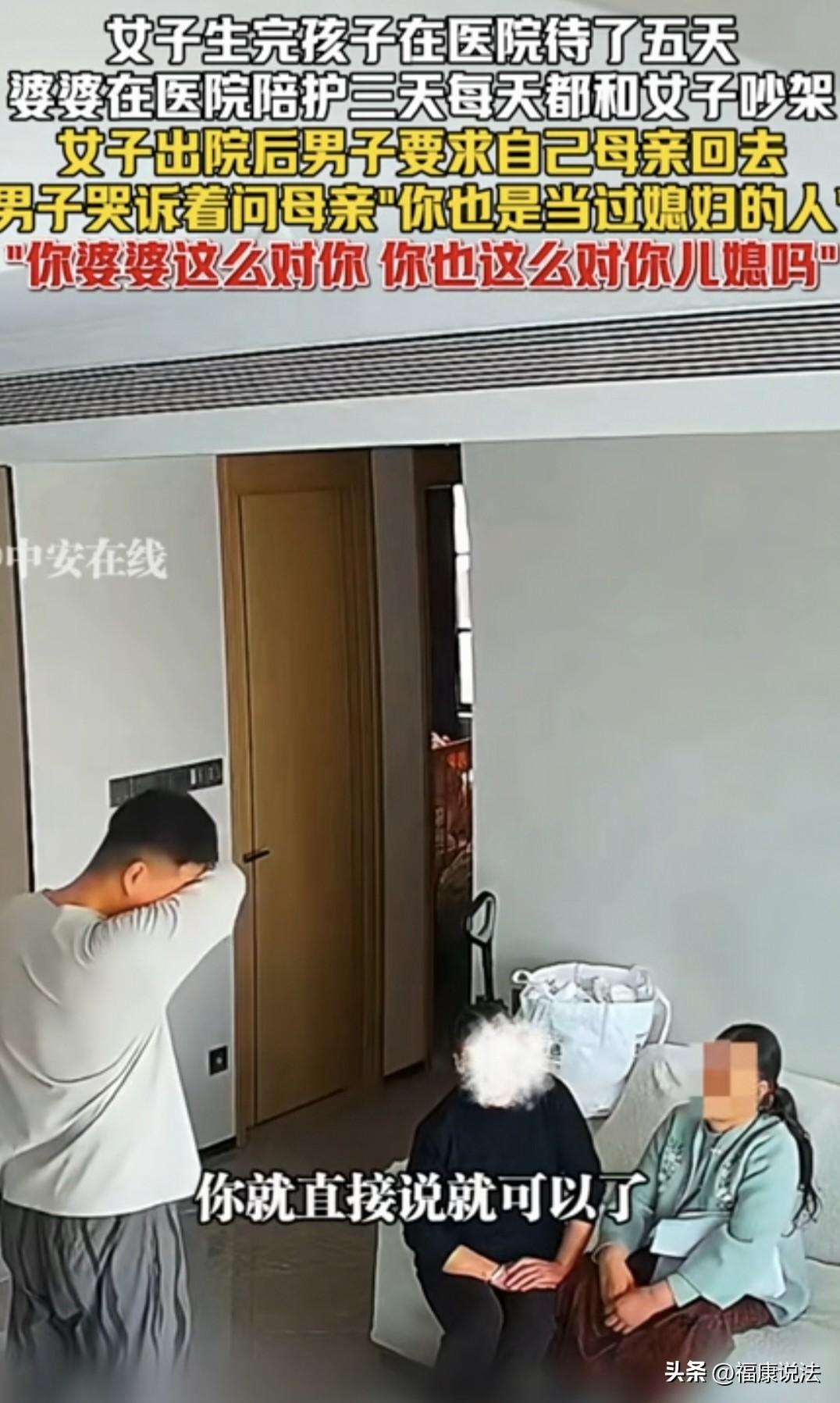“明事理的好丈夫!”四川,男子的妻子生完孩子住院5天,婆婆只陪护3天,每天都和儿媳吵架,男子一忍再忍,等妻子出院后,他哭着说母亲:你回去吧,她在月子里你都跟她吵架,你也是媳妇过来的,现在当婆婆了,你怎么对儿媳妇的呀?母亲说:我暂时在这帮你带孩子。男子连连拒绝,这时妻子从卧室出来,男子的做法令人意外。 男子的妻子生完孩子在医院住了5天,这期间,婆婆在医院陪护了3天,每天都和儿媳吵架。 这边是媳妇,那边是妈,男子夹在中间也是左右为难,他一忍再忍,终于,妻子出院了,男子做了一个令人意外的决定。 男子决定不用母亲照顾妻子了,因为,他也曾试着跟母亲沟通过,让她和媳妇好好处,别总挑毛病和她吵架,可母亲有自己的想法。 男子一看确实无法沟通,就提出让母亲回老家,这边自己来搞定。 母亲却还有点放不下,说她暂时想在这想帮忙带孩子。 男子直接拒绝,他对母亲说:我不需要,我真的不需要。我不需要你带,这都在月子里,你还跟她吵架。 说着说着,男子突然有点控制不住情绪,他哭着对母亲说:你也是当过媳妇的人,你当媳妇的时候,你遗传了你婆婆怎么对你? 母亲坐在沙发上说:她不知道,我知道啊。 男子说,对啊,你是媳妇过来的,那你现在当婆婆了,你怎么对媳妇的呀?我真的不想去想那些,你就定,今天走还是后天走,你直接给我一个答案就行了。 母亲依然固执的说,我在这看着…… 男子摆手拒绝说,我不想听这些,你直接说啥时候回去就可以了。 他用胳膊擦干眼泪,冲着母亲摆摆手,伤心的说,我不想跟你多说。 这个时候,男子的妻子穿着睡衣,戴着帽子走了出来,似乎想安慰男子。 男子立马迎上去,拉着妻子的手说,你进屋里待着啊。 然后,男子陪着妻子进了卧室。 留下母亲坐在客厅沙发上一脸的错愕,她可能没想到,儿子会说出这么一番话吧。 其实,男子也不容易,他也希望母亲能理解他,站在他的角度能和媳妇友好相处,毕竟,母亲和妻子都是他生命中最重要的人。 虽然,这个男人的做法看着好像有点绝情,但这也是基于现实情况最好的办法。 处理婆媳矛盾最怕的就是那种“和稀泥”的男人,一边让老婆忍,一边让亲妈让,最后两头都不落好,家庭矛盾也多。 这位丈夫看得很透,妻子刚生产完,身体虚弱、激素波动,这时候最需要的是关心和清静,而不是无休止的挑刺和争吵。 婆婆口口声声说想帮忙带孩子,可如果连大人的情绪都安抚不好,甚至和儿媳吵架,那这种“帮忙”其实就是添乱。 最触动人的是男子那句反问:“你当初当媳妇的时候,你婆婆怎么对你的?”这简直是灵魂拷问。 有一部分多年媳妇熬成婆的人,受过当年的苦,却在有了话语权后,无意识地把那套陈腐的枷锁扣在下一代身上。 就像有人说的,有一种婆婆她吃过的苦,要让她儿媳妇再吃一遍,她心里才舒服,永远是那一句,我那时候就是这么过来的。 这是一种心理补偿的恶性循环。 如果男子放任不管那才是制造麻烦呢,他哭,是因为舍不得亲妈受委屈;他让妈回老家,是因为他明白,如果现在不管,这个家迟早得吵散。 有人说,女人这辈子最脆弱的时候就是月子里,不论什么情况,都不该在月子里跟媳妇吵架。 男子是好老公,能体谅媳妇生产后的难处,苦口婆心哭诉劝妈妈,这样的丈夫真的很赞! 看似他跟母亲吵架,事实上他在维护年轻时的妈妈和小时候的自己,他很勇敢,找回了自己的勇气。 这个男人真是个好人,婆婆不管怎么对媳妇,男人只要说个公平话,女人也能被安慰好一大半,其实女人能吃苦,就是受不了不被尊重。 婆婆是过来人,应该知道这个时候儿媳种种的不舒适,包括身体,心理上的种种难受,但凡有一点点共情能力,也不该在此时跟儿媳争高低。 《民法典》第1043条规定:家庭成员应当敬老爱幼,互相帮助,维护平等、文明、和睦的家庭关系。 婆婆在儿媳产后虚弱期频繁争吵,实际上违背了民法典中关于“互相帮助”和“维护和睦关系”的伦理导向。 男子作为丈夫和儿子有责任处理好妻子和母亲之间的矛盾。 让老人回老家,既保全了老人的颜面,也给了妻子一个能喘息的空间。 对此事,你怎么看呢?