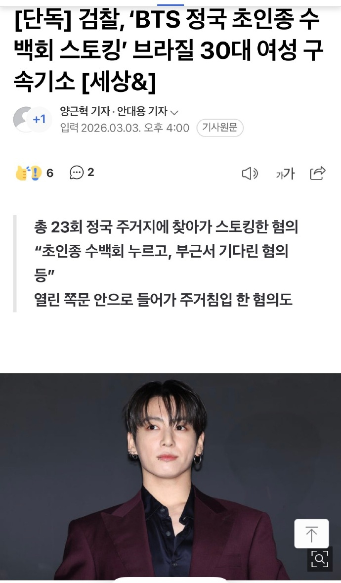 田柾国私生被捕 据韩媒,首尔西部地检女性儿童犯罪调查部于上月27日以违反跟踪处罚法、入室的罪名逮捕起诉了巴西国籍的30代女性A某。据悉,A某从去年12月7日到今年1月4日共23次访问田柾国居住地,按了数百次门铃,还在居住地附近等待田柾国,放置信件并跟踪。