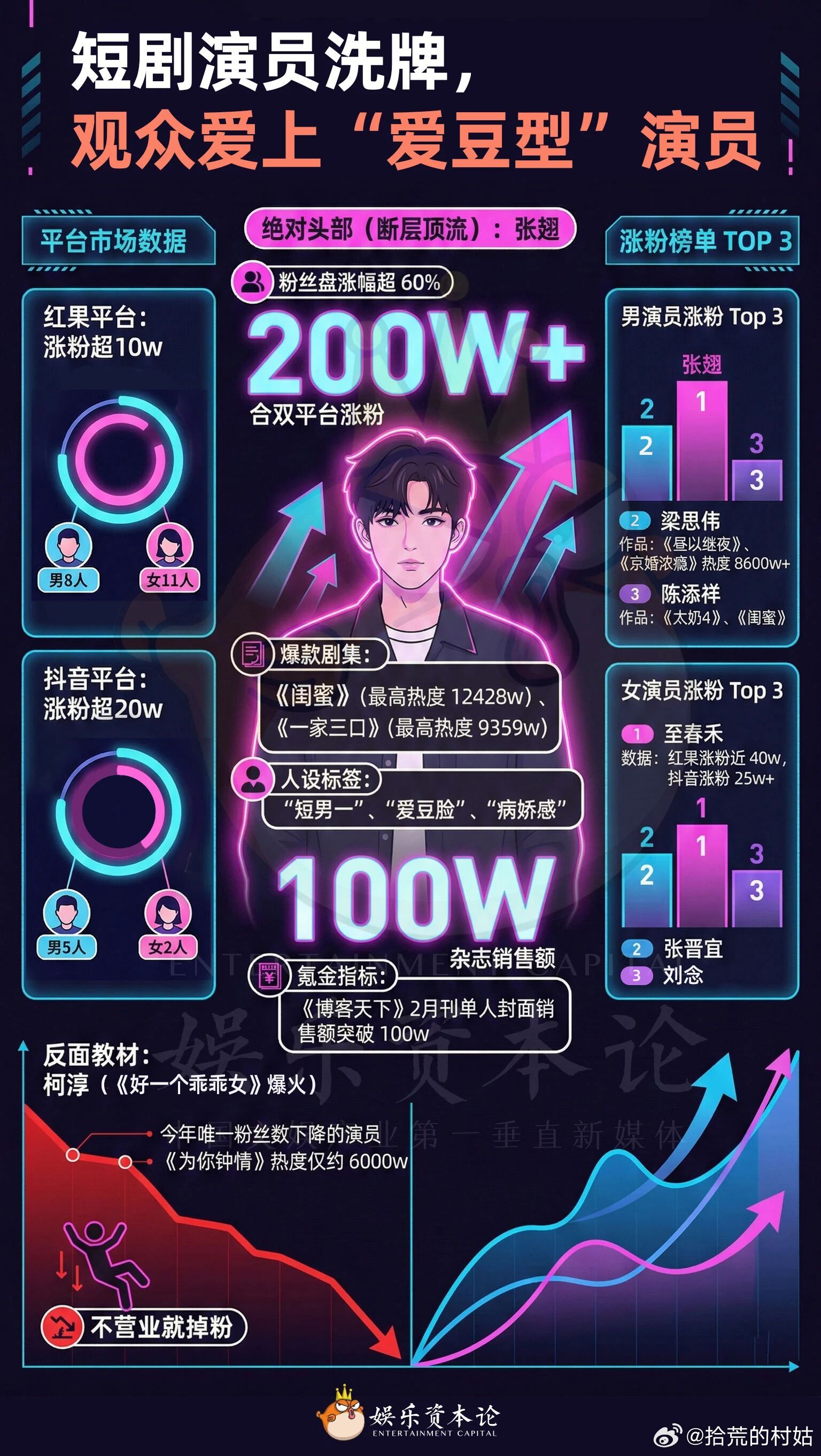 短剧演员爱豆化短剧演员偶像化转型以张翅、吴添豪为代表的新晋短剧顶流,正全方位复刻内娱流量艺人的成熟运营模式,短剧演员的偶像化转型步伐也在持续加快。这批新晋顶流从开通个人工作室账号、进行规范化的形象与运营管理,到日常保持高频次密集营业、维持与粉丝的高频率互动,再到登上地方卫视春晚、接连承接各类商业商务活动,整体发展路径与内娱流量爱豆高度契合。其商业发展路径也不再局限于短剧剧集本身,而是向杂志、商务、晚会等多领域拓展,让短剧演员的职业发展边界得到大幅拓宽。