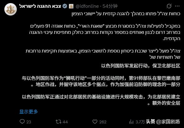 以色列宣布重开黎巴嫩副本,第91师地面进入黎巴嫩南部! 以色列国防军 (IDF) 表示:“在以色列国防军开展‘咆哮雄狮’行动的同时,以色列国防军士兵也在黎巴嫩南部开展行动,并在边境附近多个地点部署兵力,以加强前沿防御态势。 以色列国防军正努力为以色列北部居民建立额外的安全保障。以色列国防军正在对真主党恐怖分子基础设施进行定点打击,以消除威胁并阻止其渗透以色列领土的企图。 真主党恐怖组织选择代表伊朗政权袭击以色列,必将承担其行为的后果。以色列国防军绝不允许以色列平民受到伤害,并将继续采取行动保卫以色列国及其公民。” 来源:IDF