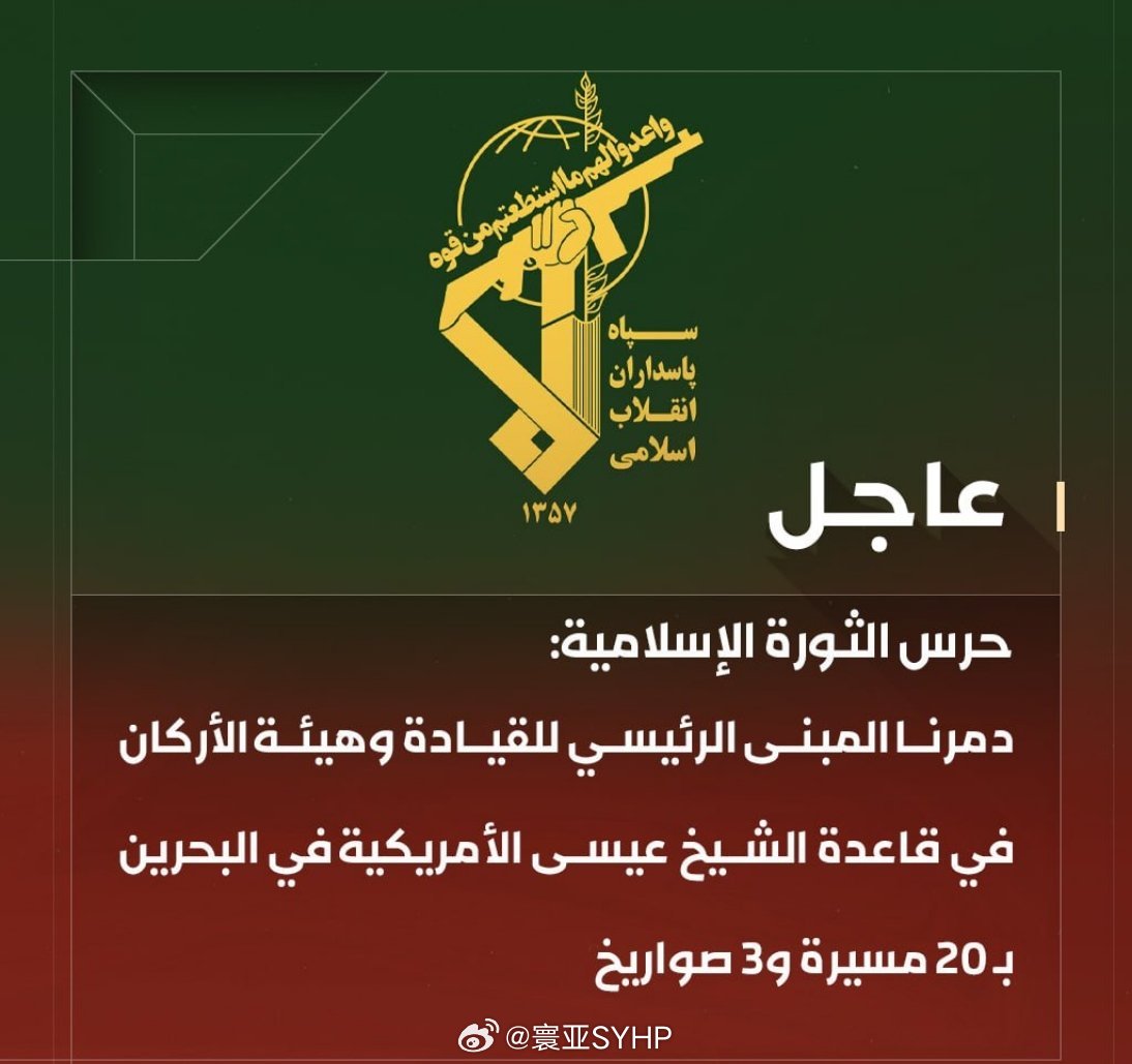 伊朗称击中了美空军基地大楼伊朗革命卫队在通告称:当日拂晓,通过大规模无人机和导弹袭击,袭击了巴林谢赫艾萨地区的美国空军基地。此次袭击中,20架无人机和3枚导弹击中并摧毁了该美军基地的海军指挥部大楼和燃料库。巴林和美国方面尚未发布任何细节或确认消息。