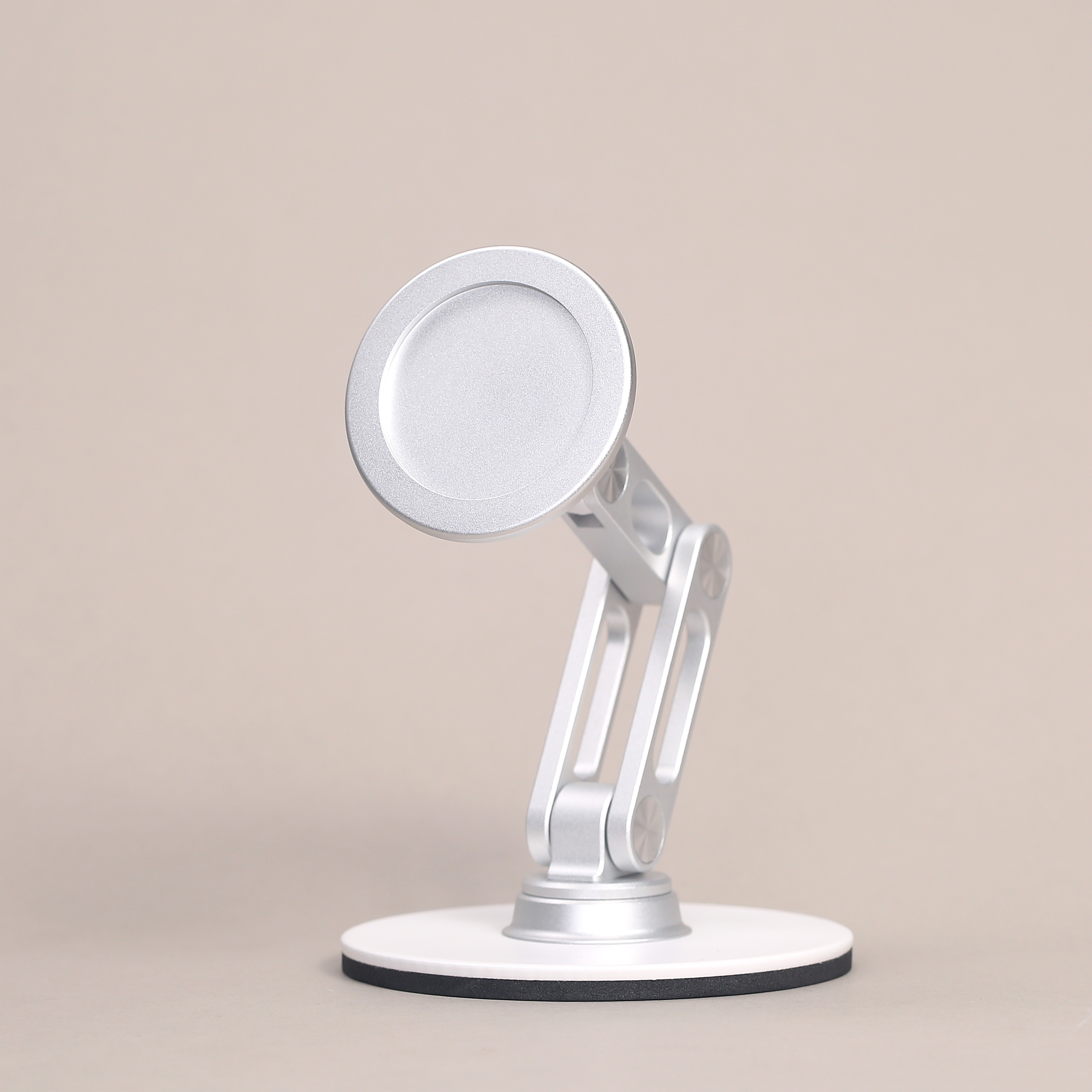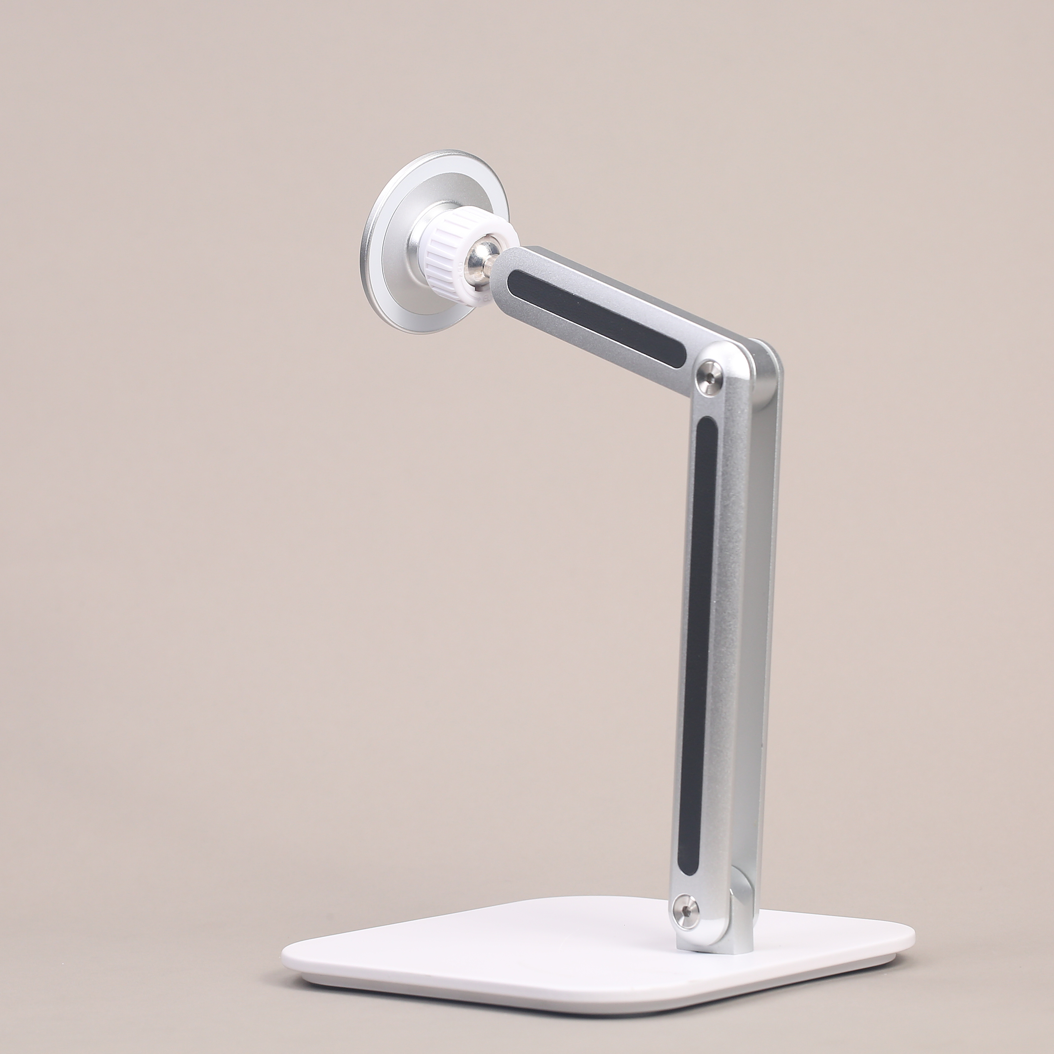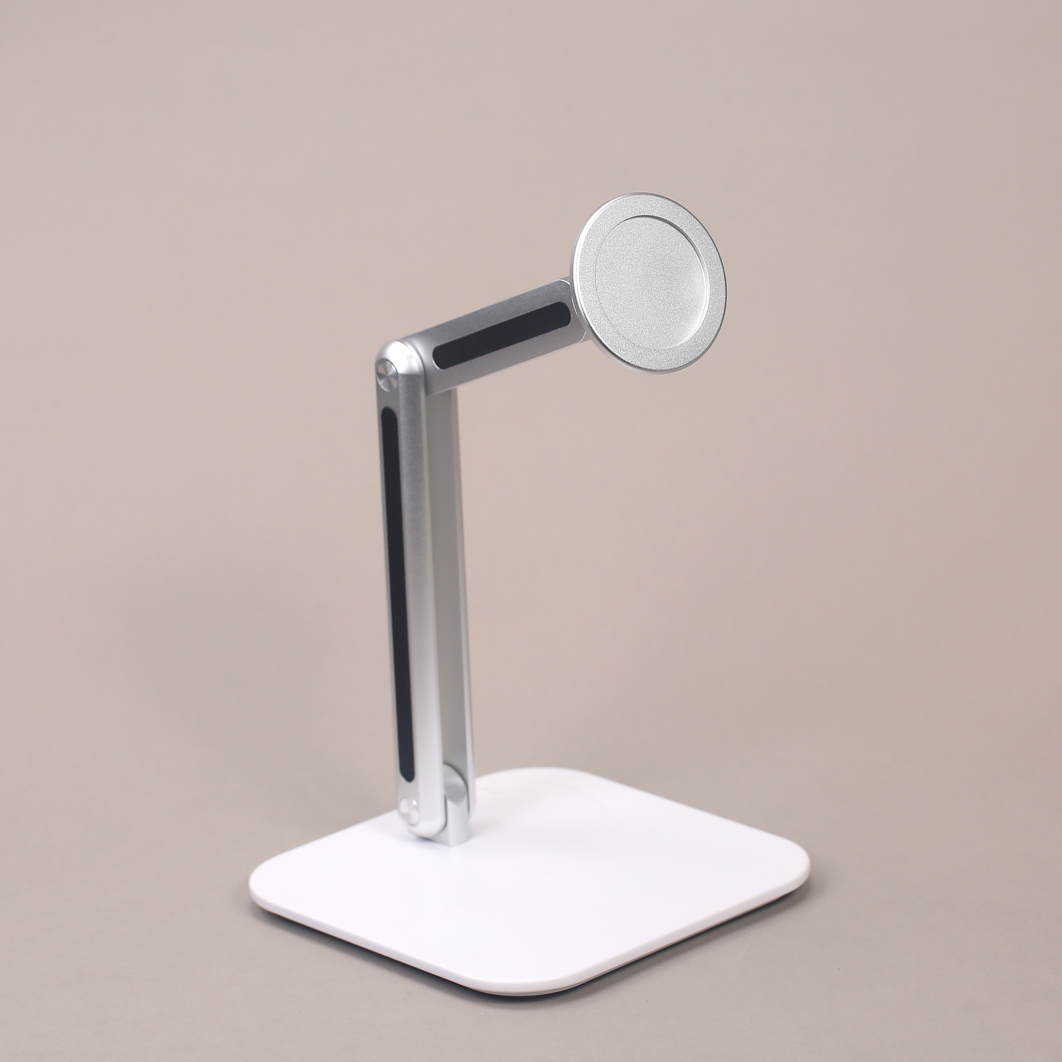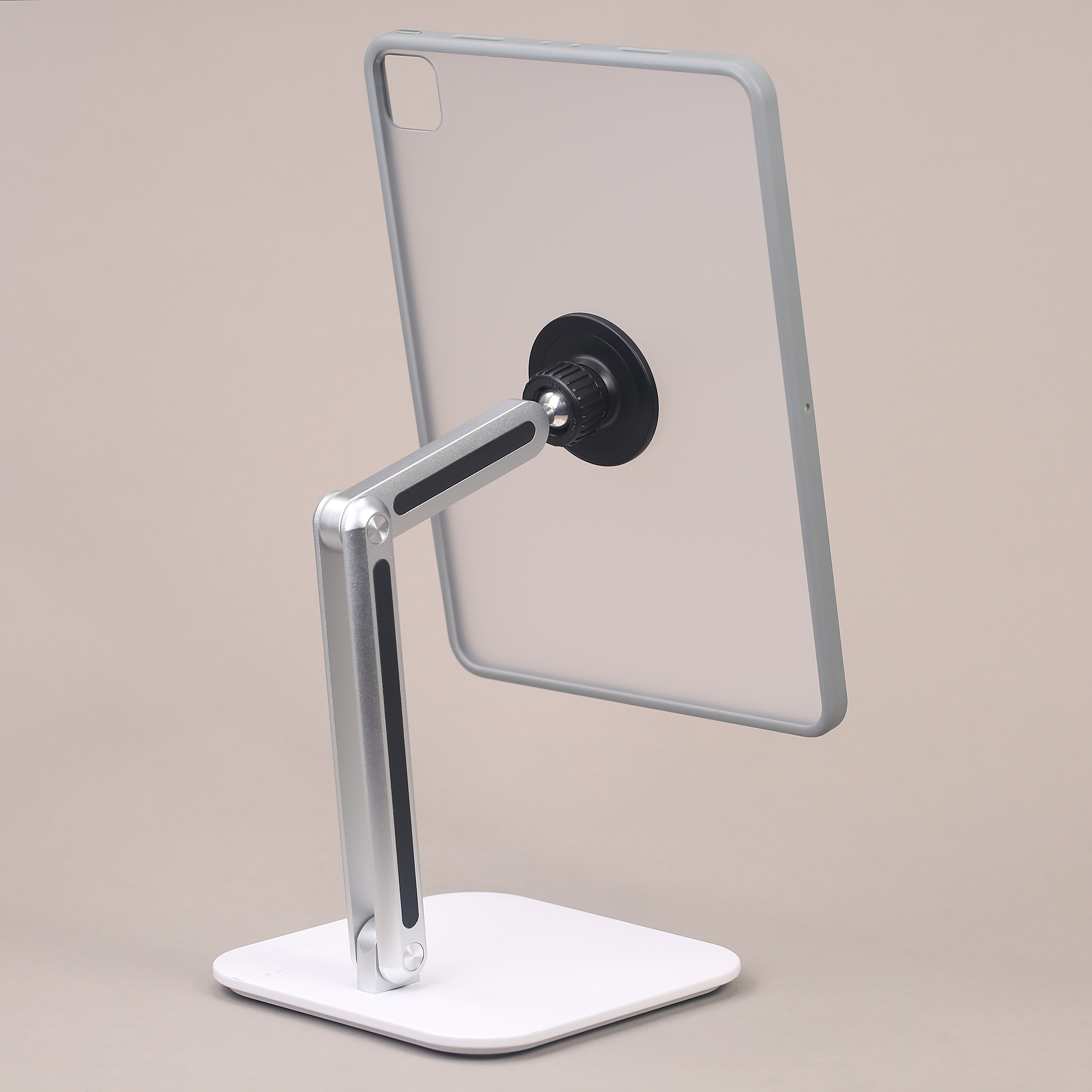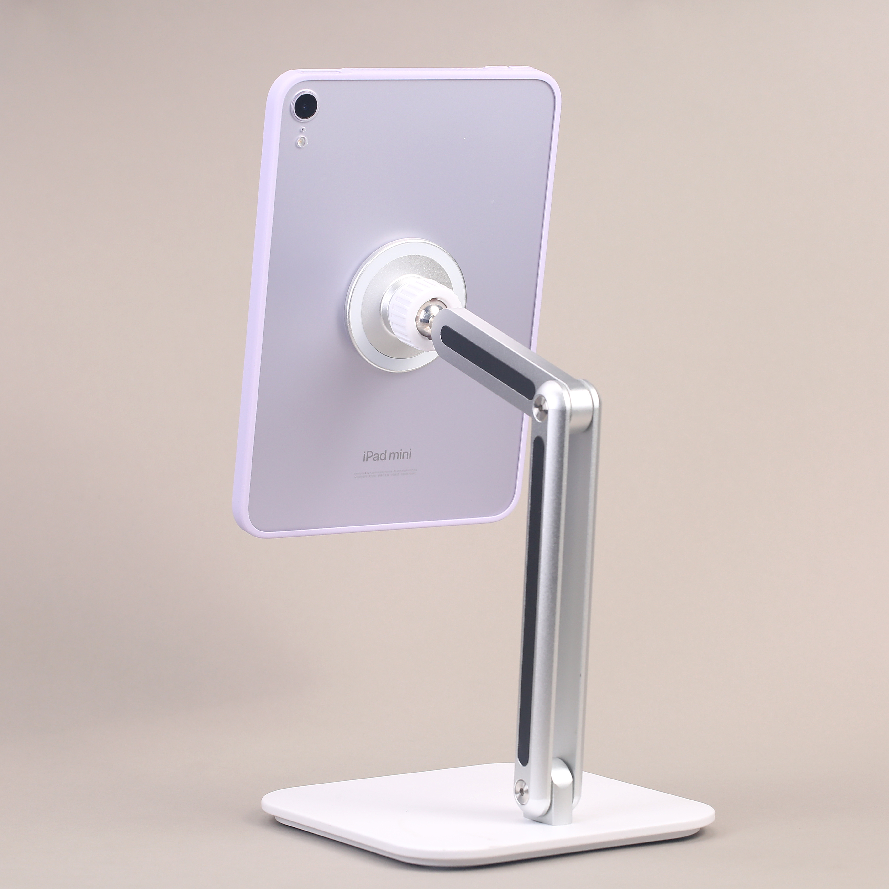 大家看到的是旗舰款磁吸头,磁吸强劲,铝合金材质一体化设计。它还有一个外挂组件,加装外挂后磁吸力翻倍(目前还不能展示),多大的平板都能吸得牢固。