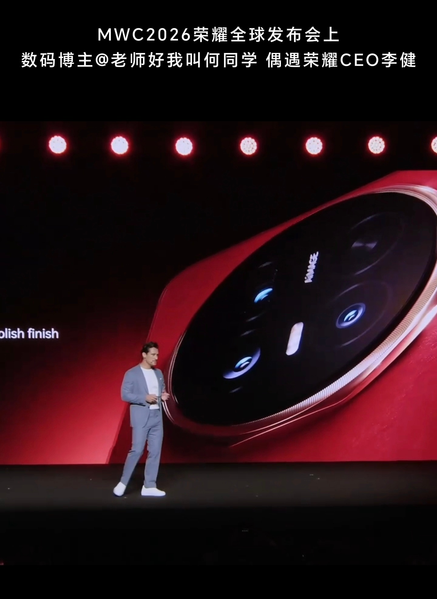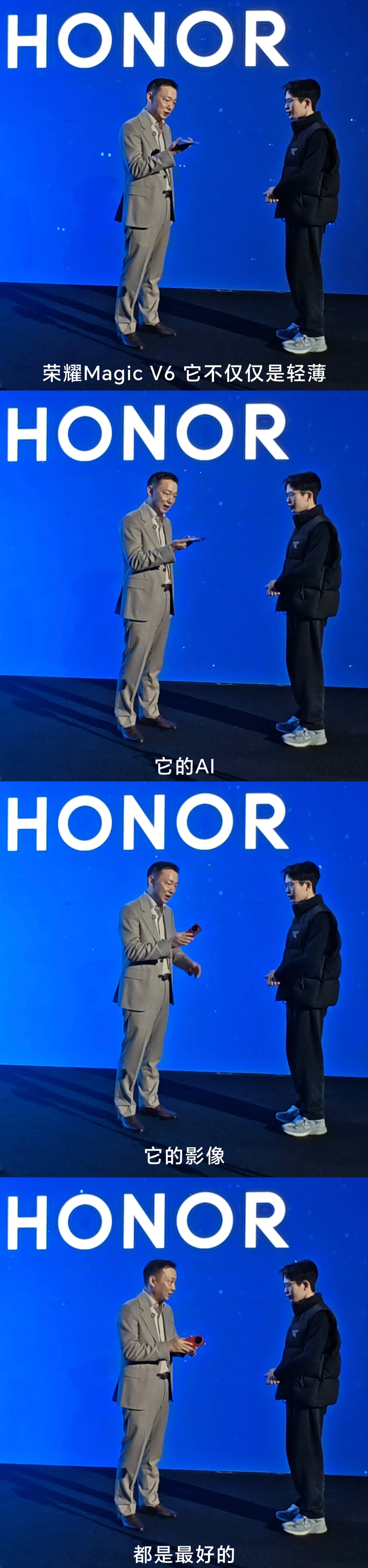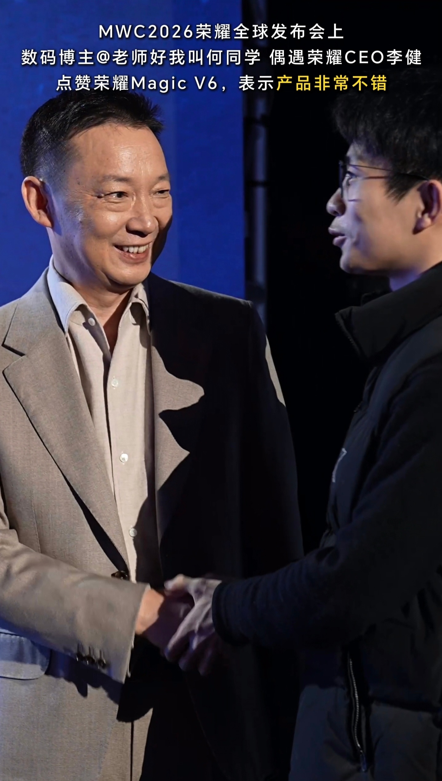 何同学说荣耀MagicV6确实非常不错 何同学在MWC2026上偶遇荣耀CEO李健,并盛赞荣耀Magic V6确实非常不错。子弹兄昨天也去荣耀授权体验店上手了荣耀Magic V6真机,8.75mm的机身确实非常轻薄,比很多直板手机都要薄,居然还塞进了一块超过7000毫安时的第二代青海湖电池!2800MPa超强度盾构钢铰链更是可以直接吊起一个成年人,强度个和韧性惊人。它还有满血第五代骁龙8芯片+IP68/IP69防尘防水+4320Hz超高频PWM调光的护眼屏幕+无线快充,配置非常全面和顶级,奥运冠军徐梦桃也非常认可和喜爱。果然,荣耀Magic V6是妥妥地冠军之选,对折叠屏的品质、配置和影像都有高要求的可以闭眼入了!对了,荣耀的机器人Robot和机器人手机Robot Phone,我也非常期待,真的太科幻和酷炫了。爱了爱了!