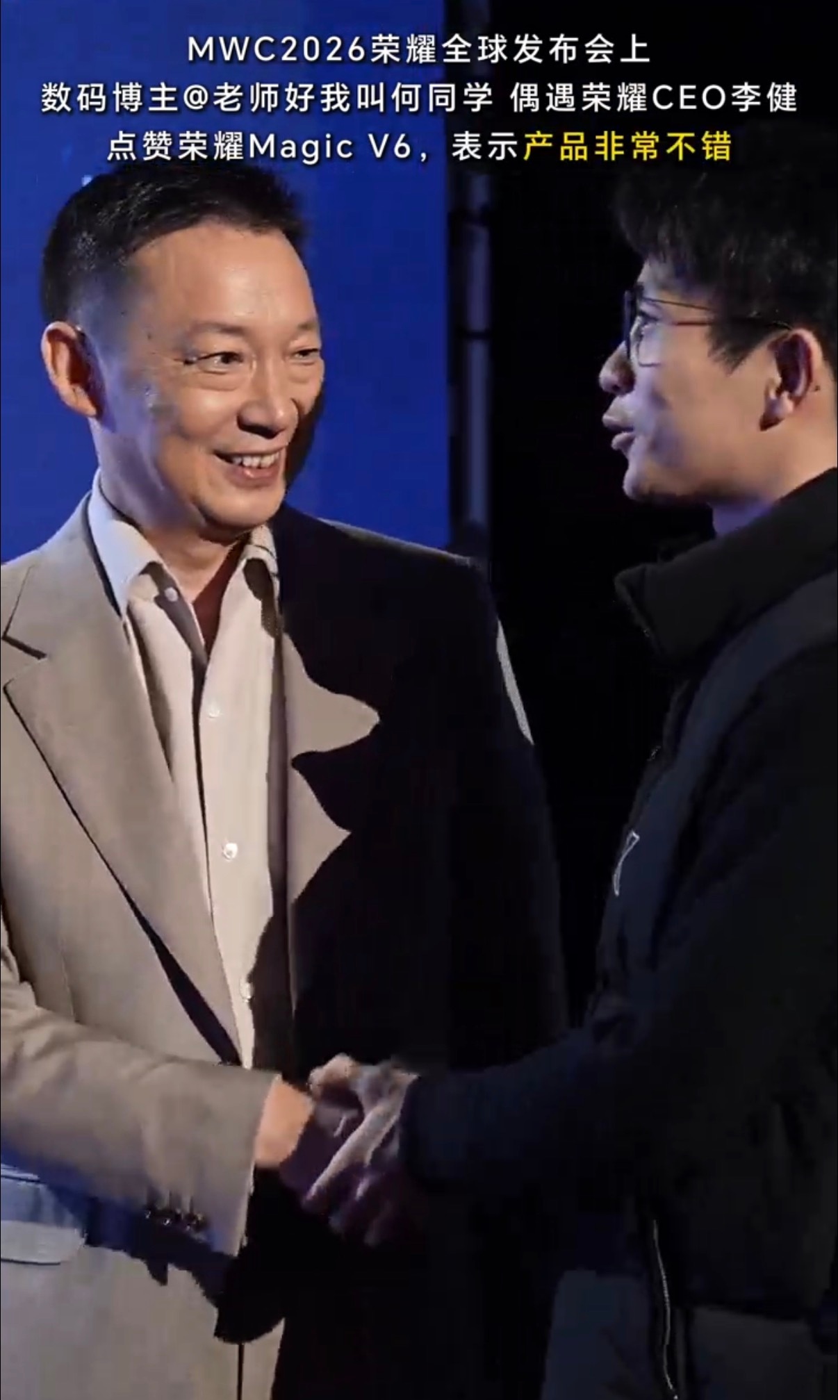 何同学说荣耀MagicV6确实非常不错 在巴塞罗那MWC现场,何同学偶遇了荣耀CEO李健,上手真机之后直接夸:荣耀Magic V6 确实非常不错。