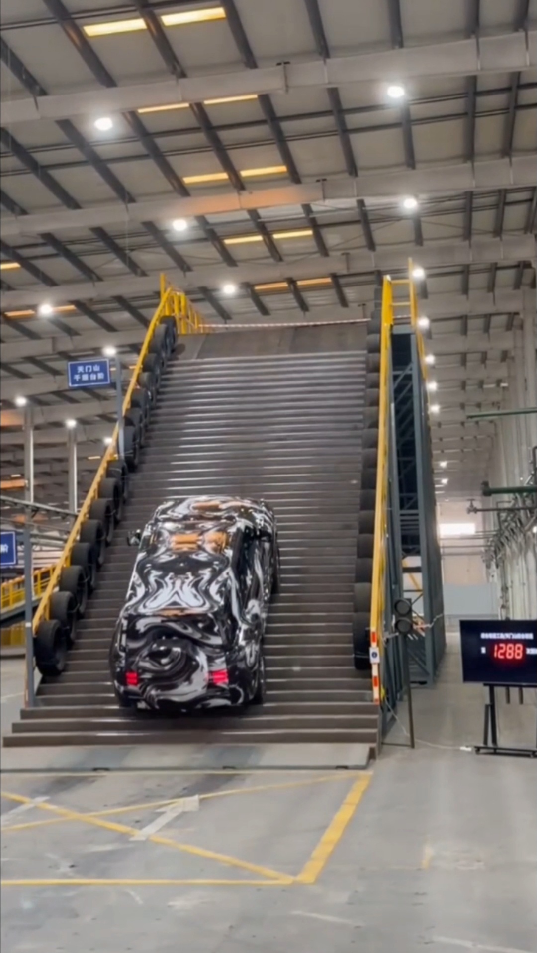 比亚迪把天门山天梯搬进了厂房 其实也是给行业打了个样,为了测试一台新车,比亚迪没去景区封路折腾,而是在自己家里,用钢板搭建了一个完全模拟天门山坡度,把张家界天门山的天梯复刻进了自己的厂房。