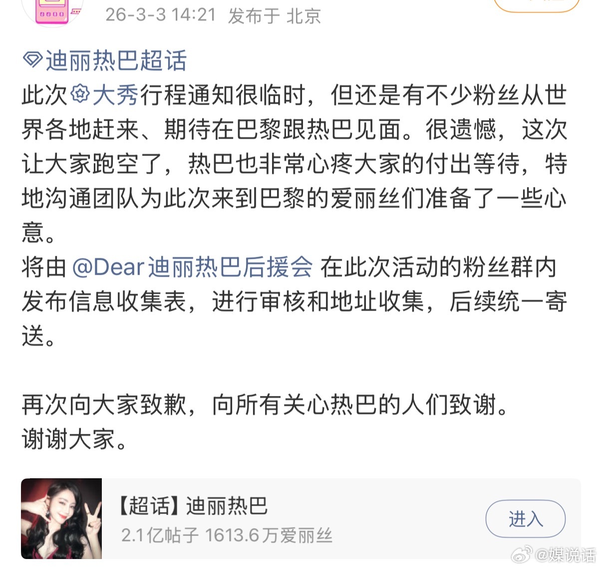 迪丽热巴团队的能力 迪丽热巴滞留迪拜缺席巴黎时装周后,团队要给去巴黎的粉丝送礼物补偿