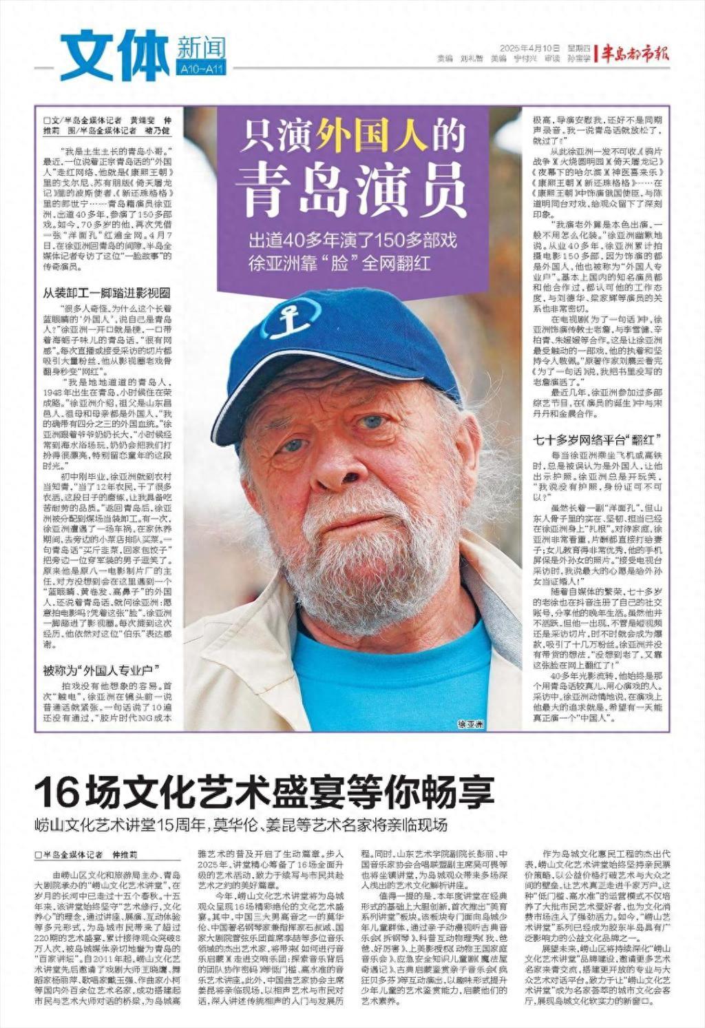 你看,一个从没出过国的中国人,却演了40年洋人。 40年前,他在青岛码头扛大包。 八一厂的导演从旁边路过,就因为他这张欧洲脸,直接把他拉去拍了电影。 这一演,就是150多部戏。 他就是徐亚洲,一个地地道道的青岛小哥,1948年出生在青岛八大关附近的别墅区,一口海蛎子味儿的青岛话,比黄渤说得还溜,可偏偏长了一张标准的欧洲脸——蓝眼睛、黄卷发、高鼻梁,咋看都不像中国人。 很多人都好奇,他这长相到底咋来的?其实答案很简单,他的祖父是山东昌邑的地道中国人,祖母和母亲都是俄罗斯人,所以他身上有四分之三的外国血统,可按中国父系认同来说,他就是实打实的中国人,根在山东,家在青岛。 小时候的徐亚洲,可没少因为这张脸受委屈。上学的时候,身边的小朋友都把他当另类,欺负他、排挤他,说他是“洋鬼子”,久而久之,他就变得自卑厌学,哪怕再不想学,也还是硬着头皮读完了初中。16岁那年,响应“上山下乡”的号召,他跟着一群城里青年,去了烟台海阳的农村当知青,这一待就是12年。 谁能想到,从小在城里长大的他,到了农村居然啥都能干,撒种、锄地、挑大粪、喂牲口,不管多苦多累的农活,他都扛了下来。 可农村的日子太无聊,他只能靠喝酒打发时间,慢慢就染上了酒瘾,几乎每天都要喝上几杯。直到1978年,30岁的他才终于有机会回到青岛,本以为能过上安稳日子,可找工作却处处碰壁,就因为这张“洋人脸”,没人愿意录用他,最后只能靠母亲帮忙,找了一份煤场装卸工的活,每天在青岛码头扛大包,干最苦最累的力气活,挣最辛苦的钱。 可命运就是这么捉弄人,福祸相依这句话,在徐亚洲身上体现得淋漓尽致。1979年的一天,他和煤厂司机下班后喝了酒,司机喝醉了还要开车,他想搭个顺风车,没想到司机直接把车开到了河里,他受伤严重,头部脑震荡,脸上被缝了100多针,在医院躺了整整4个月,后来又被母亲带到上海治疗,整整半年多才慢慢恢复。 也正是这场车祸,彻底改变了他的人生。从上海治病回到青岛后,他在家静养,某天闲来无事,就去楼下小菜店买韭菜,操着一口地道的青岛话跟老板砍价:“老板,韭菜便宜点呗,回家包饺子吃!”这话一出口,旁边一个穿军装的男人直接笑出了声,这人不是别人,正是原八一制片厂的主任赵凯,青岛本地人,当时正在青岛取景。 赵凯盯着徐亚洲看了半天,越看越惊喜,他怎么也没想到,会遇到一个长着外国脸、却说着地道青岛话的中国人,当即就拍了拍他的肩膀:“小伙子,跟我去拍电影不?你这张脸,不用化妆就能演洋人!”徐亚洲当时都懵了,他这辈子都没跟电影沾过边,连电影院都没去过几次,咋敢拍电影?可赵凯软磨硬泡,说就试试,不行再回来扛大包,他心一横,就答应了。 1983年,徐亚洲参演了自己的第一部电影《火烧圆明园》,正式出道,同年还在《战地之星》里饰演美军上尉,这也是他第一次担任主要角色。可刚开始拍戏,他就闹了不少笑话,首次“触电”的他,一面对镜头就紧张,一说普通话就卡壳,一句话说了10遍还没通过。要知道,那时候拍电影用的是胶片,NG成本极高,导演急得满头大汗,还好不是同期声录音,后来他试着用青岛话念台词,反而放松了不少,一下子就过了。 从那以后,徐亚洲就一发不可收拾,开启了自己长达40年的“洋人专业户”演艺生涯。这些年,他合作过的大牌明星不计其数,刘德华、梁家辉、李雪健、宋丹丹、金晨,几乎国内知名的演员,都和他合作过,大家都特别认可他的工作态度,私下里关系也特别好。可很少有人知道,这个演了一辈子洋人的演员,从来没有出过国,连护照都没有,一辈子都扎根在青岛,过着普通人的生活。 不过,这张洋人脸,也给她带来了不少麻烦。每次过安检、坐高铁或者飞机,工作人员都会拦住他,让他出示护照。 如今,徐亚洲已经76岁了,因为身体原因,基本不再接电视剧了,偶尔会帮朋友拍一些电影和广告,虽然片酬不高,但足够他和家人生活,他说自己现在特别幸福,工作就是生活。 很多人都说,徐亚洲的人生太传奇了,从一个底层的码头装卸工,因为一张偶然被发现的脸,逆袭成演了40年戏的老戏骨,用自己的努力,养活了家人,也实现了自己的价值。他从来没有因为自己的外貌而自卑,反而把这份独特变成了自己的优势,用精湛的演技,演绎了一个又一个经典的洋人角色,让观众记住了他。 可他心里,一直有一个小小的心愿,就是希望有一天,能真正演一个中国人,一个不用靠外貌,只靠演技就能被观众记住的中国角色。这个演了一辈子洋人的中国人,用40年的时间,告诉我们:平凡人也能有不平凡的人生,不管你长什么样,不管你出身如何,只要努力、只要坚持,就一定能迎来属于自己的曙光。 他长着洋人脸,却有着一颗滚烫的中国心,一辈子没出过国,却把洋人演得入木三分,这份坚守和热爱,值得我们所有人敬佩。或许,他不是最有名的演员,但他一定是最特别的演员,他的故事,会一直被人们记住,他的坚持,也会一直激励着每一个努力生活的普通人。