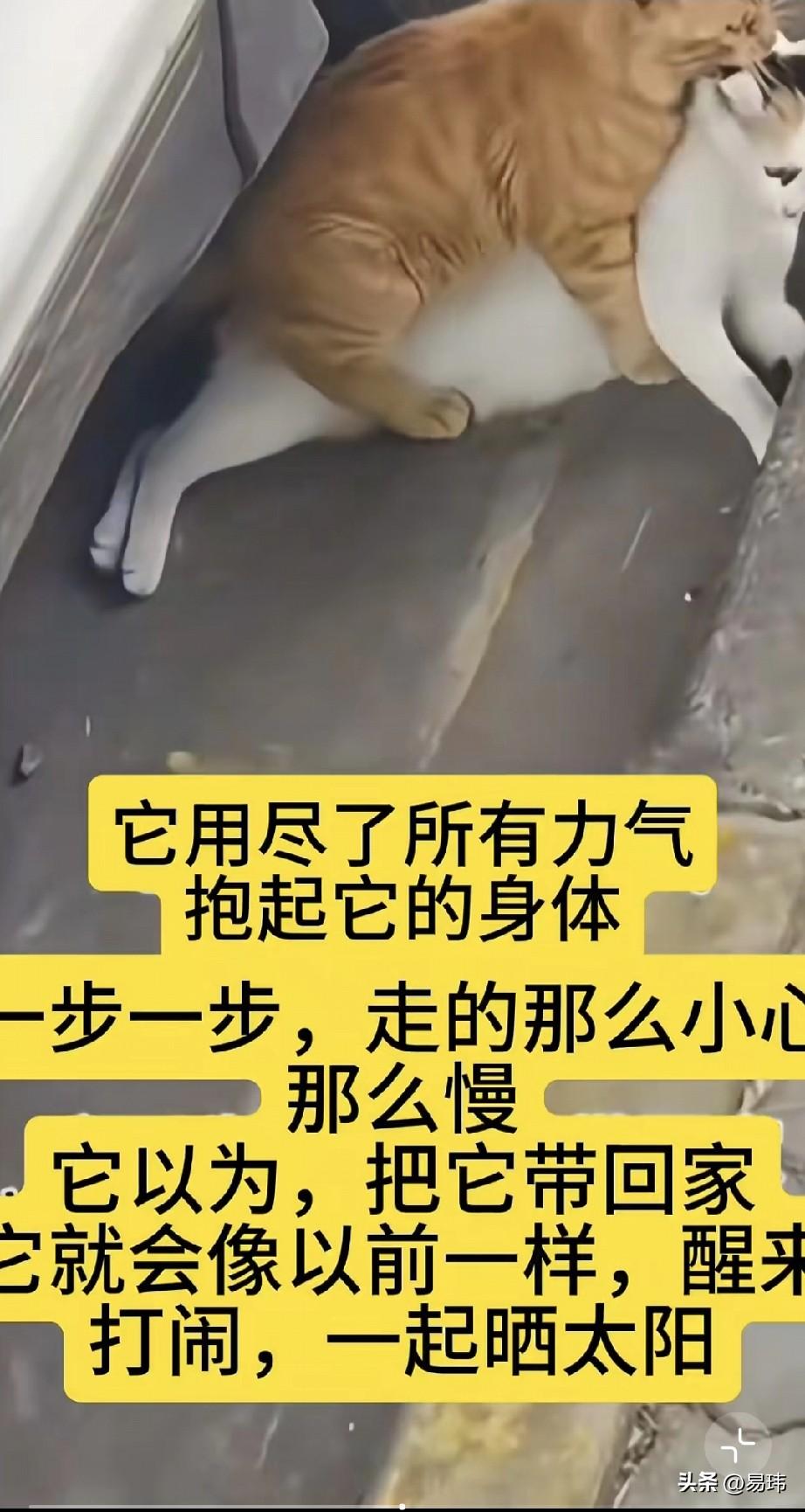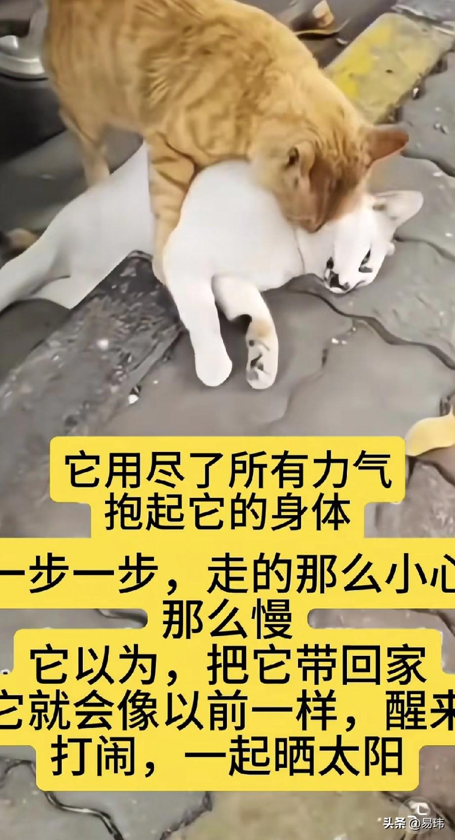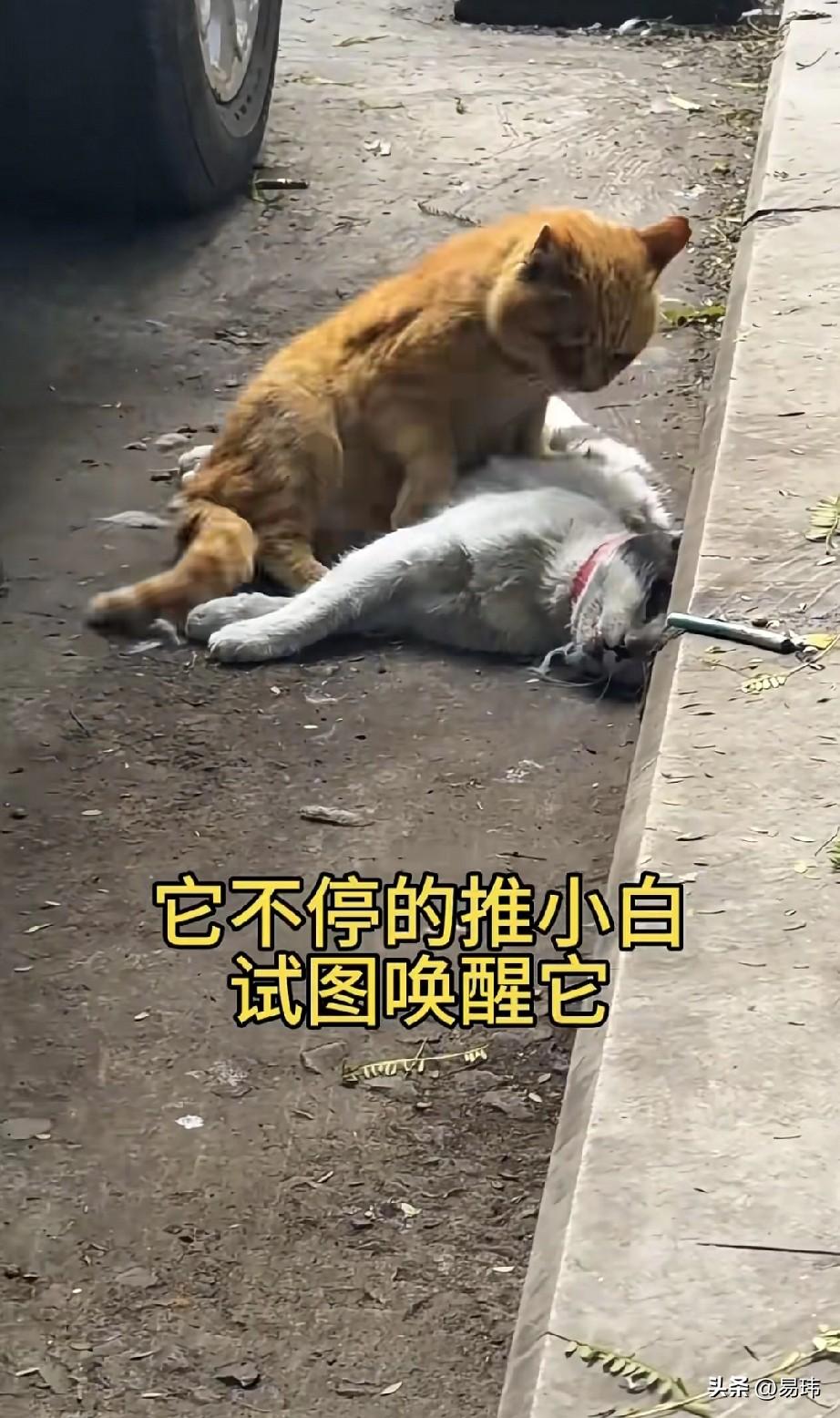泪目了!一只橘猫和一只小白猫是好朋友,它们一起流浪,一起玩耍,一起晒太阳,非常开心幸福。可天有不测风云,这天在过马路的时候,小白猫不幸被车撞了,看着倒在路边一动不动的小白猫,伤心的小橘猫一直守护在它的身边。 它不停地推着小白猫,试图唤醒它,它不懂什么是死亡,只知道拼命推它,想把它叫醒,可小白猫依旧毫无反应。它只好用尽所有力气抱起小白猫的身体,一步一步吃力的往它们的家拖,它以为只要回家休息会儿,小白猫就会醒来,它们可以继续一起玩耍,一起晒太阳。 而这一幕被一位善良的小姐姐看在眼里,顿时心生怜悯之心,于是决定帮助橘猫安葬了小白猫,而小姐姐安葬小白猫的时候,橘猫一直蹲在那里看着,似乎终于明白小白猫已经走了,它以它的方式给它告别。最终小姐姐收养了小橘猫,也给它认识了新的朋友。