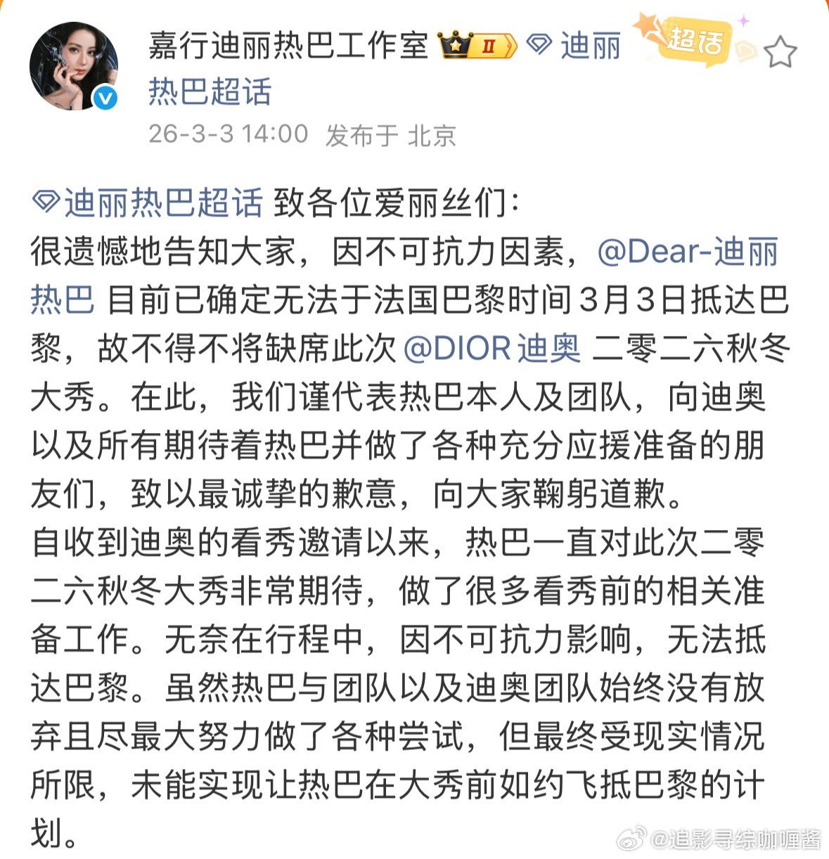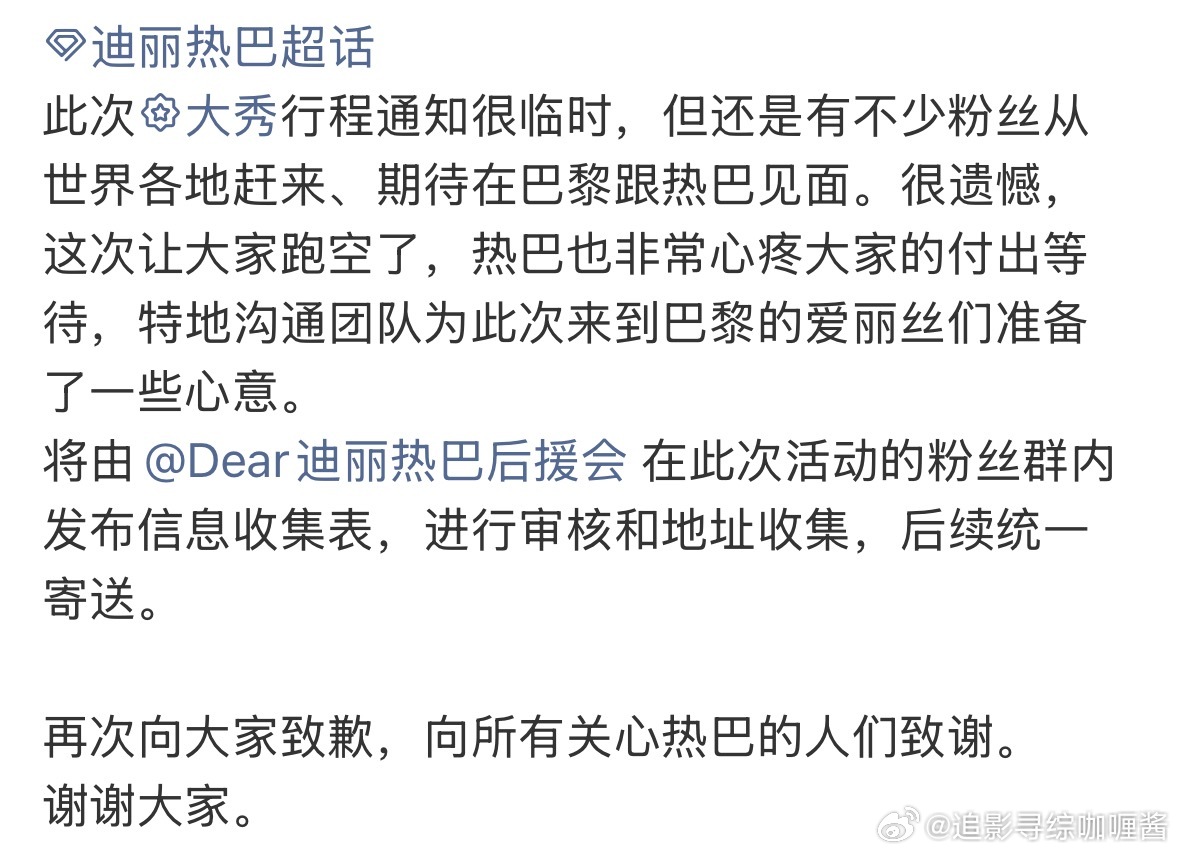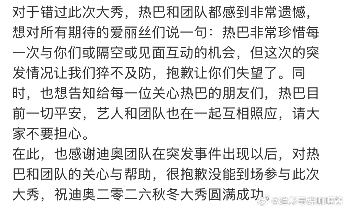 迪丽热巴工作室称因不可抗力因素不能参加本次巴黎时装周了目前热巴和团队在一起是安全状态,已离开中东地区为此次前往巴黎的粉丝,热巴为其准备了一些心意平安就好,平安最重要‼️迪丽热巴 无法抵达巴黎迪丽热巴将缺席时装周