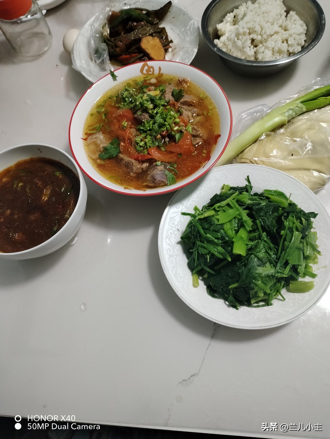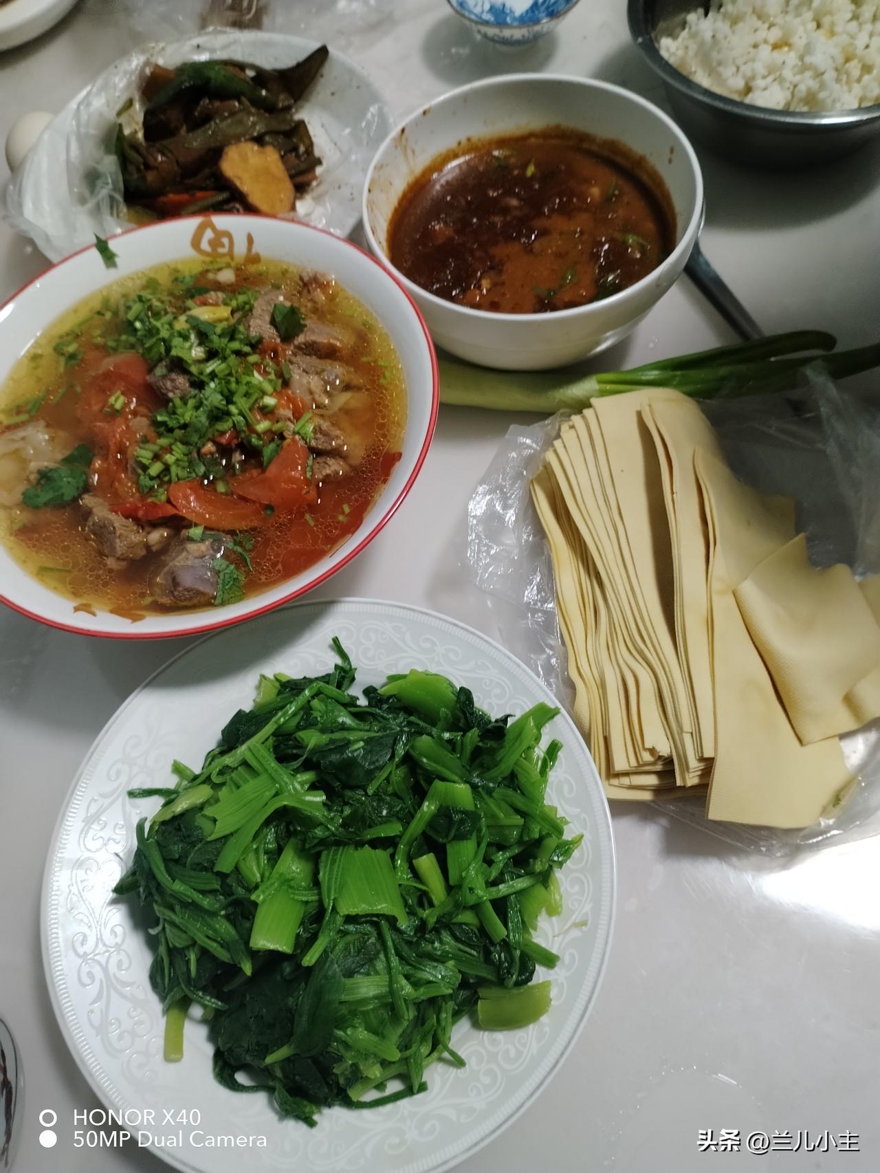今天是元宵节,上午我卖苹果,下午回家做了点饭。咱也过过节。没啥好吃的,炖了羊肉西红柿,羊肉是从老家拿回来的,也是老公买的,没空吃。 羊肉泡了很久还是有血水,后来又焯了一遍,又洗了很多次。放了西红柿和香菜以后感觉太有食欲了。 做了一碗肉酱,买了干豆腐,焯了菠菜。老公还买了芥菜疙瘩花了5元钱,齁咸的。我给买了小咸菜花了3.2元。干豆腐5元,菠菜是昨天买的。煮了高粱米饭。 天南地北大拜年 今天的花费真少,但是吃的超级饱!
