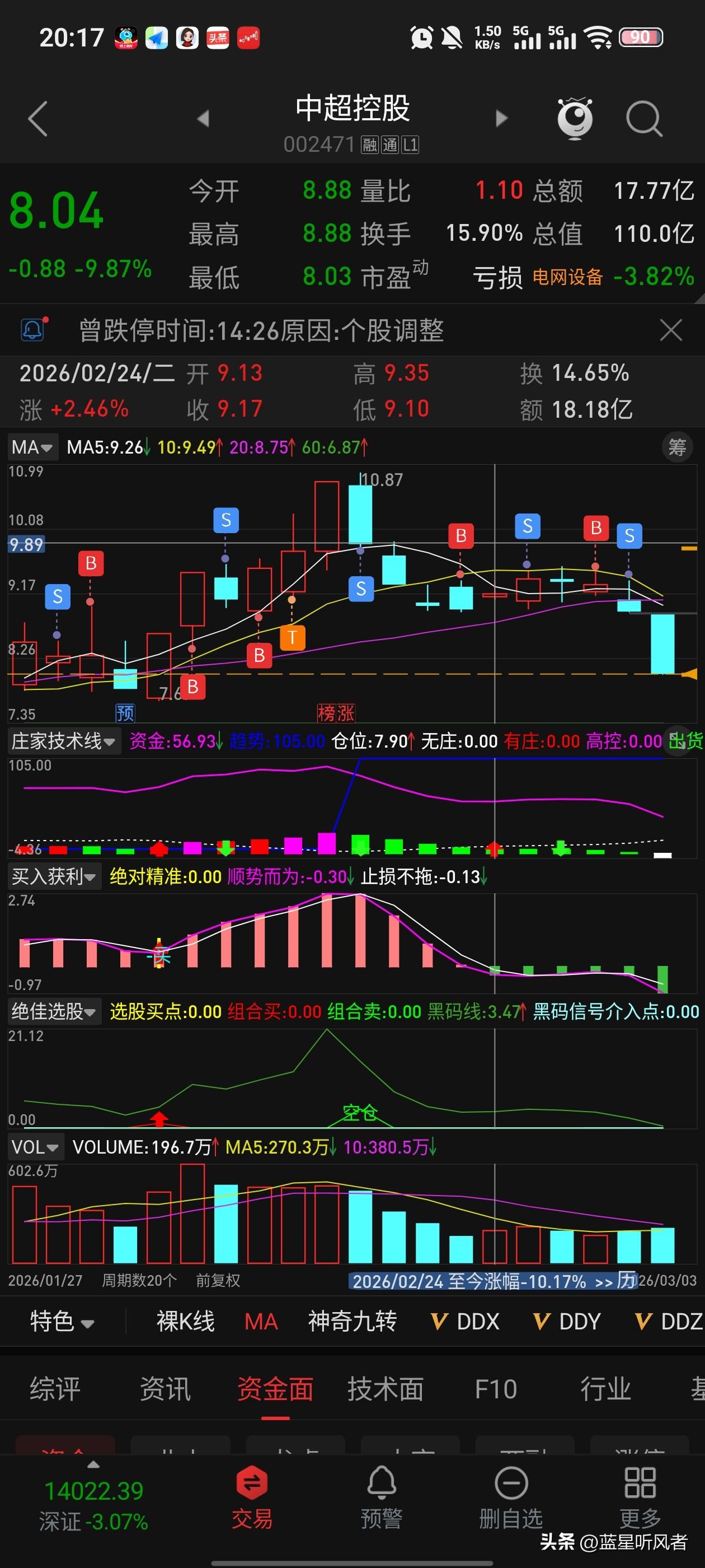 今天是元宵节了!外面偶尔传来稀稀拉拉的烟花礼炮声。先祝大家元宵节快乐!阖家幸福!股市长虹! 今天老A还是三桶油,航运港口,煤炭开采加工,三马车。其他的板块。一言难尽! 中超控股昨天出了,今天就飞流直下三千尺!你们说明天会不会还下一站?回调到7块5附近? 今天全靠进了中远海控拉回割肉亏本的,怒赚62块!买几瓶饮料和汤圆过节稳了!明天的行情会怎么样?拭目以待吧!