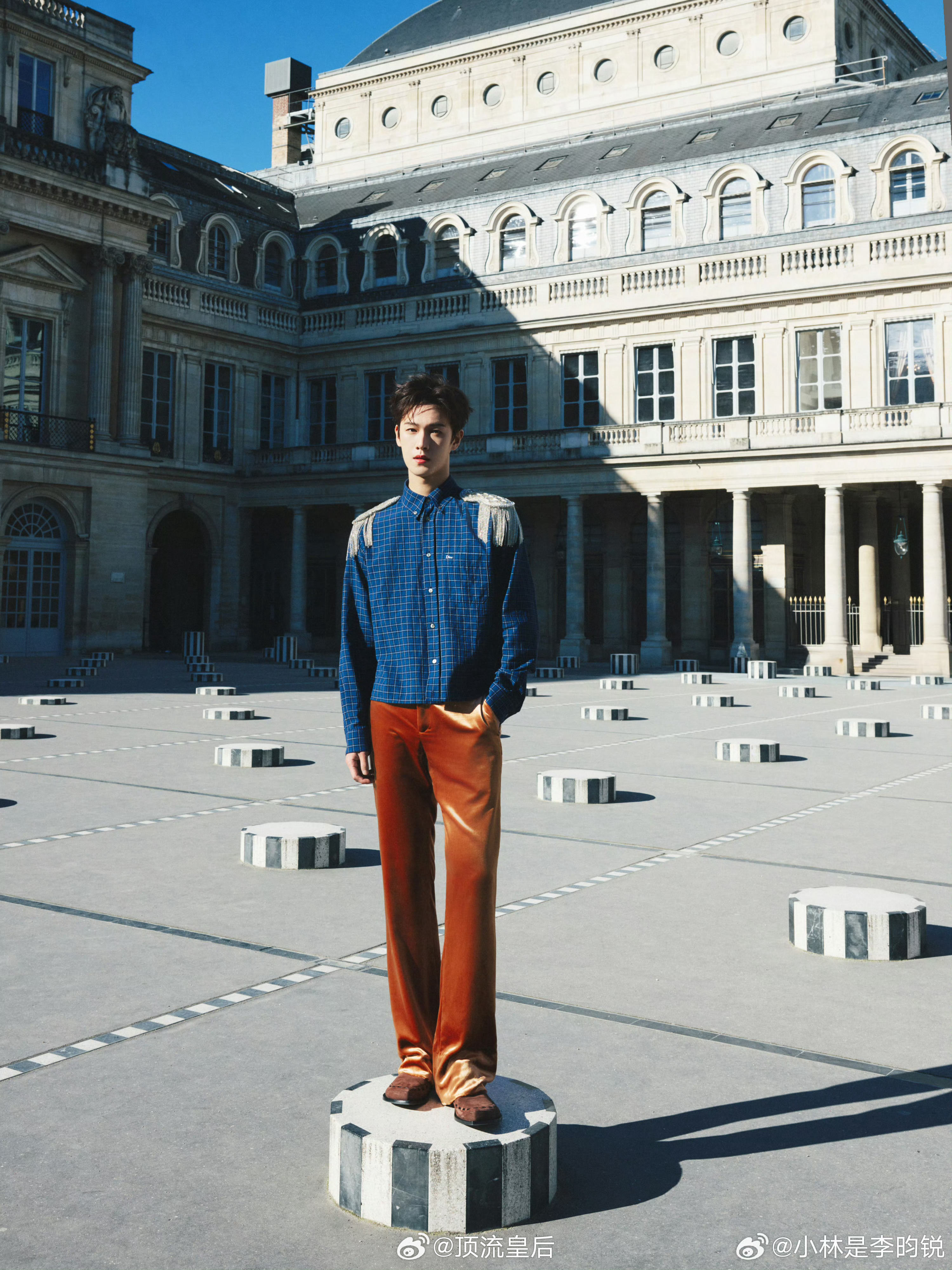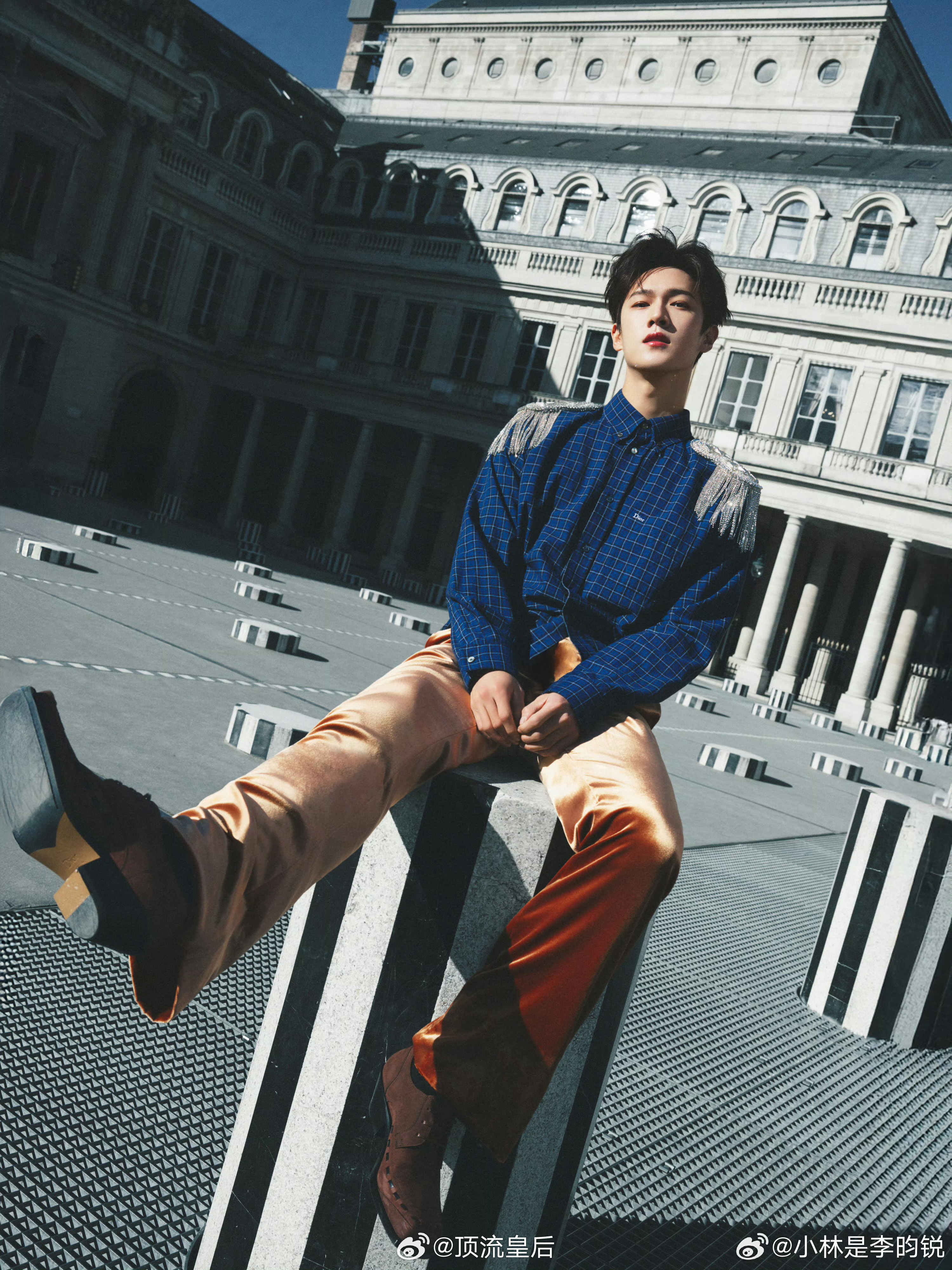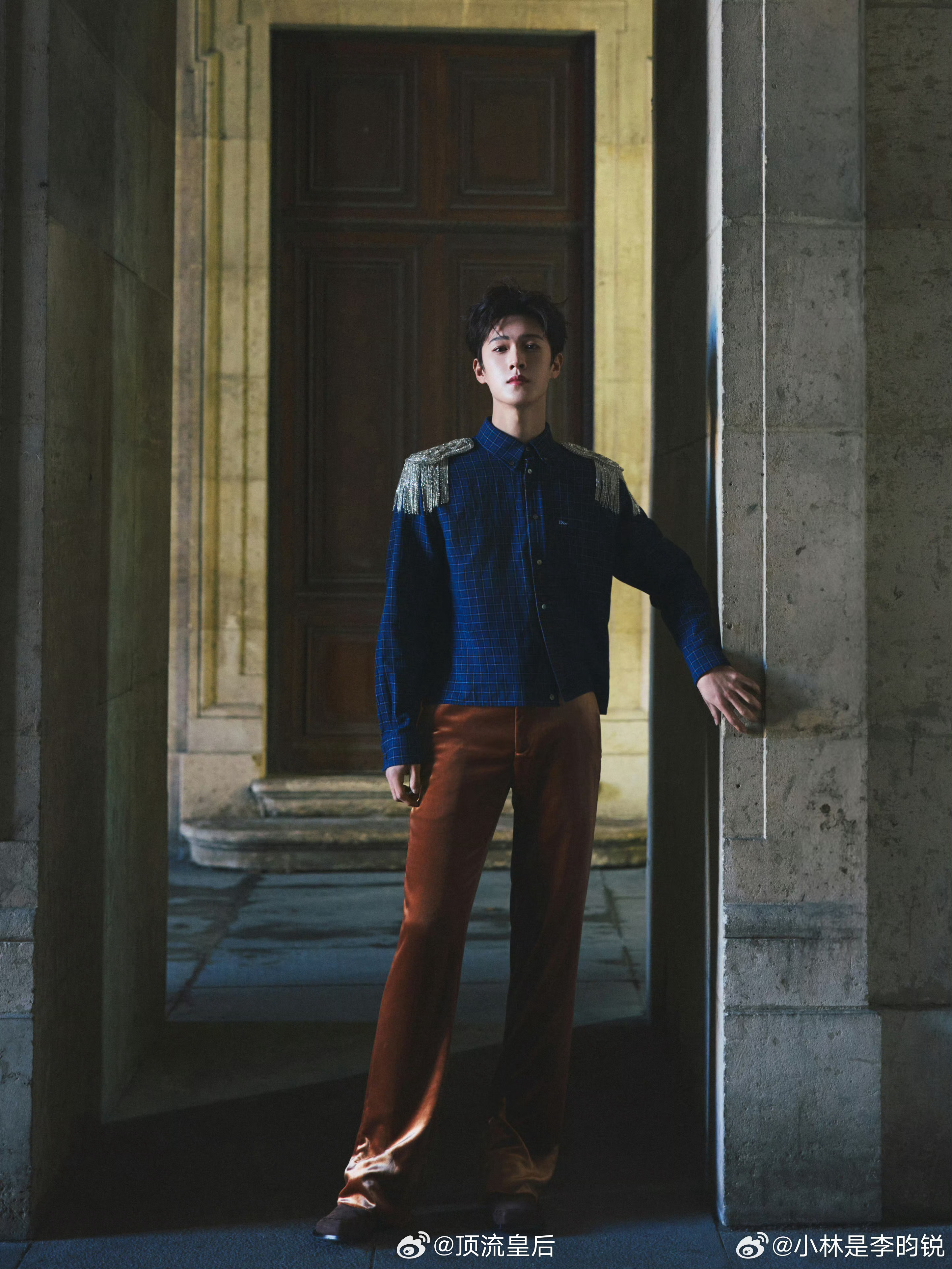 今天的李昀锐完全是Dior王子,肩章+丝绒长裤的搭配贵气十足,简约而不简单。