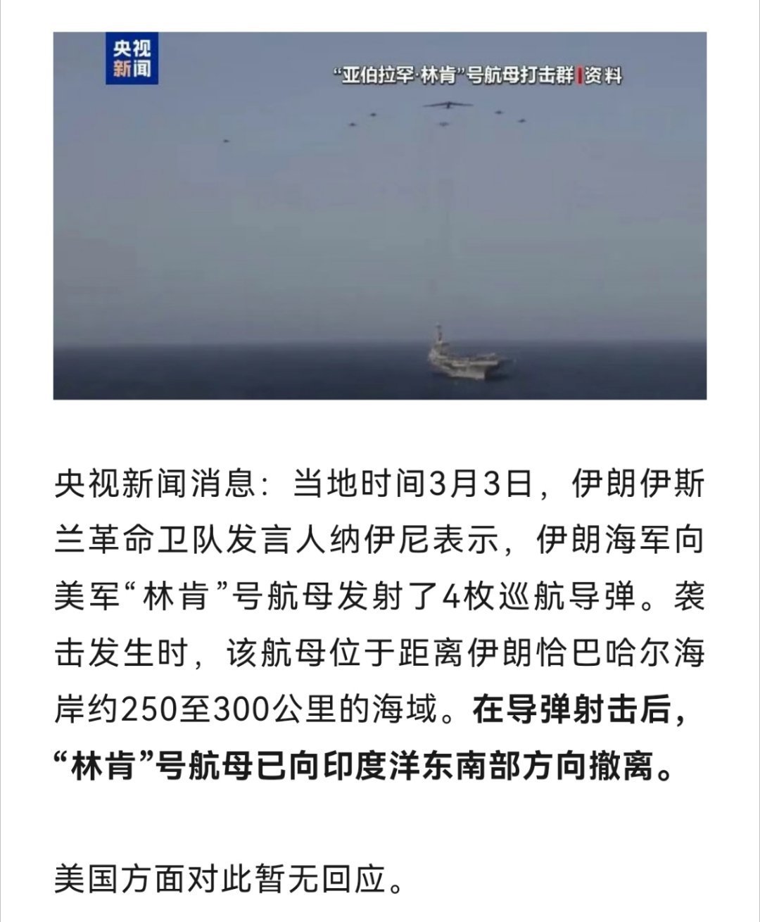 袭击发生时,“林肯”号航母位于距离伊朗恰巴哈尔海岸约250至300公里的海域,该航母已向印度洋东南部方向撤离。