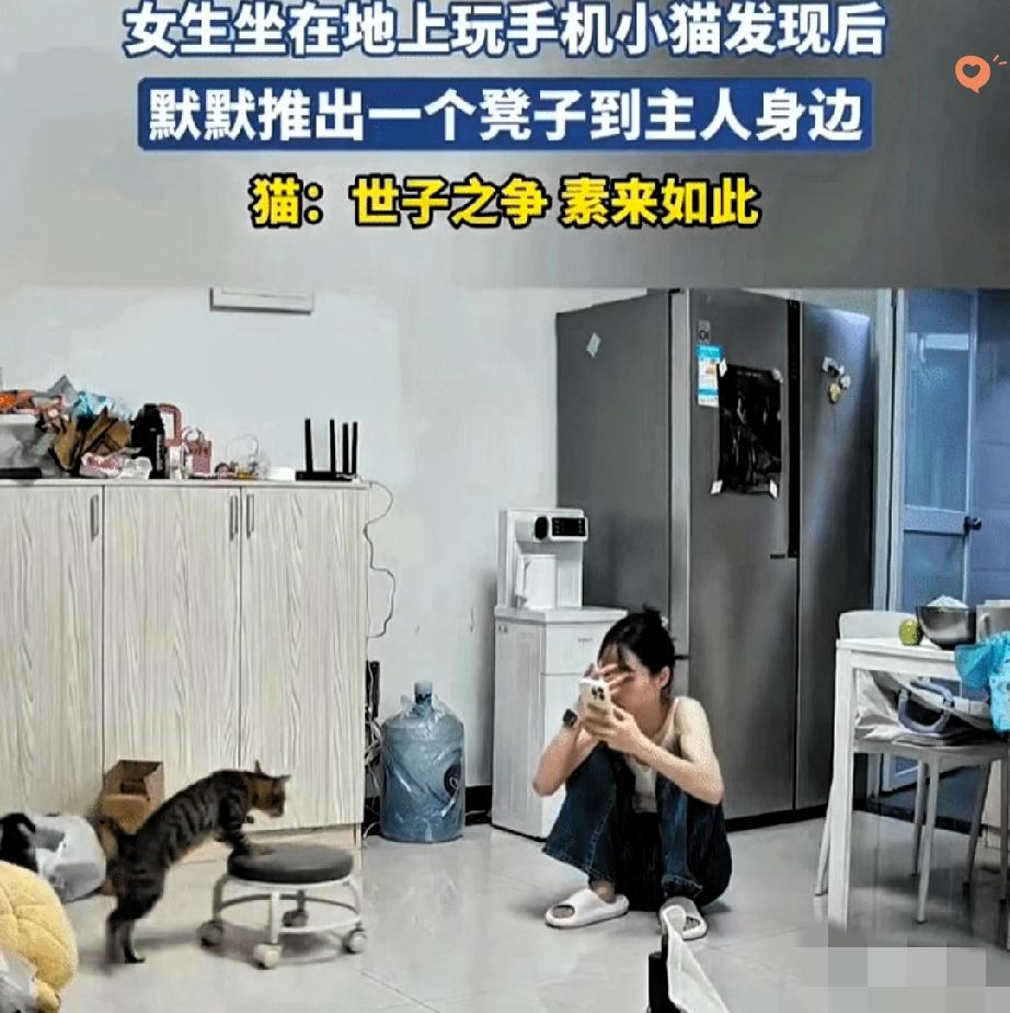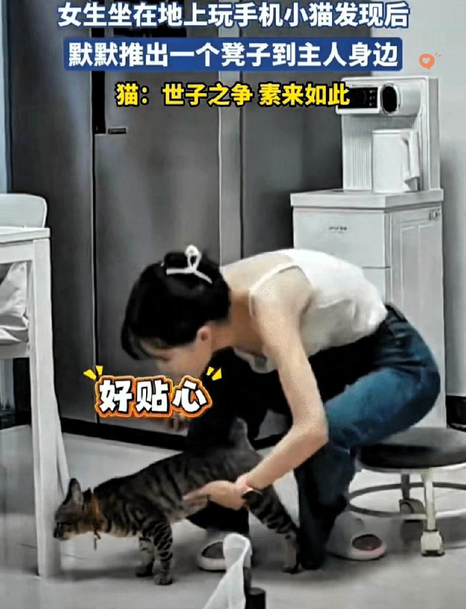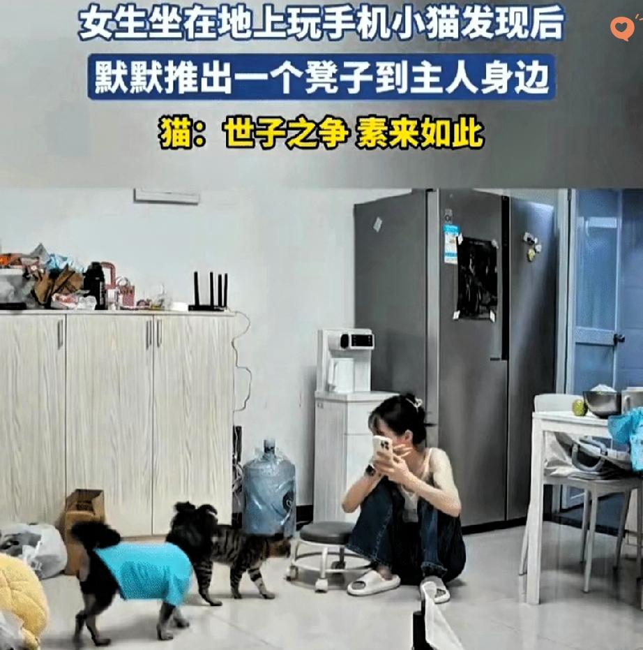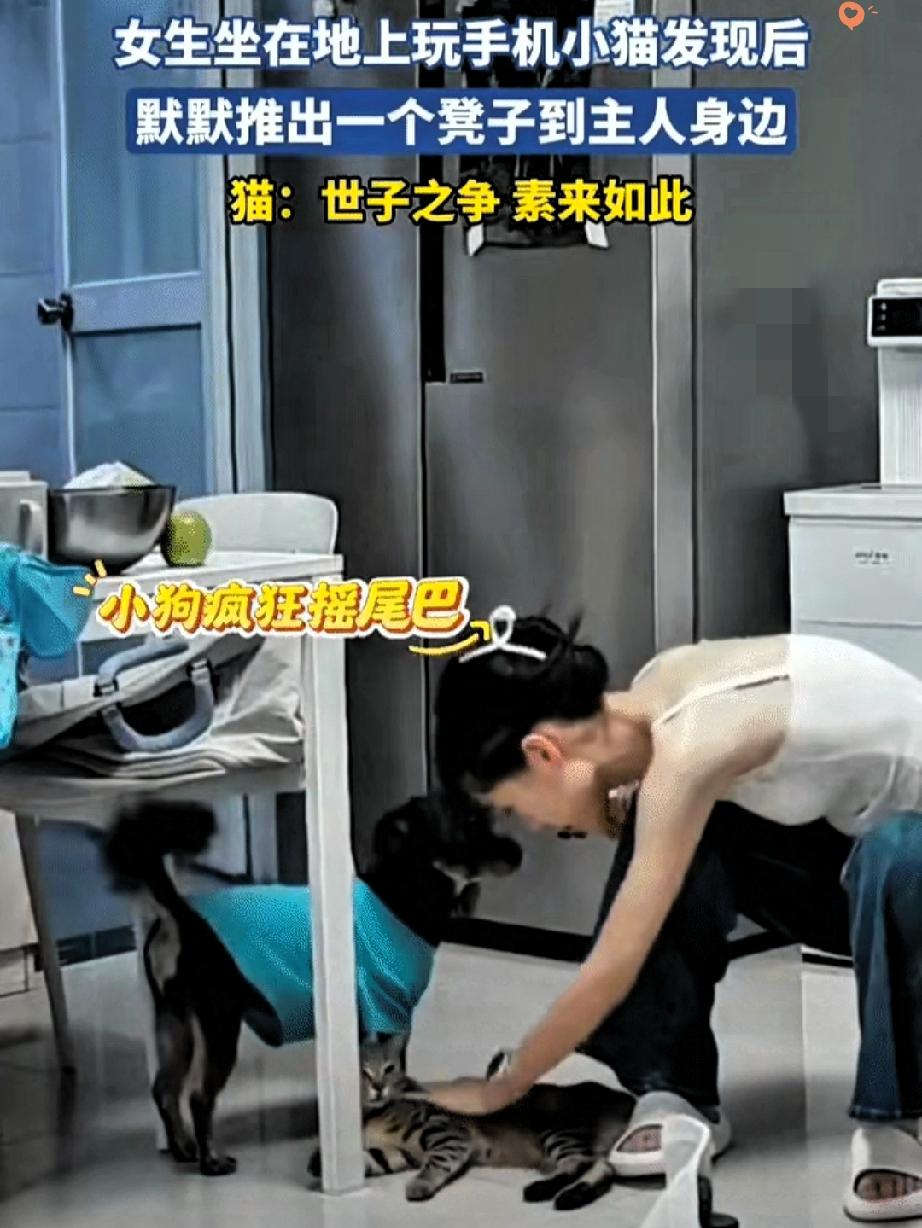 这只狸花猫也太会疼人了吧! 女生坐在地上玩手机,猫咪看在眼里,默默走过来,一把把小凳子推到她身边。 那动作自然又贴心,仿佛在说:地上凉,快坐上来。 被主人温柔抚摸夸奖的时候,小猫咪一脸得意,而旁边的狗狗只能眼巴巴看着,尾巴摇个不停,满眼都是羡慕,仿佛在委屈:我也想讨好主人,居然被抢先了! 都说狸花猫是经过千百年筛选出来的小机灵,果然名不虚传。 它们聪明、懂事、还特别通人性,平时看着高冷,关键时候比谁都暖心,妥妥的猫界情商天花板。 养一只这么会关心人的小猫咪,也太幸福了吧! 你家猫咪有没有做过让你瞬间心化的贴心小事?