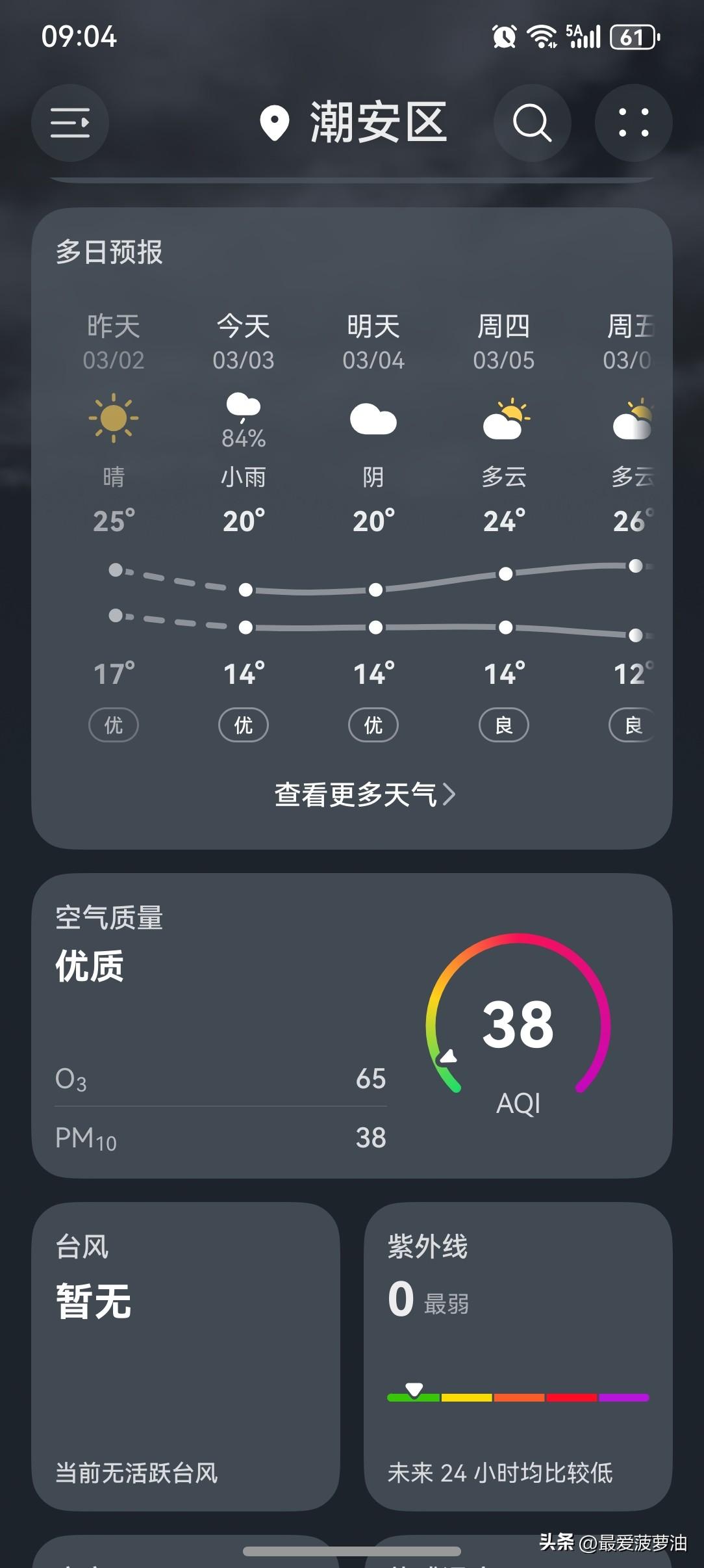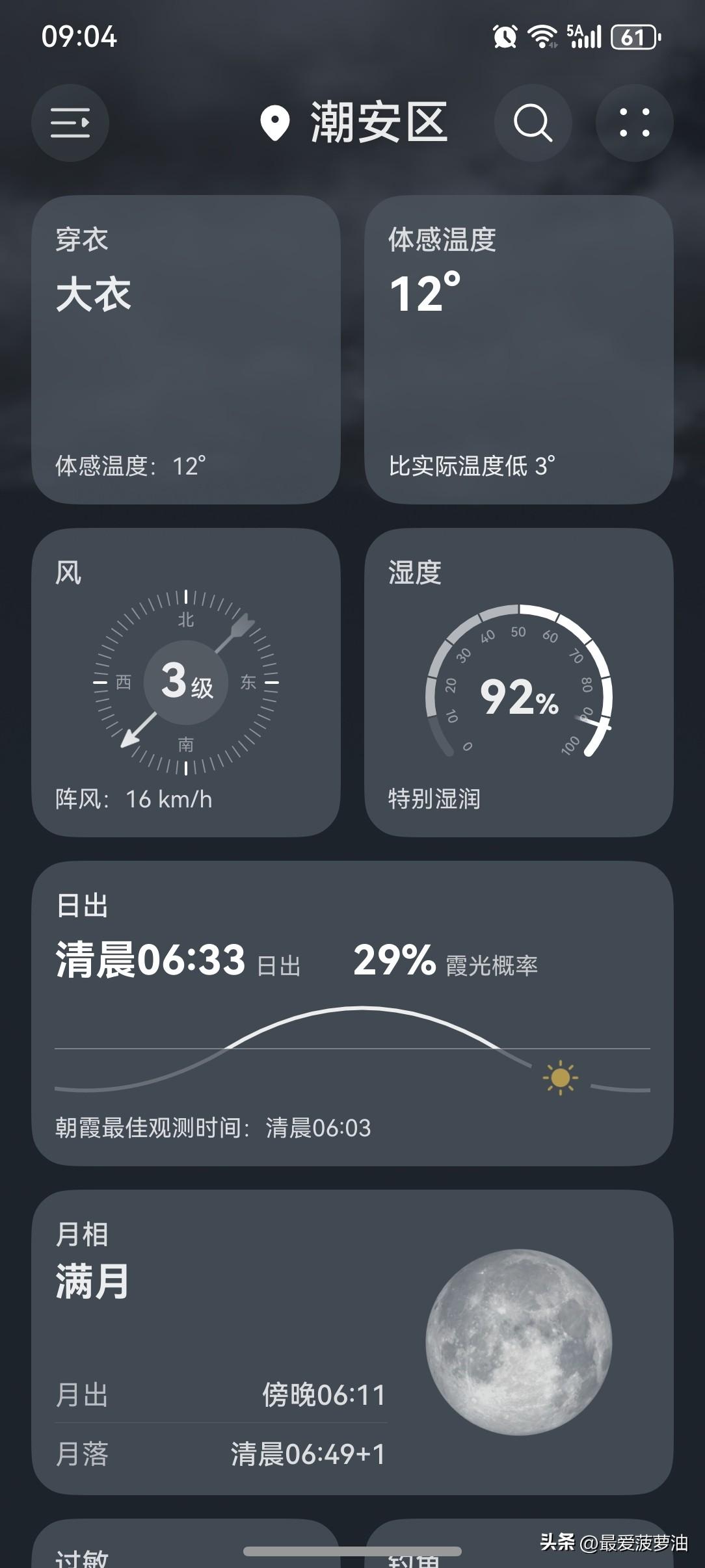 当元宵月遇到月全食,“头号天象”数十年一遇,多地直击本年度唯一月全食! 广东的元宵节只有雨水和冷空气,无缘目睹数十年一遇的“头号天象”! 明天开始,广东降雨将会逐渐减弱。5~7日,有弱冷空气补充,我省云量明显减少。 今天(3日),潮州有小雨,气温14~20℃,此刻气温15℃,体感温度12℃。 今天的天气真是一言难尽啊!早上的气温还好,大概是昨天的余温还在。随着雨水与冷空气的双重影响,气温越来越低。 今天的雨水也是时大时小,断断续续,没完没了……而就在刚刚,又是噼里啪啦地下了一场大雨。 今天是元宵佳节,别的地方都在赏月,观看月食,我们这边只有雨雨雨…… 罢了!罢了!只要能跟家人一起过元宵节,在哪过怎么过,都一样! 此刻,听着雨声与鞭炮声,看着央视元宵晚会,与家人一起欢度佳节!