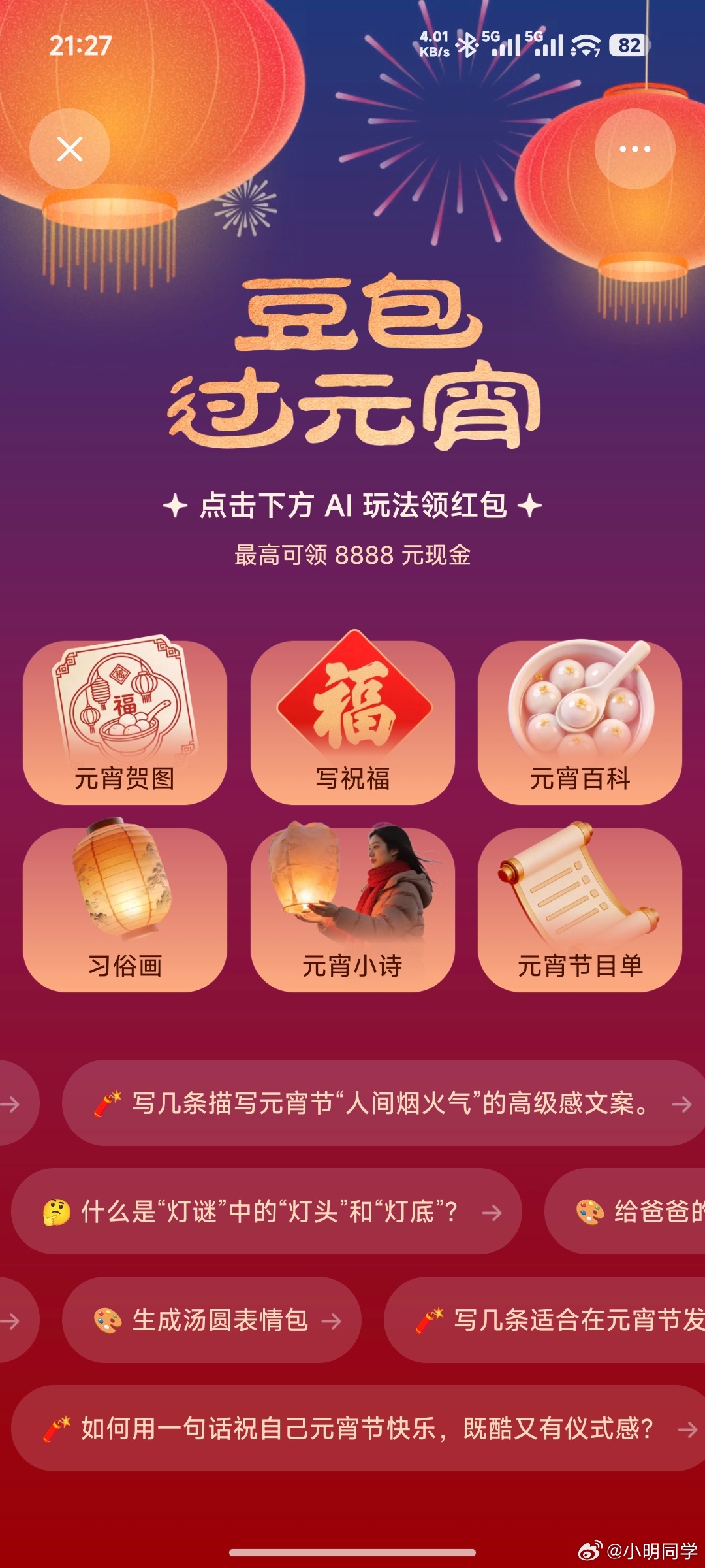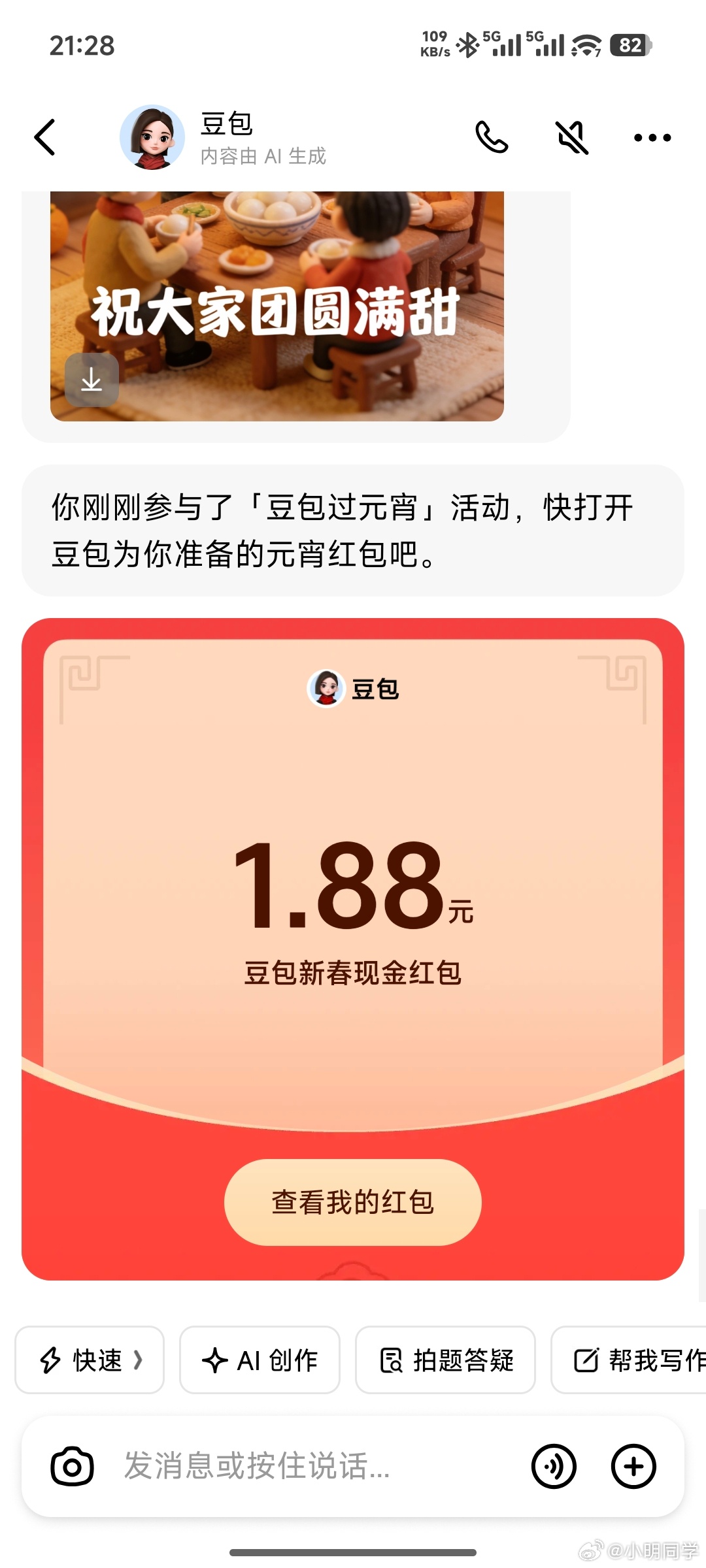 豆包红包 豆包元宵节偷偷摸摸发红包,我领了1.88元。还没领的老铁们快去