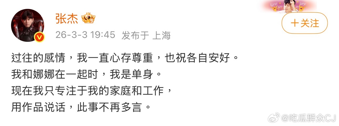 乱成一锅粥,张杰终于出来回应了和谢娜在一起的时间问题,表示确认关系的时候自己是单身。 张杰回应