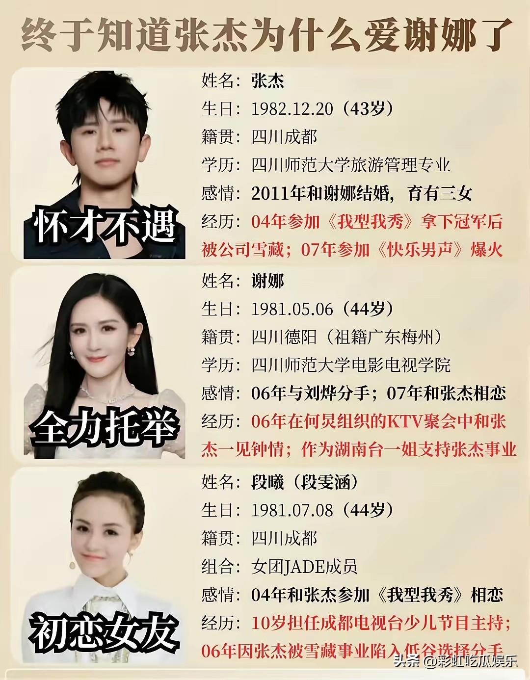 先来看时间线,06年谢娜在何老师组的局与张杰一见钟情,张杰当时有女友,段曦亲口说的经历断崖式分手。 张杰段曦也是06年分手的,然后07年张杰参加快乐男声,谢娜支持他捧红他,并且公开了恋情。 本来这事儿不计较就完了,但是谣言一直说段曦掌掴谢娜,段曦辟谣也没人信,张杰一句话可以解释得清楚,他却选择视而不见。 即使到现在他承认旧情,依然没有帮段曦辟谣,而是说他和谢娜在一起时是单身,爱到最后都那样的含金量还在上升。