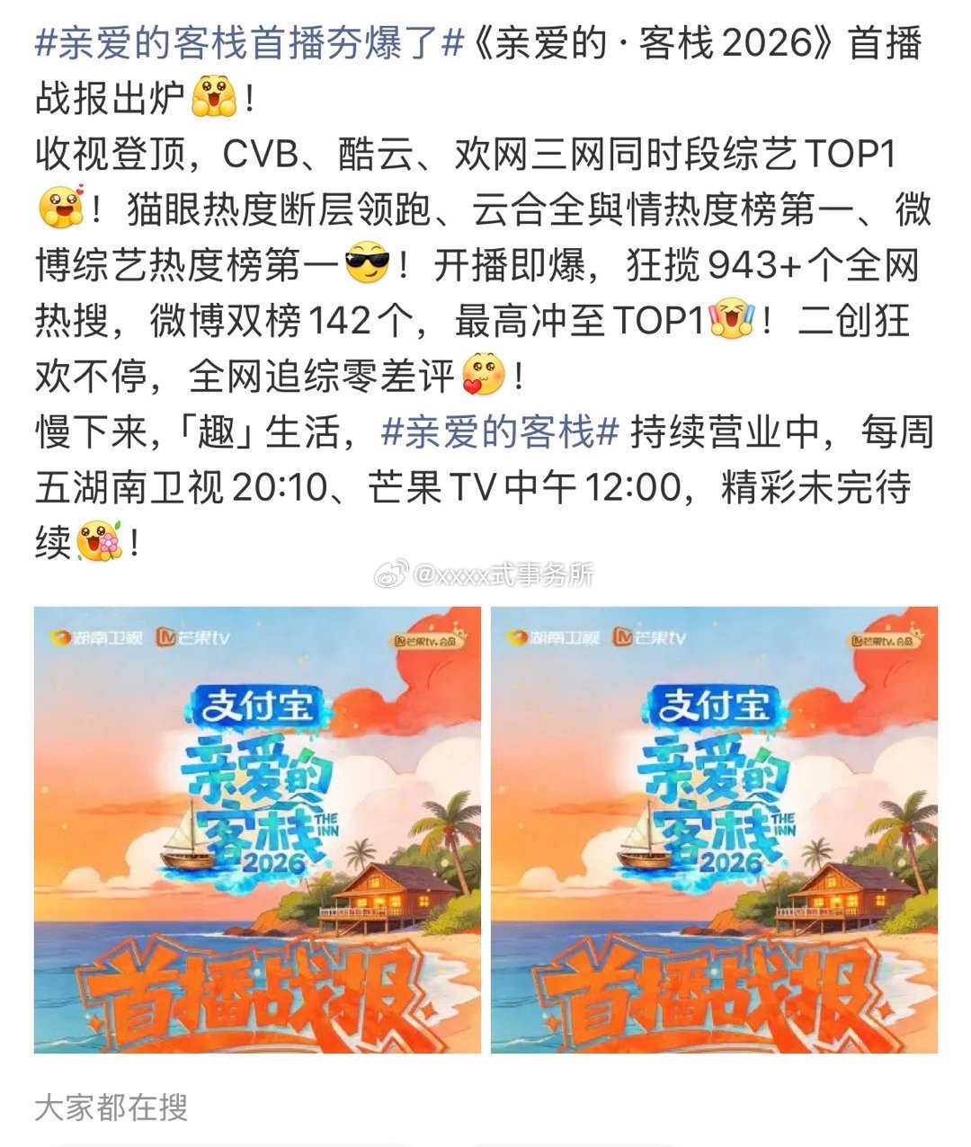 王鹤棣干一行行一行 新综艺《亲爱的客栈》首播战报,平台播放量破亿、招商、CVB、酷云、欢网三网同时段综艺TOP1,猫眼热度断层领跑、云合全與情热度榜第一、微博综艺热度榜第一