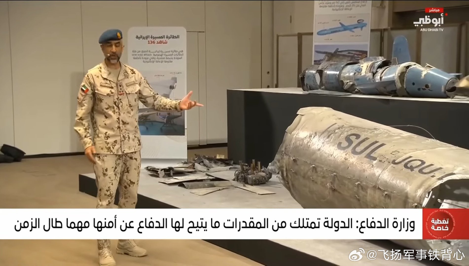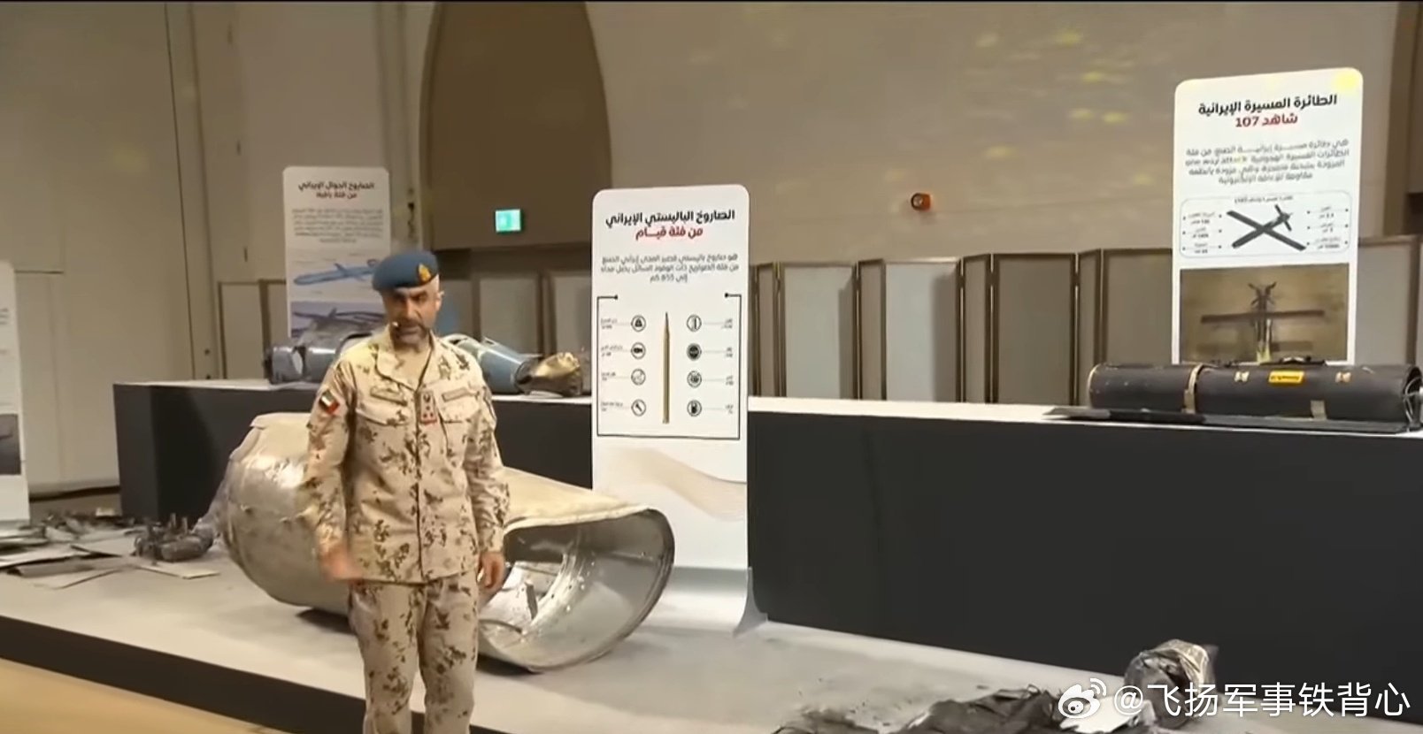阿联酋国防部展示了近期成功拦截的伊朗导弹和无人机的残骸与碎片。展品包括“见证者-136”和“见证者-107”无人机,以及Qaim短程弹道导弹(SRBM)和Paveh远程巡航导弹。烽火问鼎计划美伊以冲突
