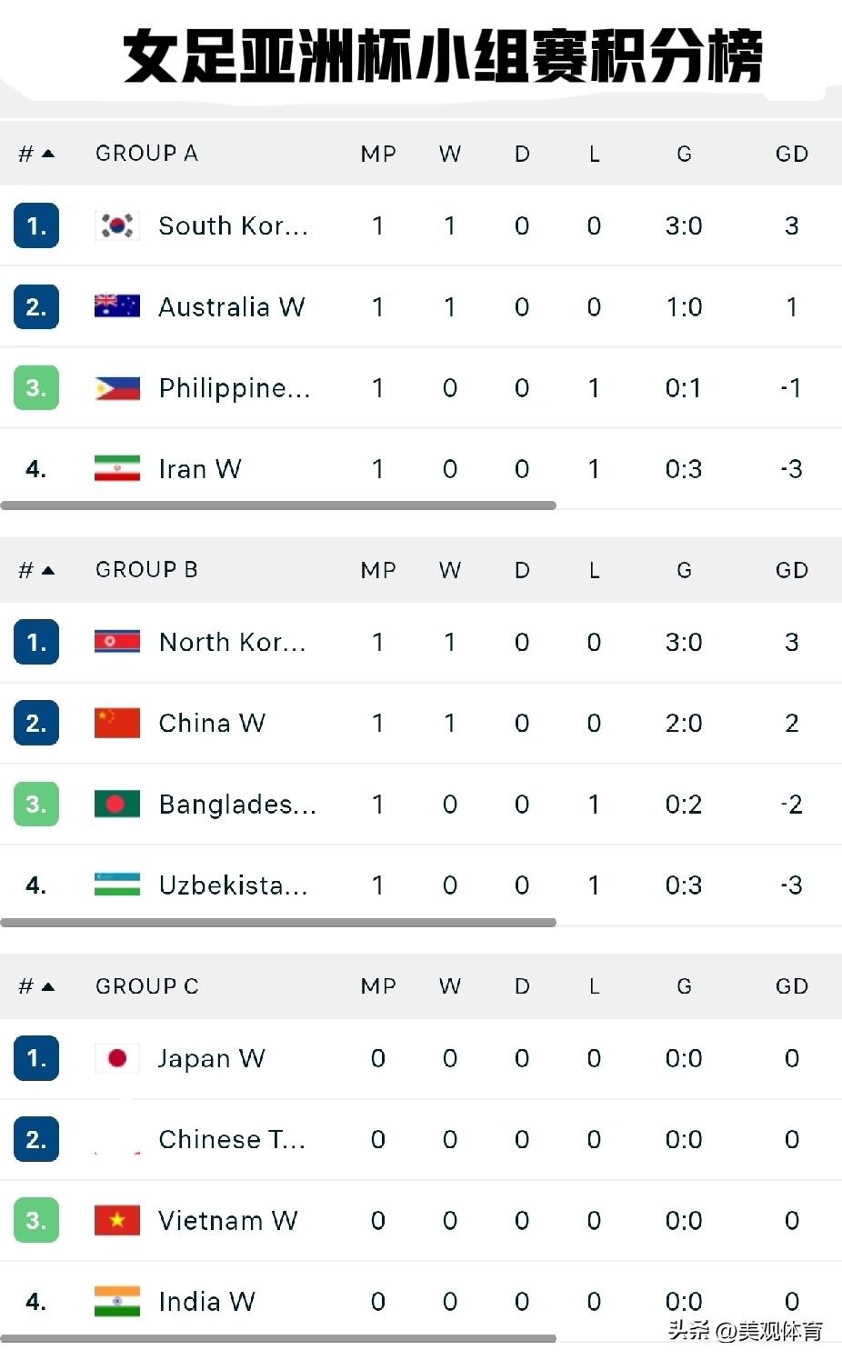 女足亚洲杯小组赛积分榜 女足亚洲杯小组赛分为三个组 A组:韩国🇰🇷澳大利亚🇦🇺菲律宾🇵🇭伊朗🇮🇷 B组:朝鲜🇰🇵中国🇨🇳孟加拉国🇧🇩乌兹别克斯坦🇺🇿 C组:日本、中国台北、越南🇻🇳印度🇮🇳 每组前两名,及两个成绩较好的第三名,共计8支球队进入前八名淘汰赛。
