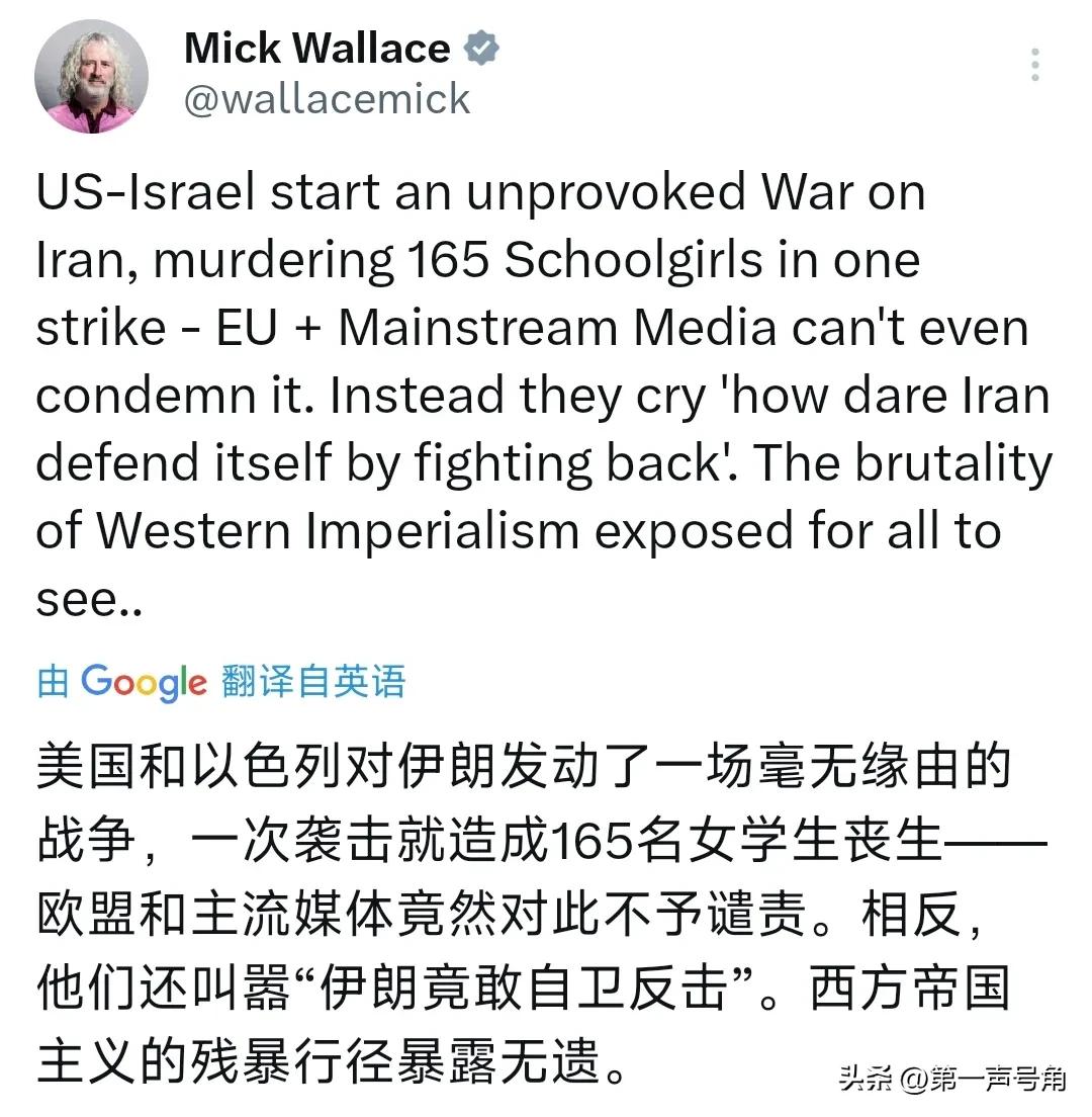 前欧洲议会议员米克·华莱士今天(北京时间3月3日)写道:“美国和以色列对伊朗发动了一场毫无缘由的战争,一次袭击就造成165名女学生丧生欧盟和主流媒体竟然对此不予谴责。相反,他们还叫嚣‘伊朗竟敢自卫反击’。西方帝国主义的残暴行径暴露无遗。” 评几句 米克·华莱士的这条推文,堪称一记重锤,砸在西方舆论精心编织的道德伪装上。 第一,数字背后的血腥真相令人窒息。 165名女学生,不是冰冷的统计数字,而是一个个鲜活的生命,是教室里的书声琅琅被爆炸声撕裂的惨状。当"人权卫士"们面对加沙的废墟尚且能找出各种借口时,面对女学生的鲜血竟集体失语,这种选择性失明本身就是对人权理念的最大嘲讽。 第二,"伊朗竟敢自卫"的强盗逻辑昭然若揭。 西方某些势力早已习惯了单向度的暴力美学——我可以打你,但你不能还手;我可以轰炸你的学校,但你反击就是"挑衅"。这种只许州官放火、不许百姓点灯的霸权思维,把国际法践踏成了强权的遮羞布。 第三,华莱士的勇敢在于戳破了"西方价值观"的泡沫。 当欧盟和主流媒体在俄乌冲突中高呼"主权神圣不可侵犯"时,面对美以的越境军事行动却默契地保持"战略沉默"。这种双标不是疏忽,而是根深蒂固的帝国主义傲慢——在他们眼中,中东人的生命权重似乎永远低于地缘政治算计。 华莱士作为欧洲议会前议员,本可在退休后的安逸中选择沉默,但他选择站在良知一边。这种跨越党派的道义勇气,正是当下欧洲政坛最稀缺的品质。他的发声提醒我们:真正的反战不是选择性反战,真正的人权不是工具化人权。当西方媒体忙着给侵略行为"去道德化"时,华莱士的质问如同一面照妖镜,让那些满嘴"基于规则的国际秩序"的政客们无所遁形。 历史终将证明,在强权与公理的对峙中,敢于说出真相的人,才是真正的文明守护者。