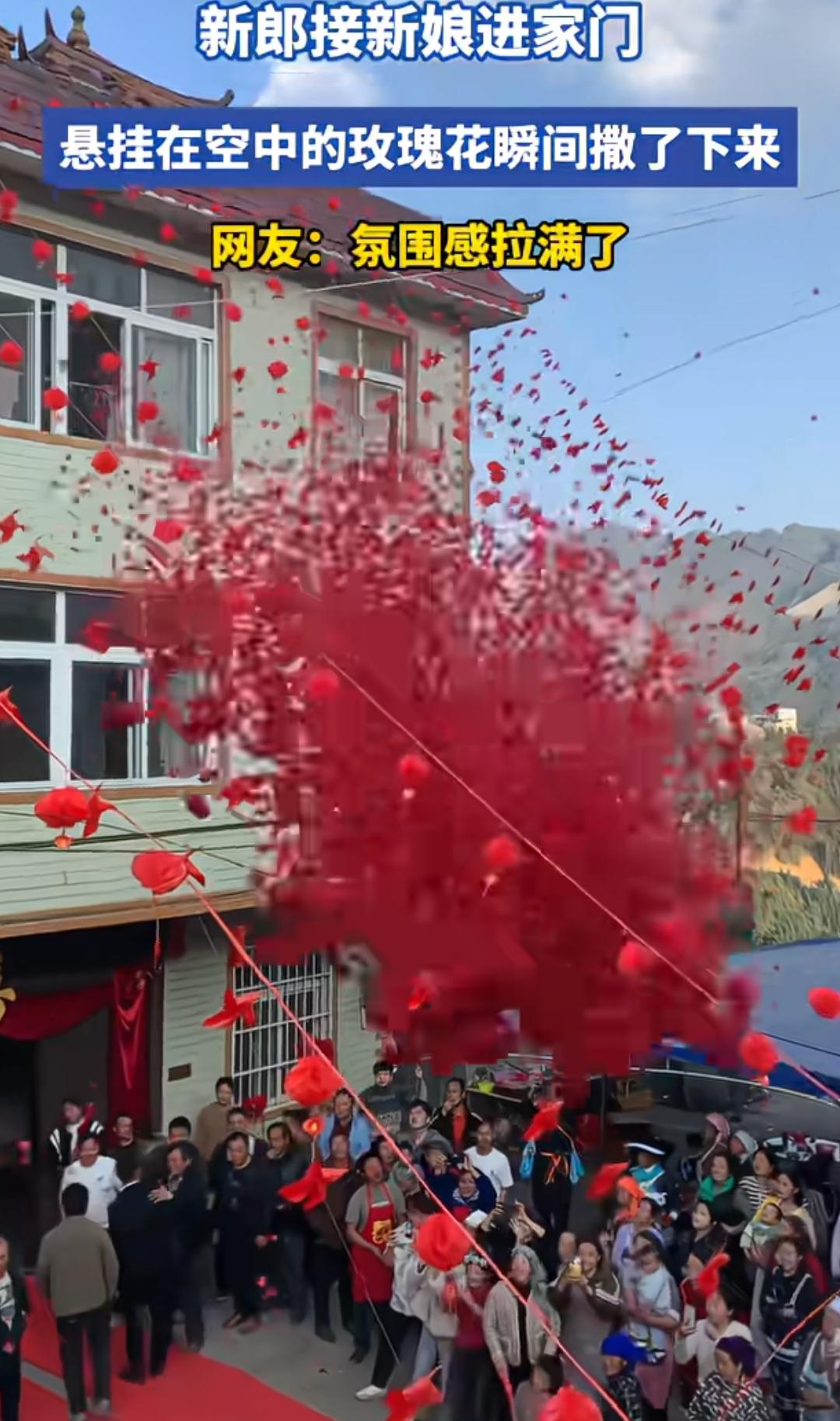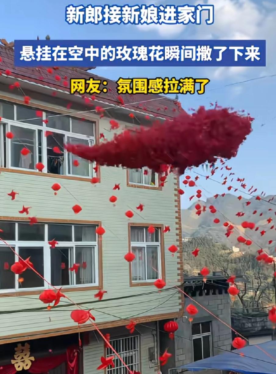 别人是下满天花雨,唯美又浪漫。 他们是砸下花海啊,太沉重了! 这悬挂在空中的玫瑰花,没三十斤,也有二十斤吧。这猛的砸下来,有种泰山压顶的感觉,伞都顶不住了。 还不如让几个人到楼上撒下来,再搬台鼓风机,有点风,玫瑰花慢慢飘下来更浪漫,更有意境感。 不过新郎家还是很浪漫的,就是细节没考虑到位,问题不大,氛围感还是拉满了。 祝新人新婚快乐!百年好合!