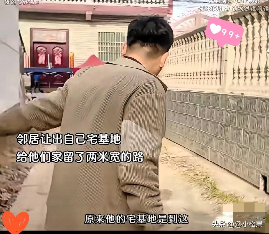 积善之家必有余庆,这位邻居的做法,真的太让人破防了! 男子常年在外打工,过年回家才发现邻居盖了新房,非但没挤占道路,还主动让出自家宅基地,给他们家留了两米宽的出行路。 他带着礼物上门感谢,邻居说什么都不肯收。不图名不图利,只是发自内心地替别人着想。 如今看多了为一墙之地、一点道路争得面红耳赤的,这样主动给人留方便的邻居,实在难得。这不是傻,是刻在骨子里的善良和大格局。 老话说远亲不如近邻,真正的人情味,从来不是嘴上说得好听,而是遇事时肯为你多让一步。
