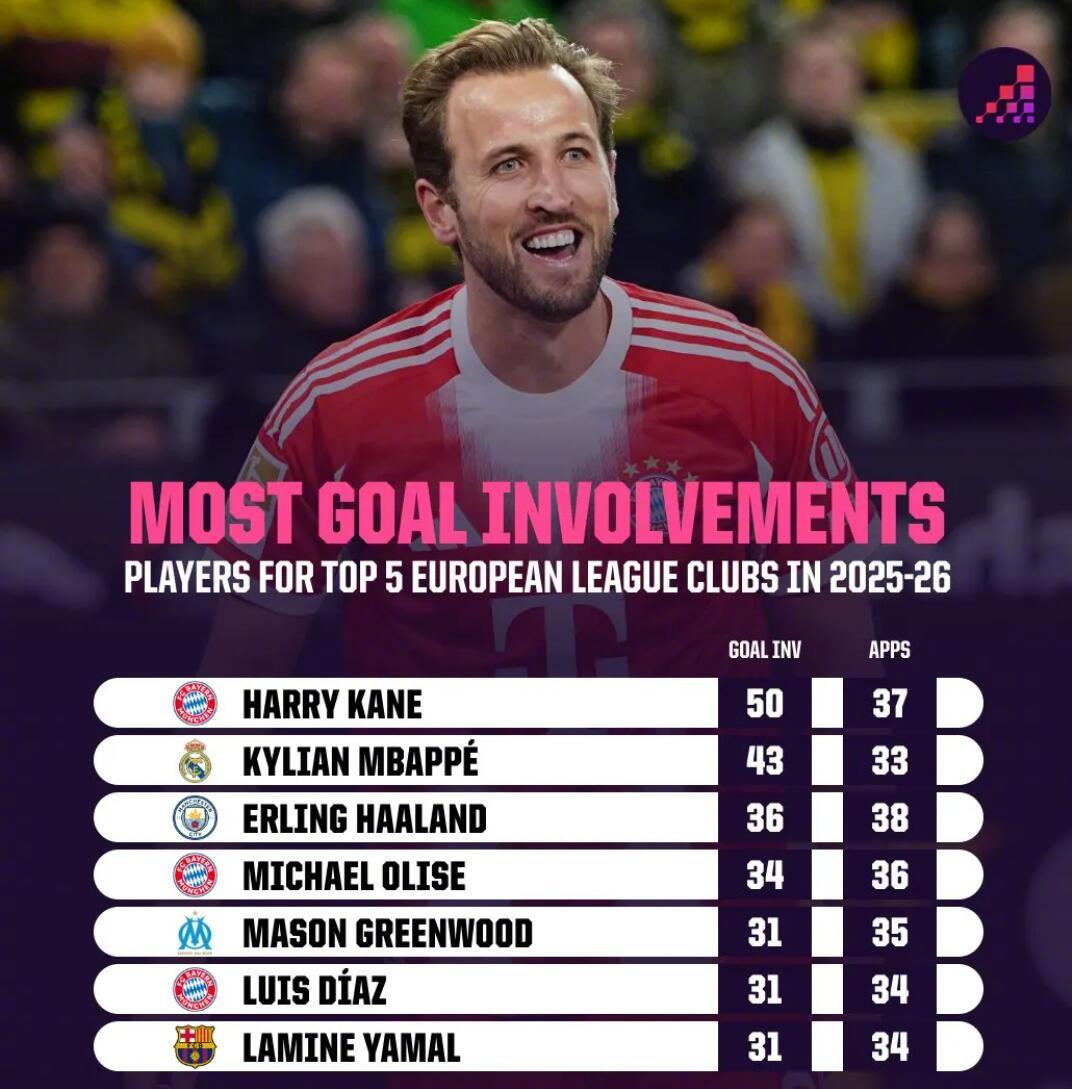 著名统计机构OPTA日前公布了本赛季五大联赛参与进球数最多的球员排行,凯恩50球居首,姆巴佩哈兰德紧随其后。具体榜单如下。