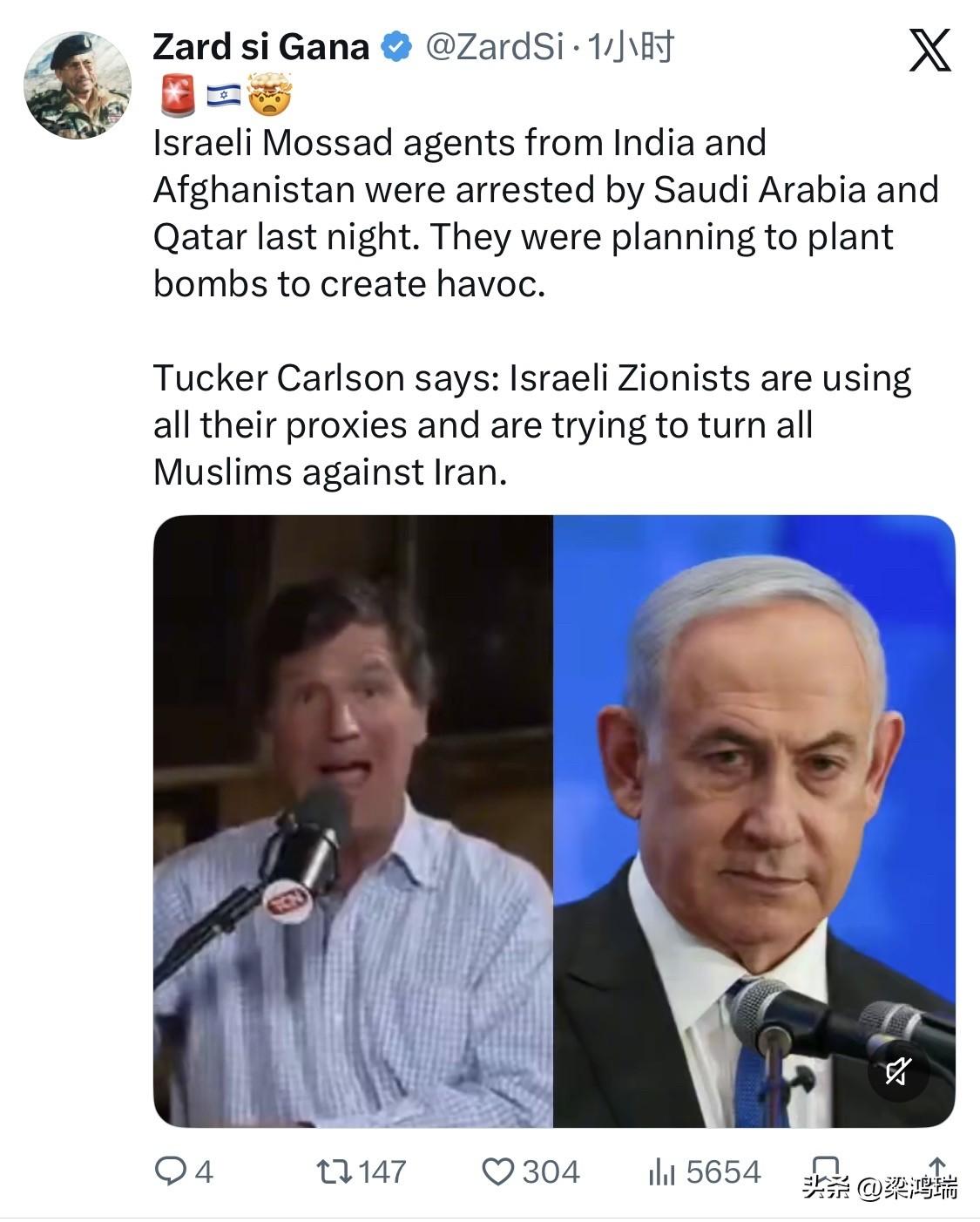 昨晚,沙特阿拉伯和卡塔尔逮捕了来自印度和阿富汗的以色列摩萨德特工。他们计划安放炸弹制造混乱。 塔克·卡尔森说:以色列犹太复国主义者正在利用所有代理人,试图挑拨所有穆斯林与伊朗的关系。